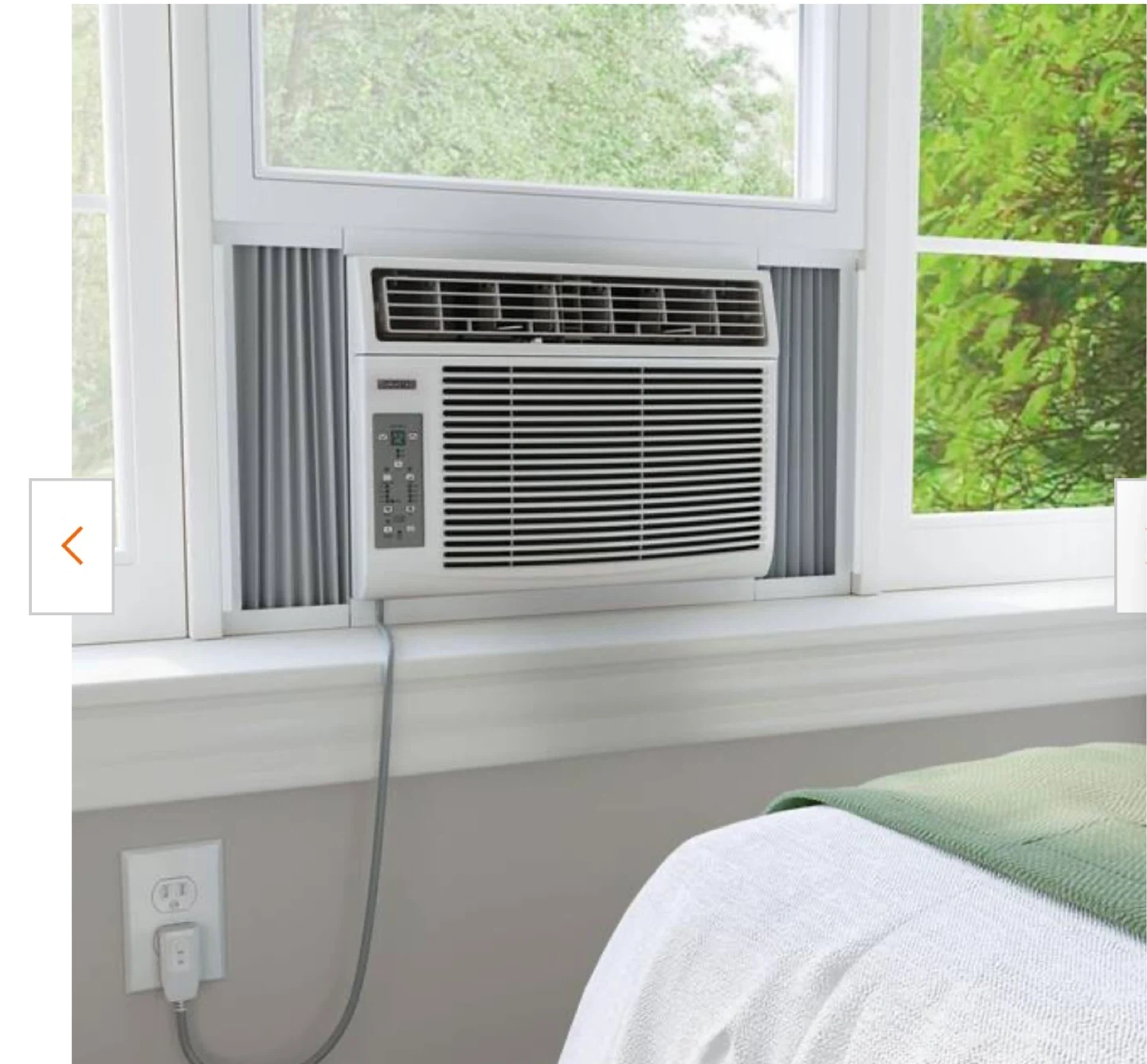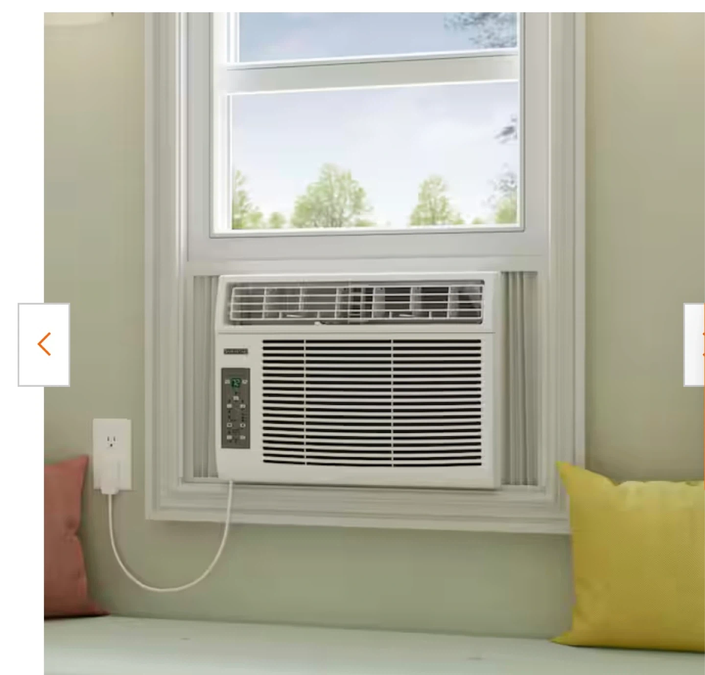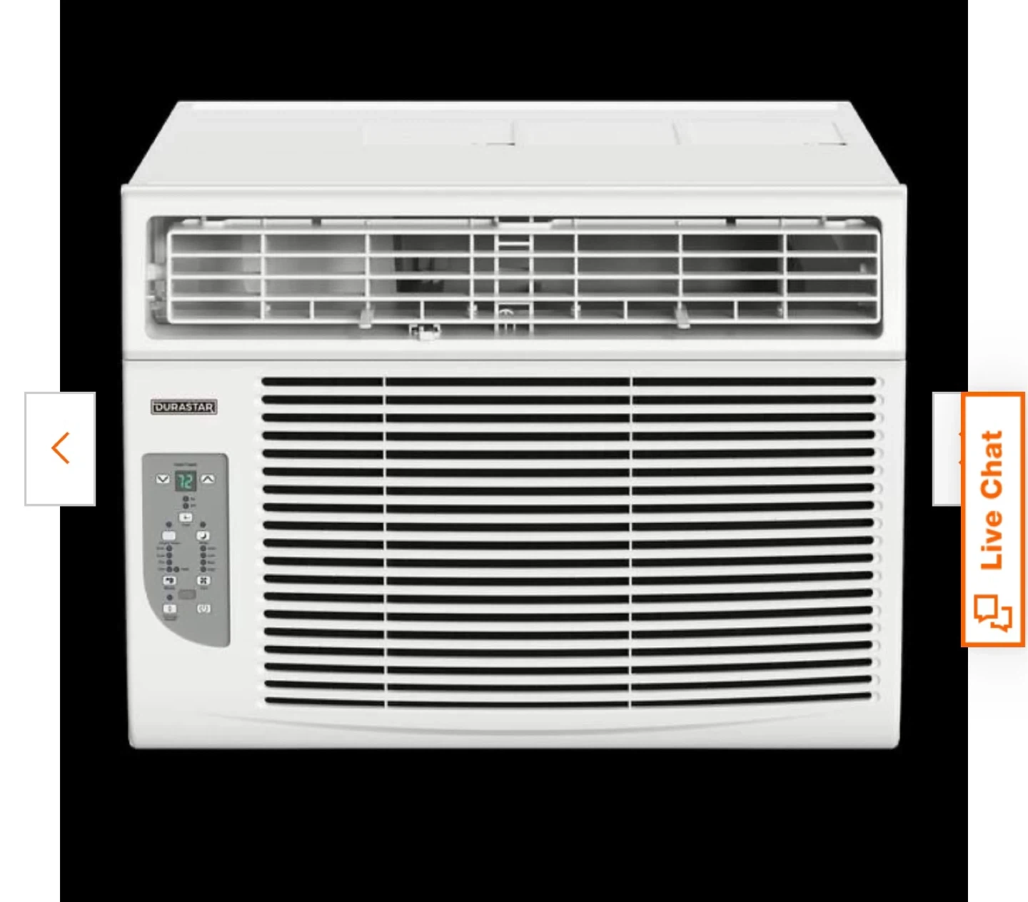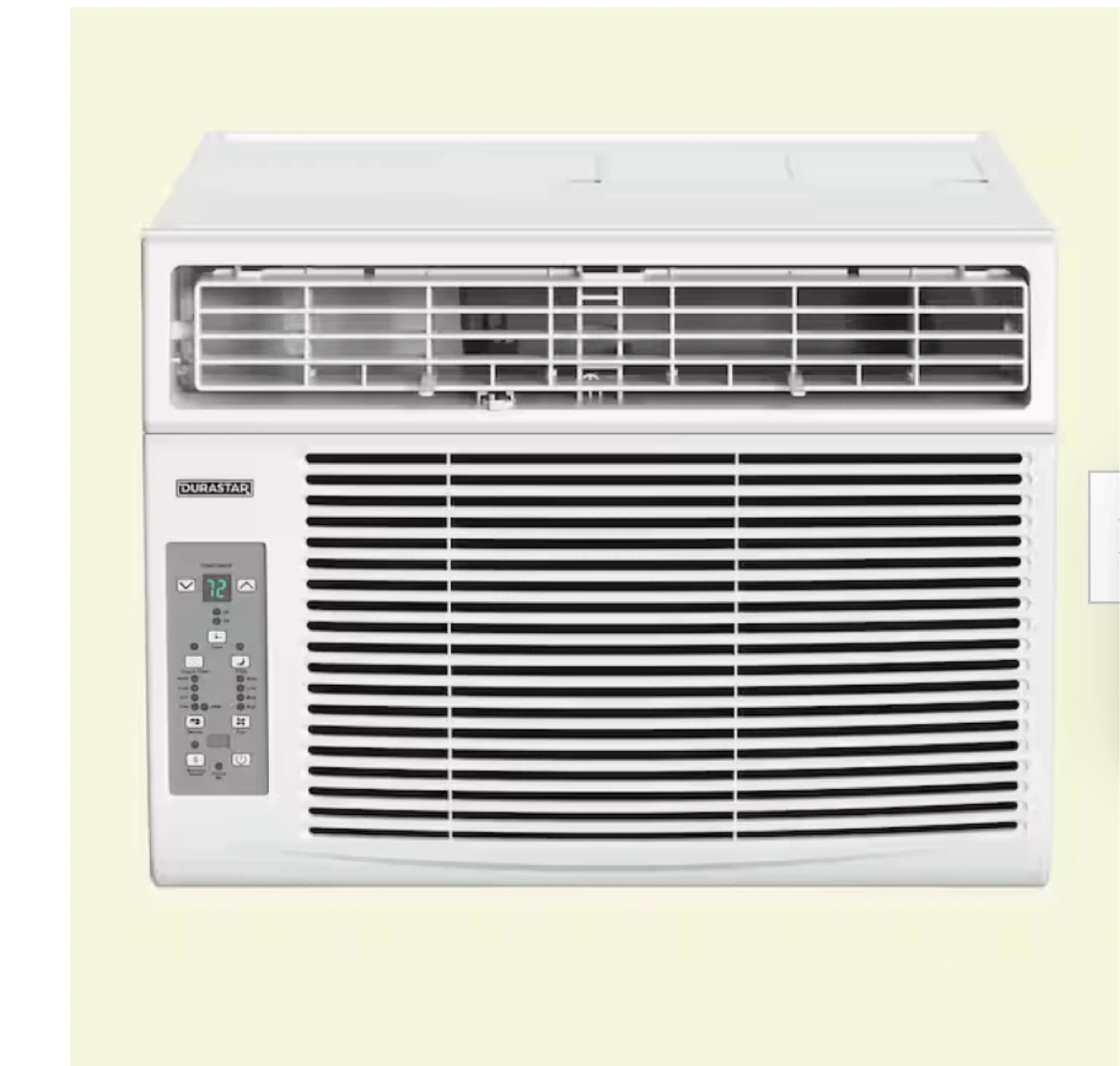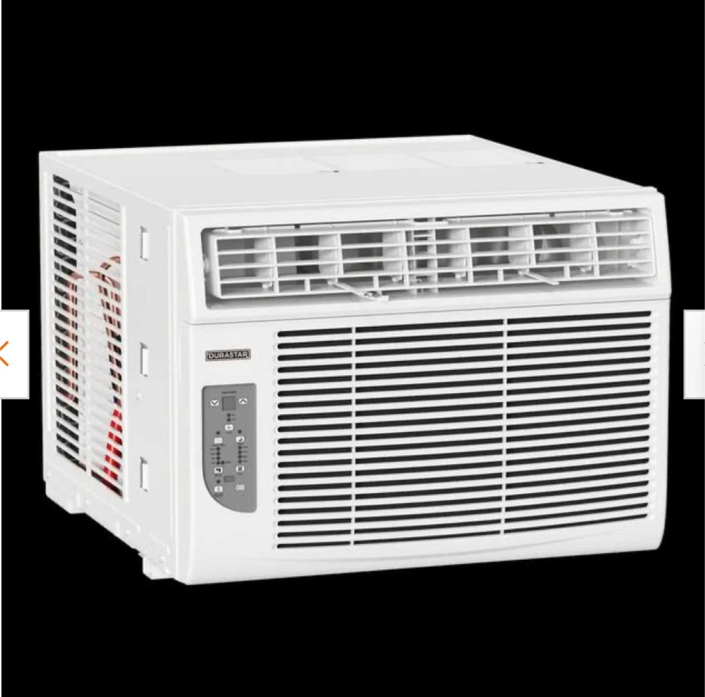 This is a Durastar window air conditioner. It's white and includes a control panel with digital display. Unit fits in a standard window frame.