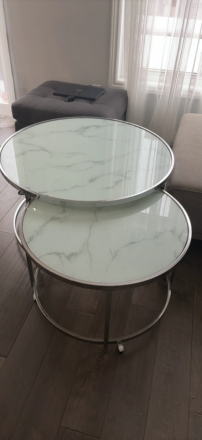 This set includes two nesting coffee tables with white marble-patterned tops and chrome metal frames. The larger table fits neatly under the smaller one for space-saving. There's some minor chipping on the edges of the larger table's top.