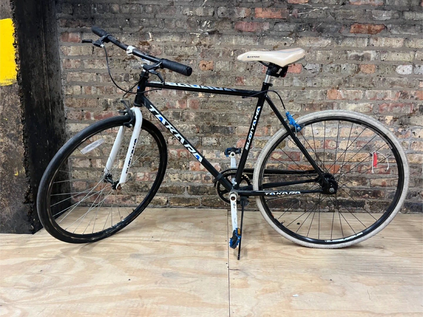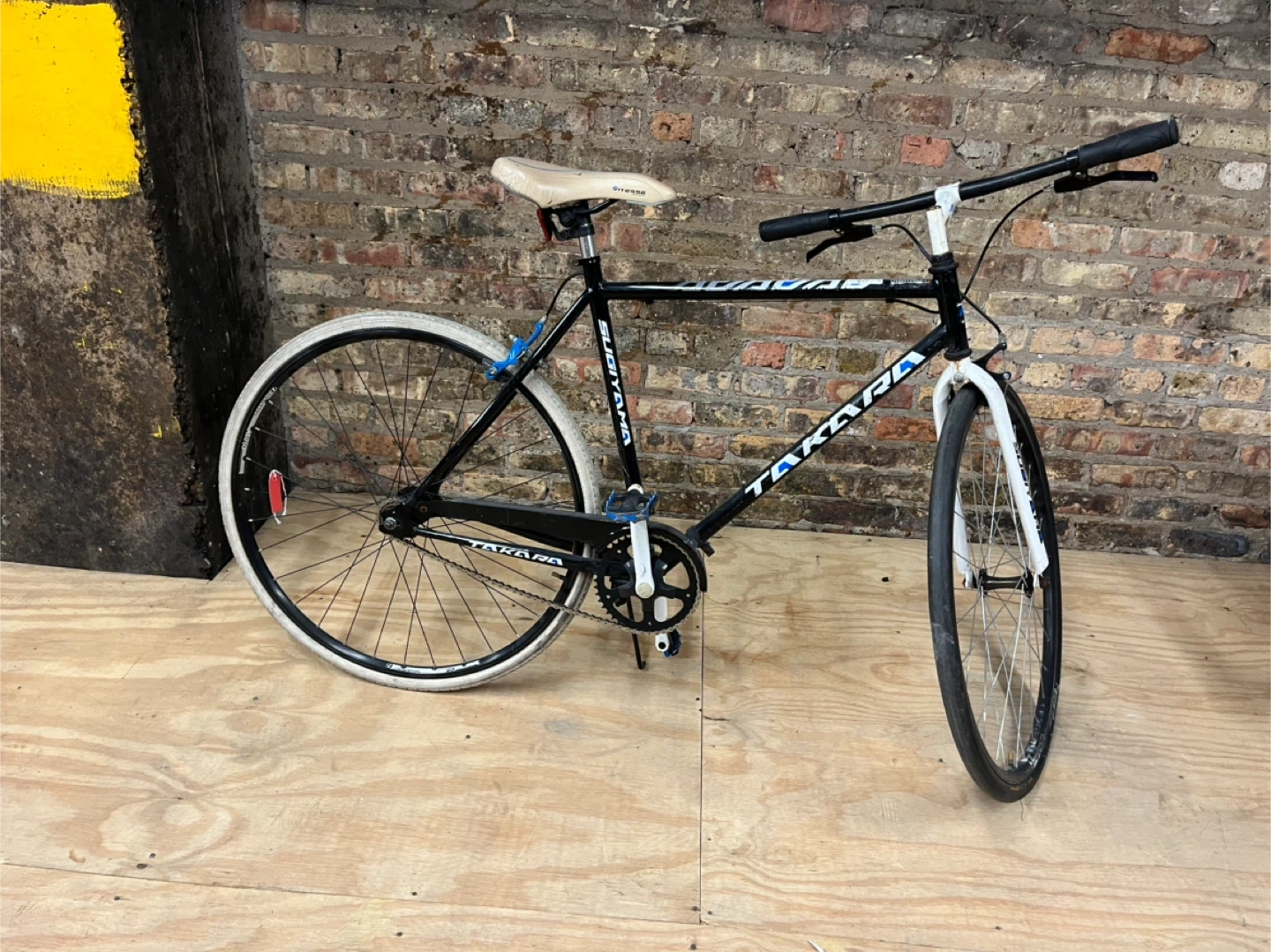 This is a Takara Fuji-yama fixed gear bicycle. It's black with white accents on the front fork and handlebars. The bike has a light-colored saddle and white tires.