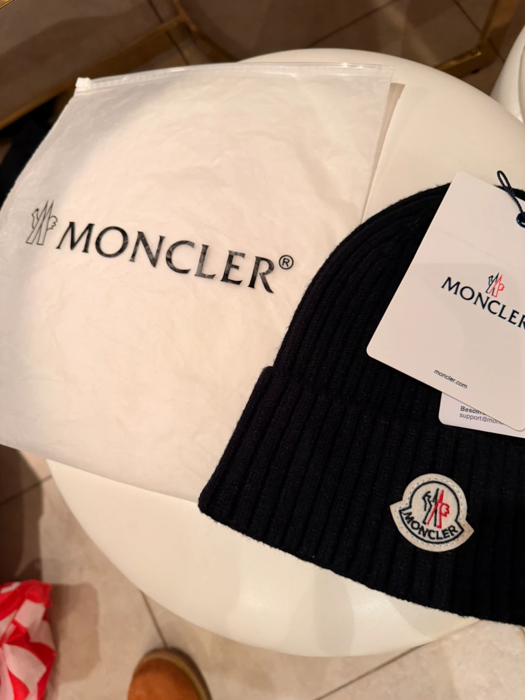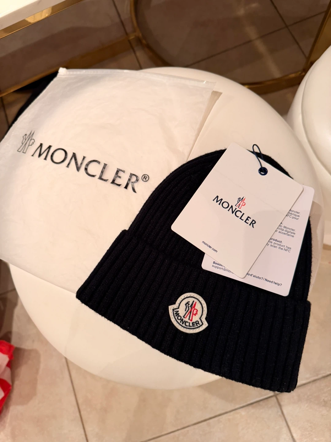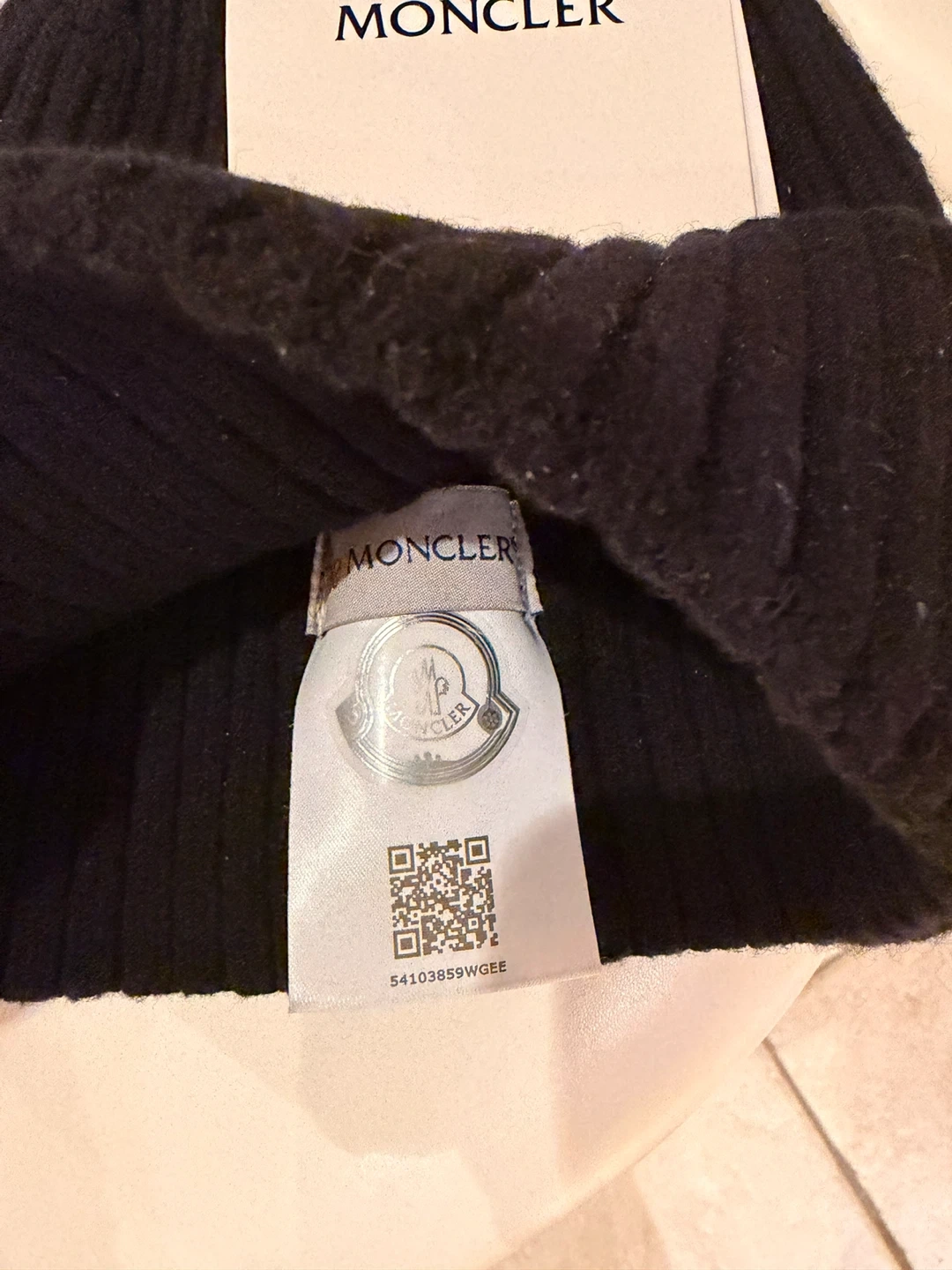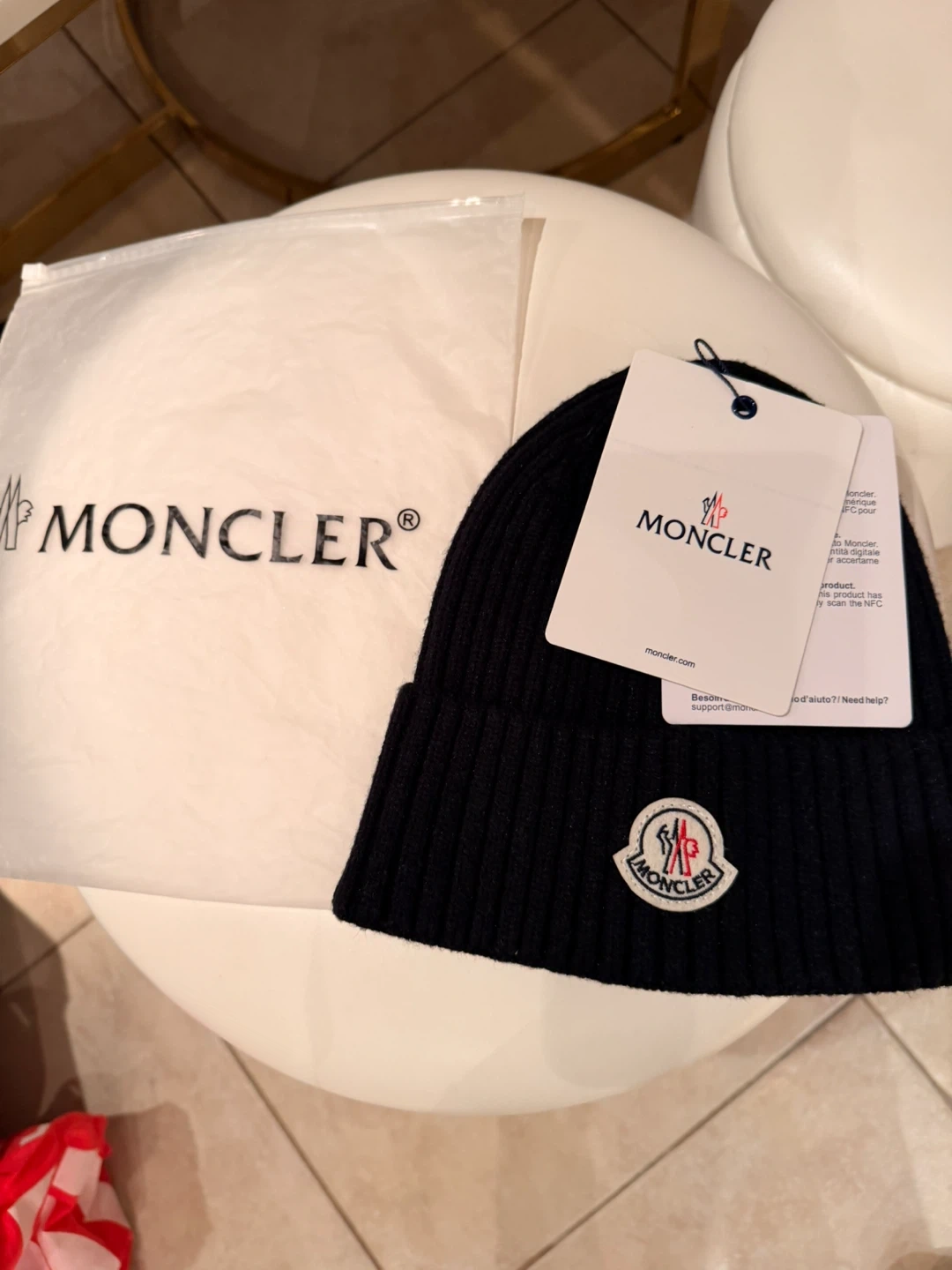 Selling a Moncler beanie in black. It's in great condition and ready to keep you warm! The classic Moncler logo is prominently displayed. Perfect for the cold weather