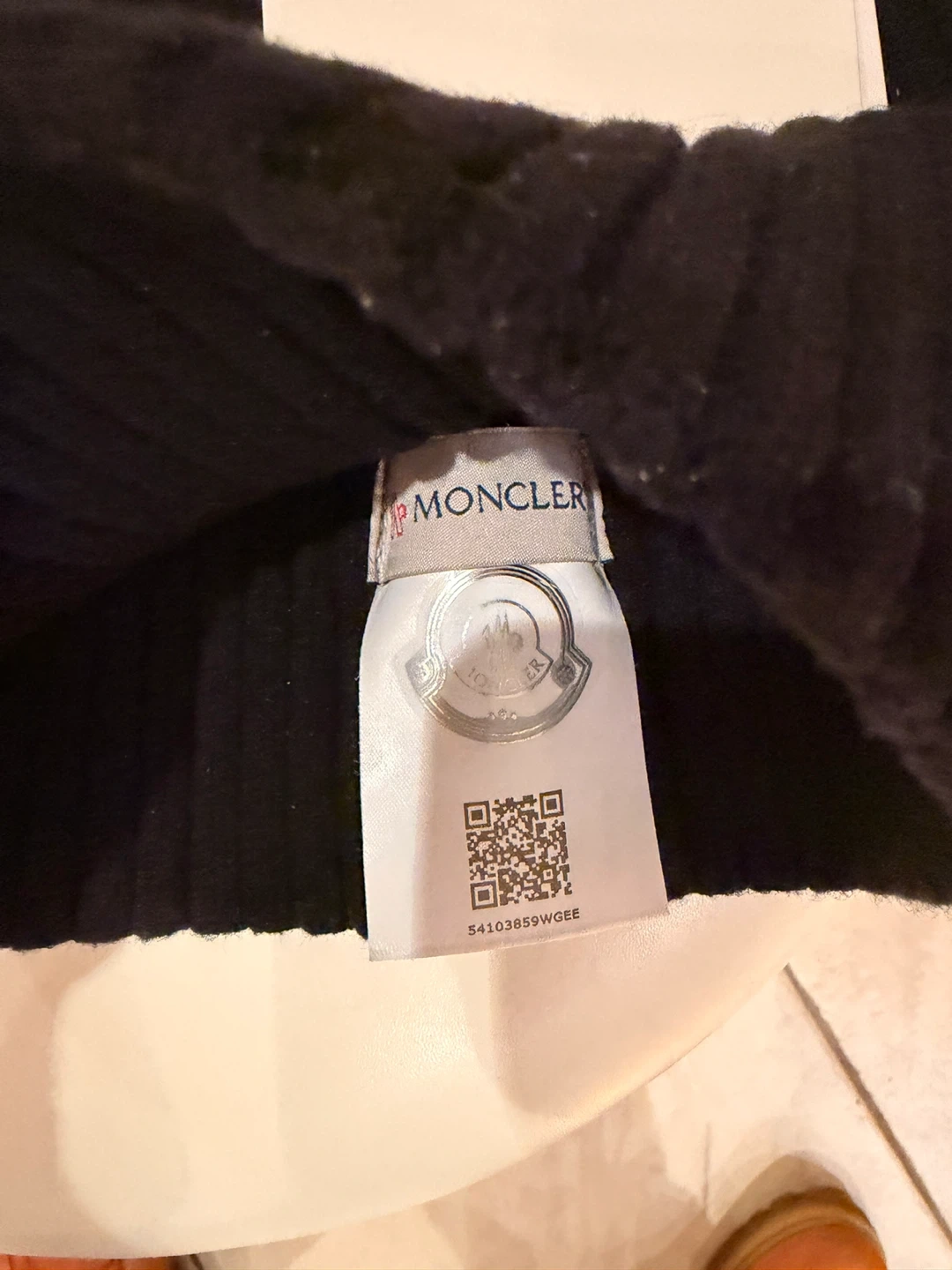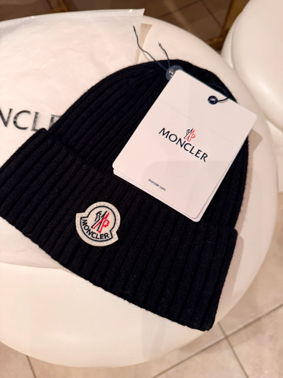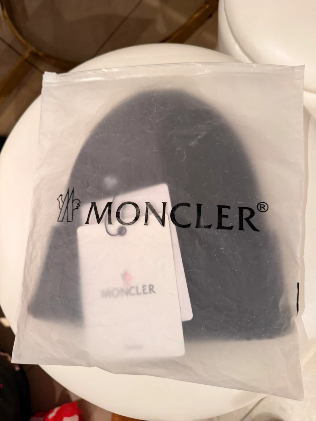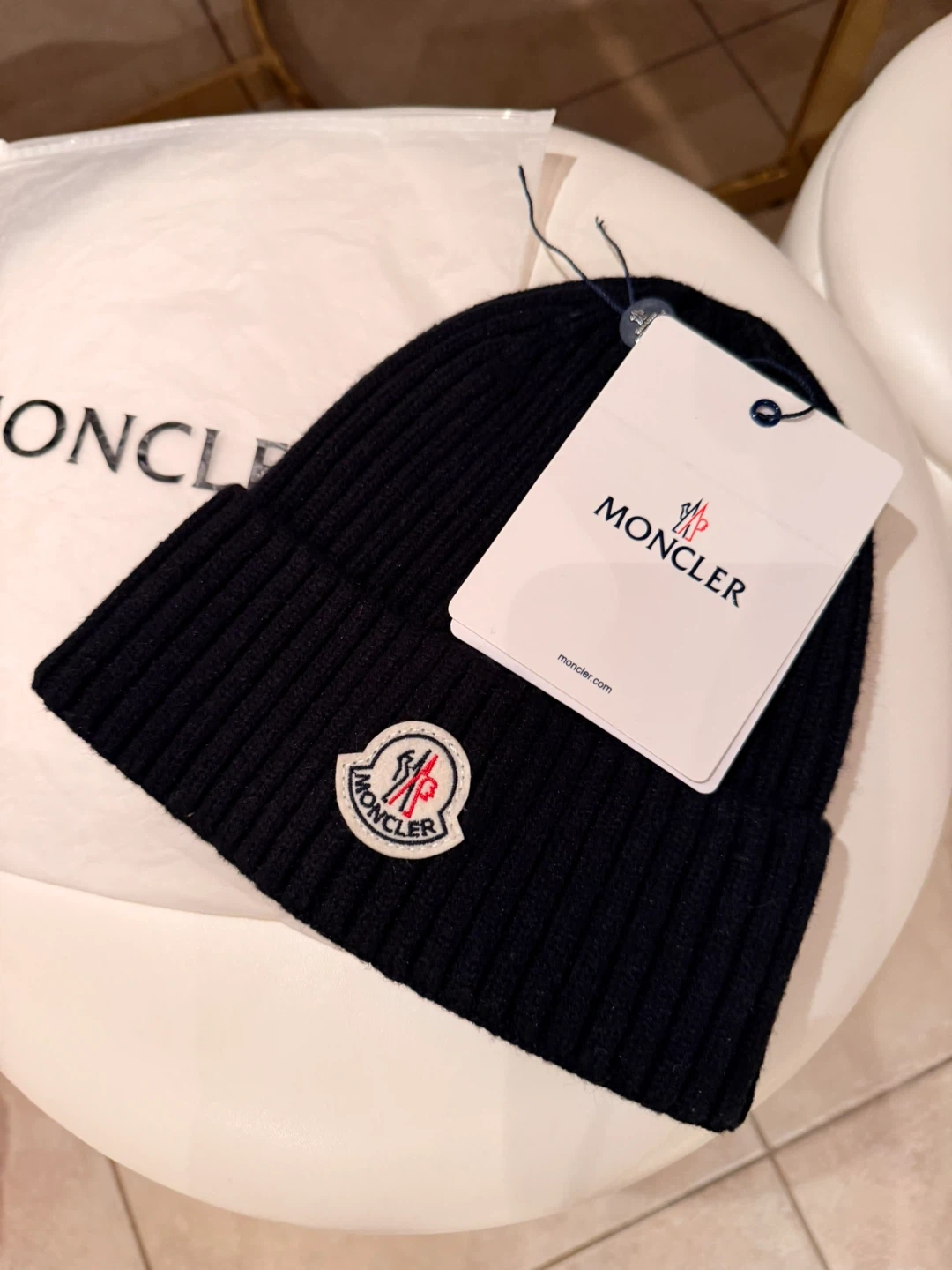 Selling a Moncler beanie in black. It's in great condition and ready to keep you warm! The classic Moncler logo is prominently displayed. Perfect for the cold weather