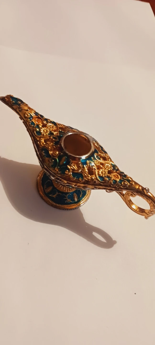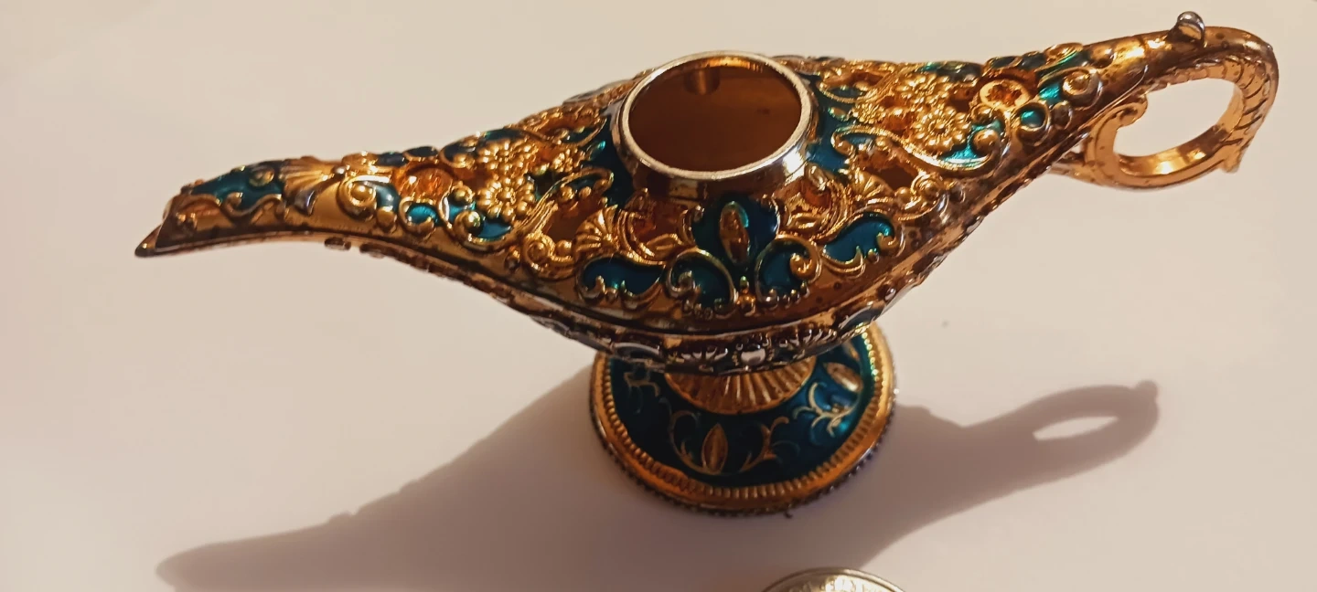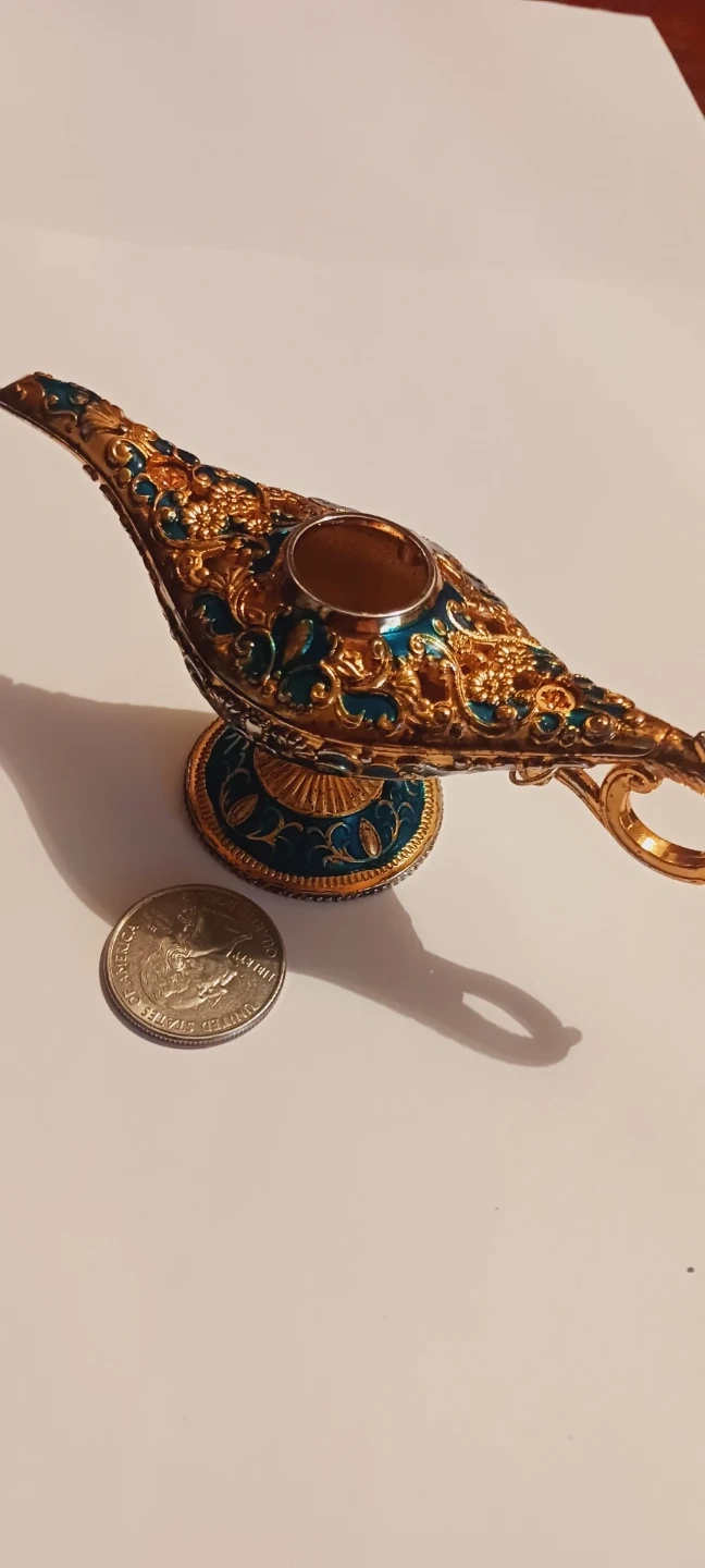 This is a decorative Aladdin genie lamp. It's made of metal with ornate gold and teal detailing. A great piece for display! 5"×2". ALL MY PRICES ARE NEGOTIABLE.
