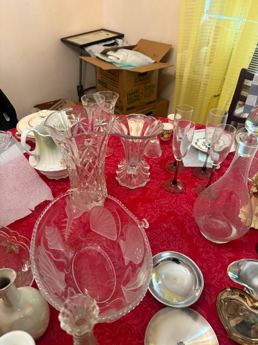 Elegant crystal glassware. Includes various vases, a unique etched bowl, and several stemmed glasses. Perfect for entertaining or adding a touch of class to your home.