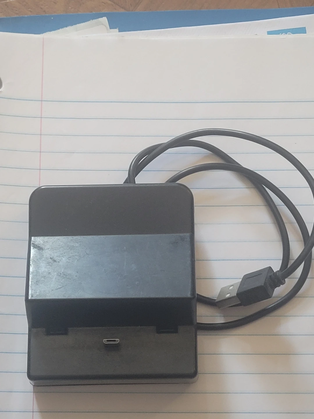 This is a black charging dock station. It features a USB-C port for charging. Includes a USB cable.
