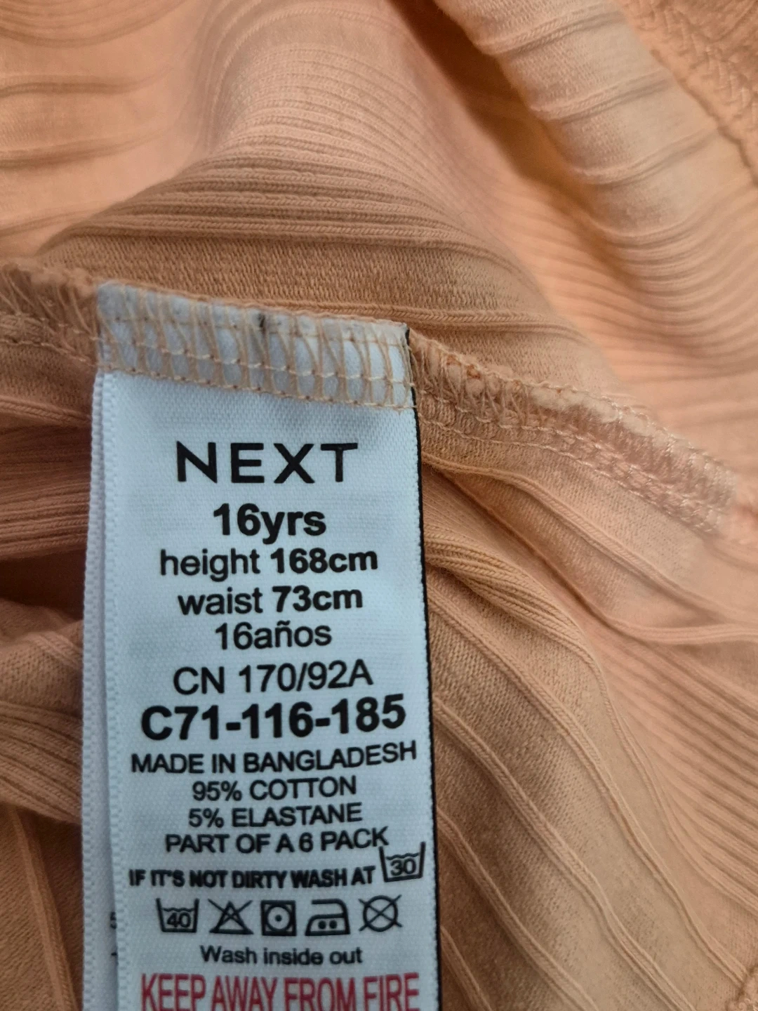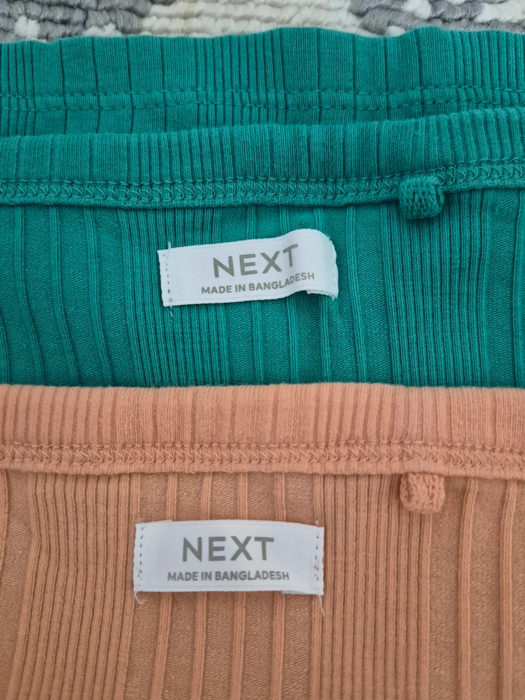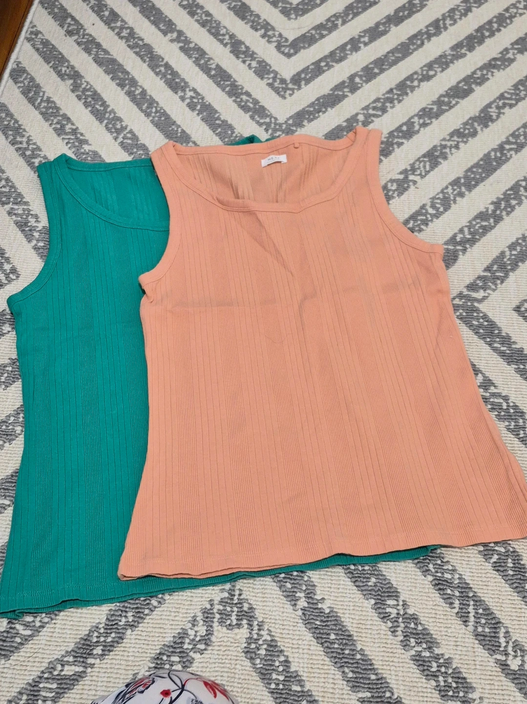 Two ribbed tank tops from Next, one in peach and one in teal. Both are size 16 years and made of 95% cotton and 5% elastane. Perfect for layering or warm weather! More like a size M.