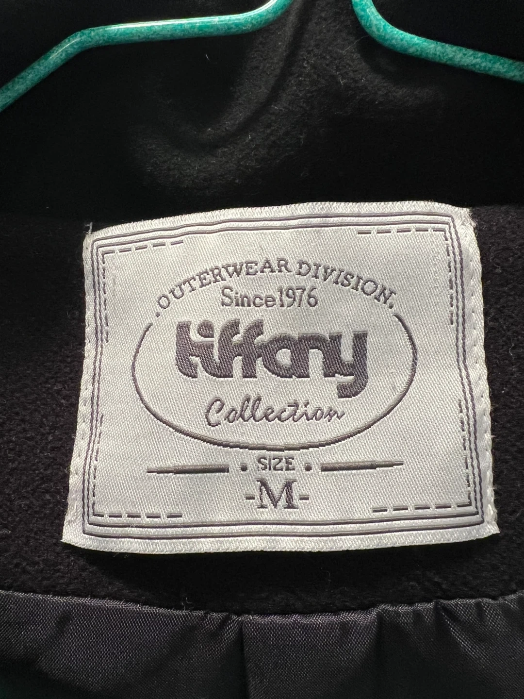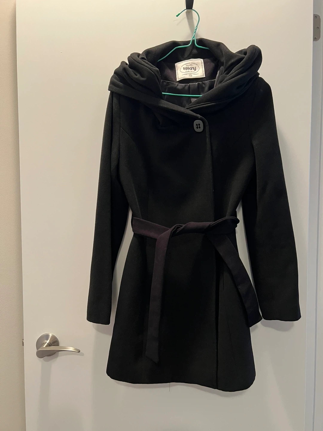 Black hooded coat from Tiffany Collection. It's a size medium and includes a matching belt. This coat is from the Outerwear Division, established since 1976.