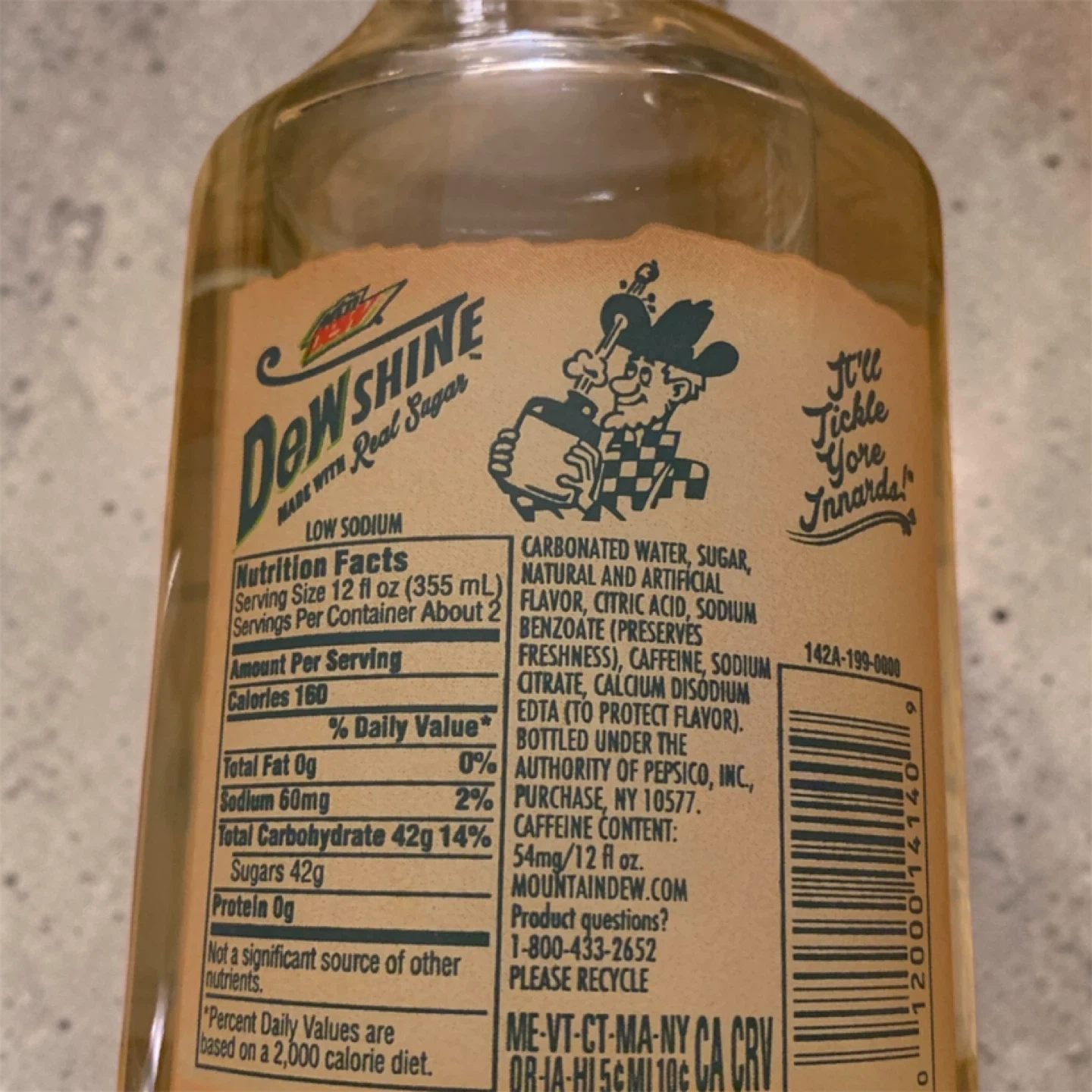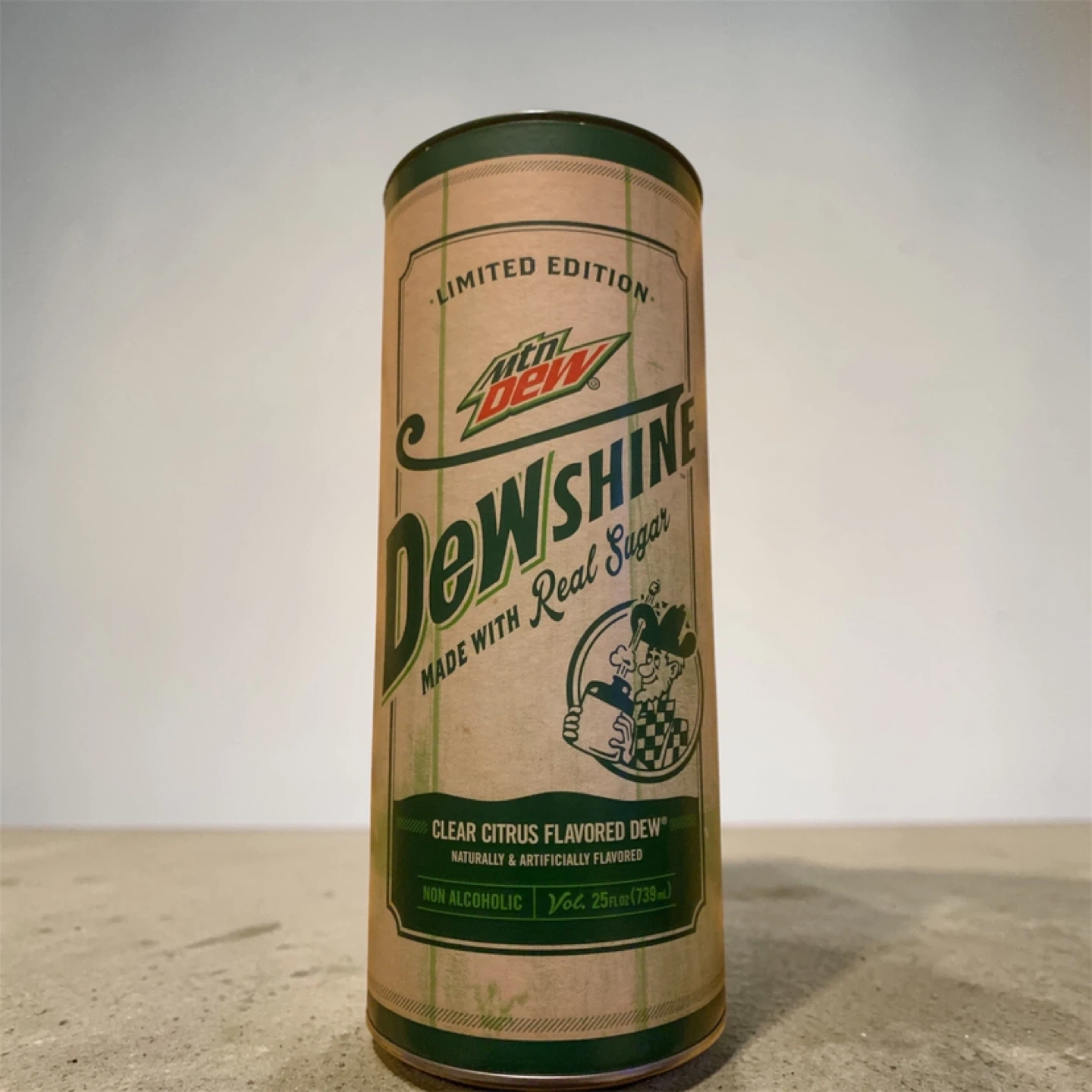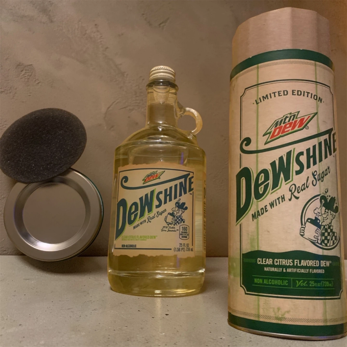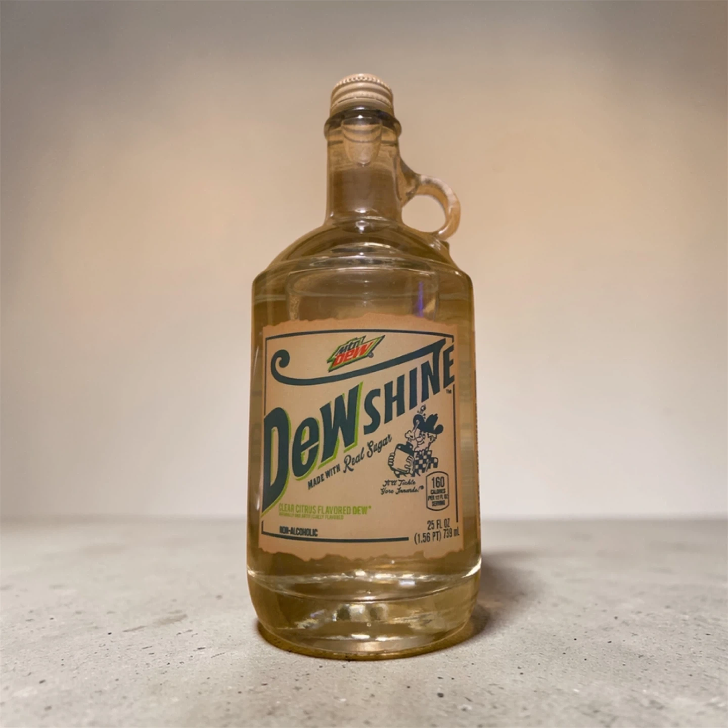 This is a limited edition Dewshine from Mountain Dew. It's a clear citrus flavored soda made with real sugar. It's non-alcoholic and comes in a 25 fl oz (739 mL) bottle. Perfect for collectors!