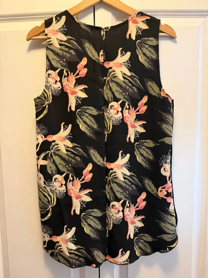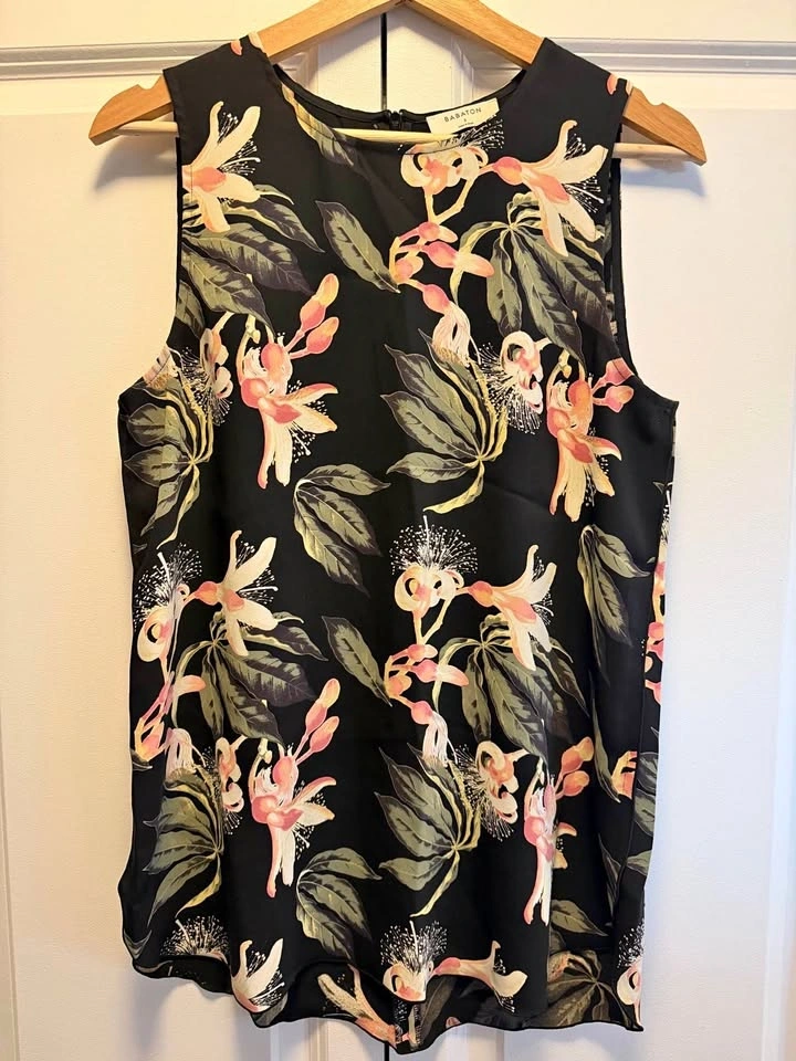 Aritzia Babaton shell tank in black with a tropical floral print. It's well made and can be worn tucked or untucked.