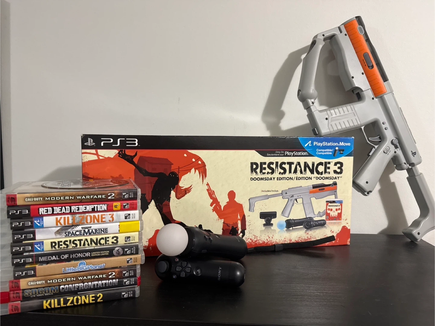 This bundle includes a Sony PlayStation 3 console. It comes with the game "Resistance 3 Doomsday Edition" and a PlayStation Move controller. A stack of other PS3 games are also included.