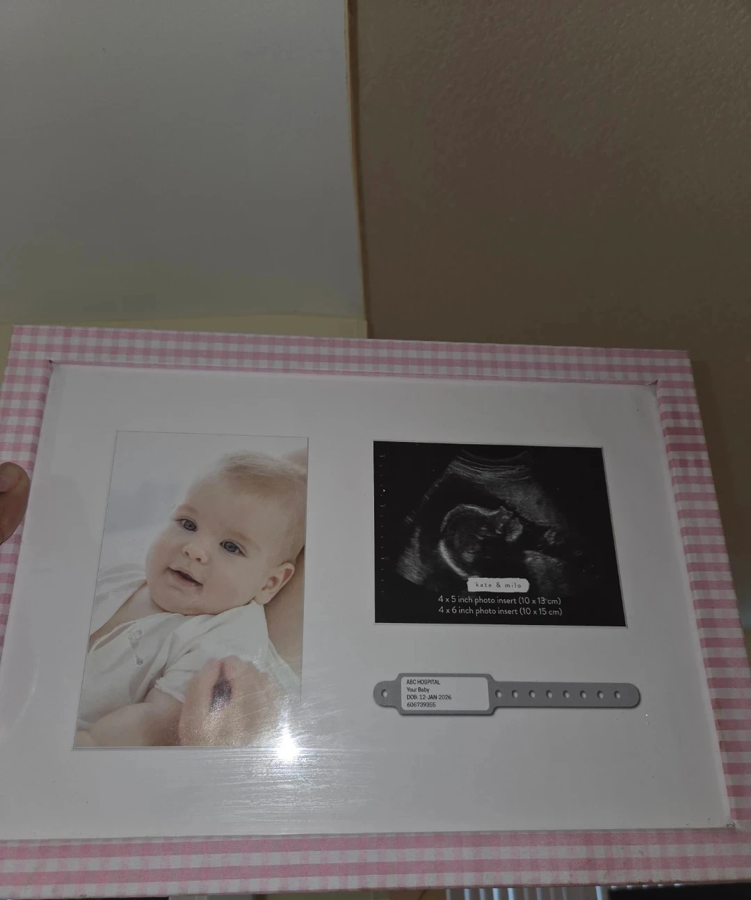 Selling a Kate & Milo baby photo frame. It has inserts for both a baby photo and an ultrasound picture. The frame can hold a 4x5 inch photo (10 x 13 cm) and a 4x6 inch photo (10 x 15 cm).