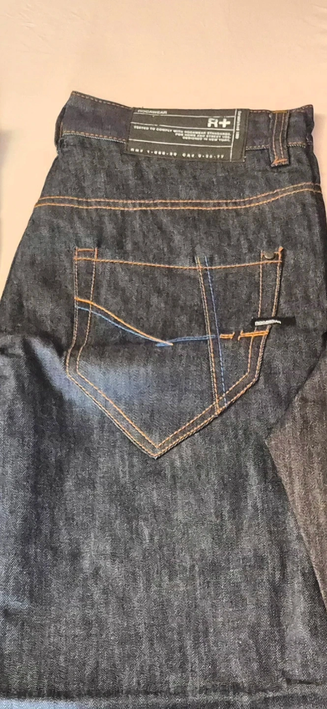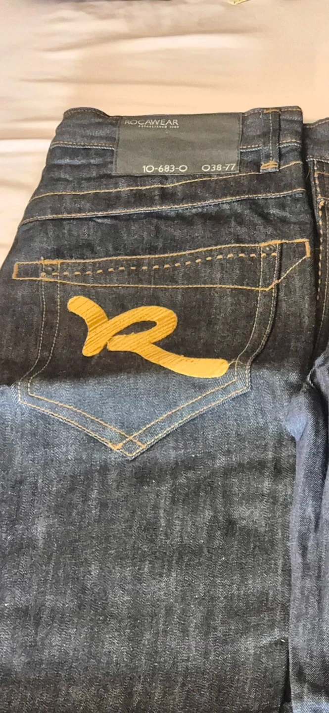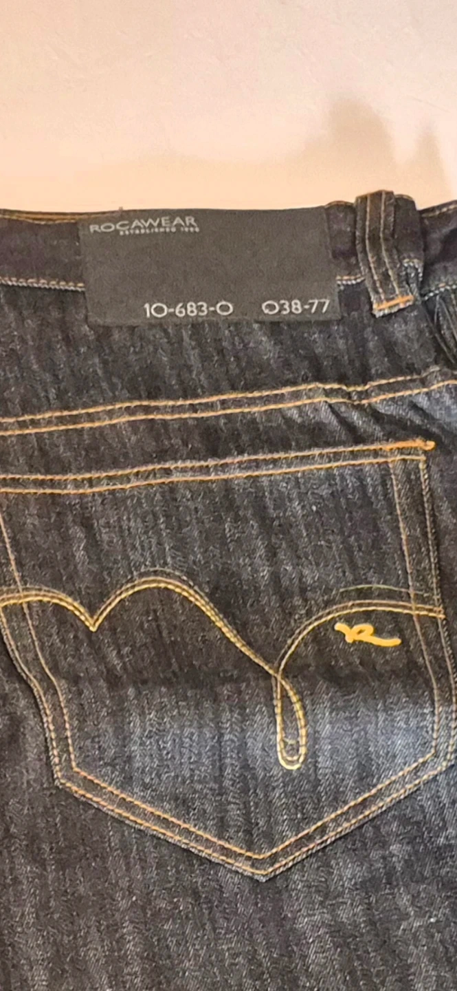 Two pairs of dark wash denim jeans by Rocawear. Each pair is a size 36 and features the signature Rocawear "R" logo stitching on the back pockets. Made from durable denim. New size 36 .