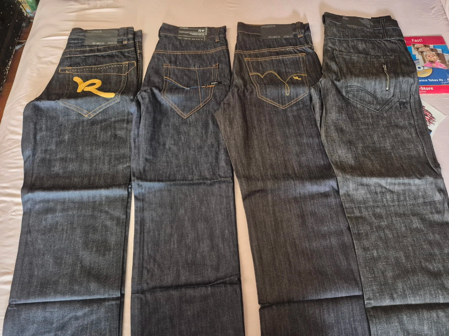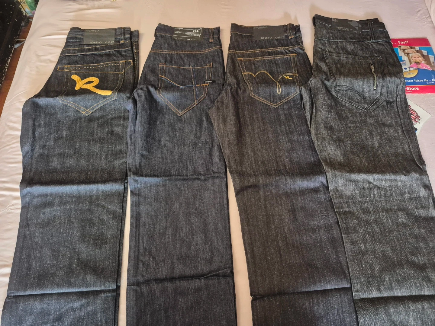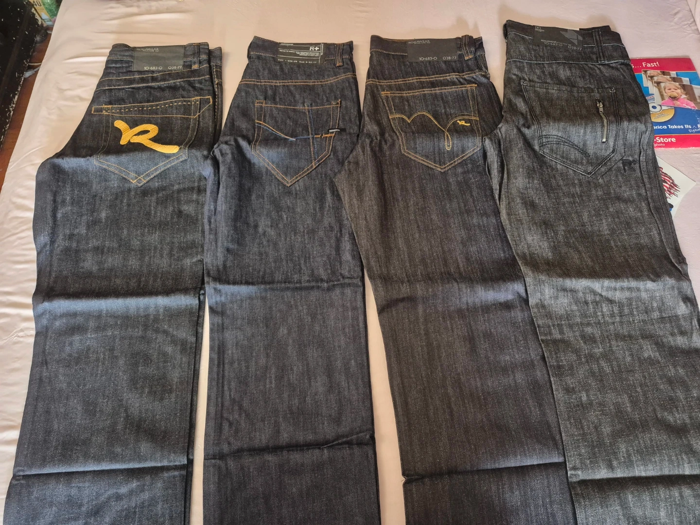 Two pairs of dark wash denim jeans by Rocawear. Each pair is a size 36 and features the signature Rocawear "R" logo stitching on the back pockets. Made from durable denim. New size 36 .