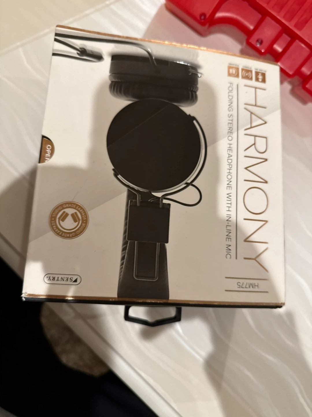 Folding stereo headphones with an in-line microphone. They feature studio-grade ear pads and a folding design for portability. Includes original packaging.