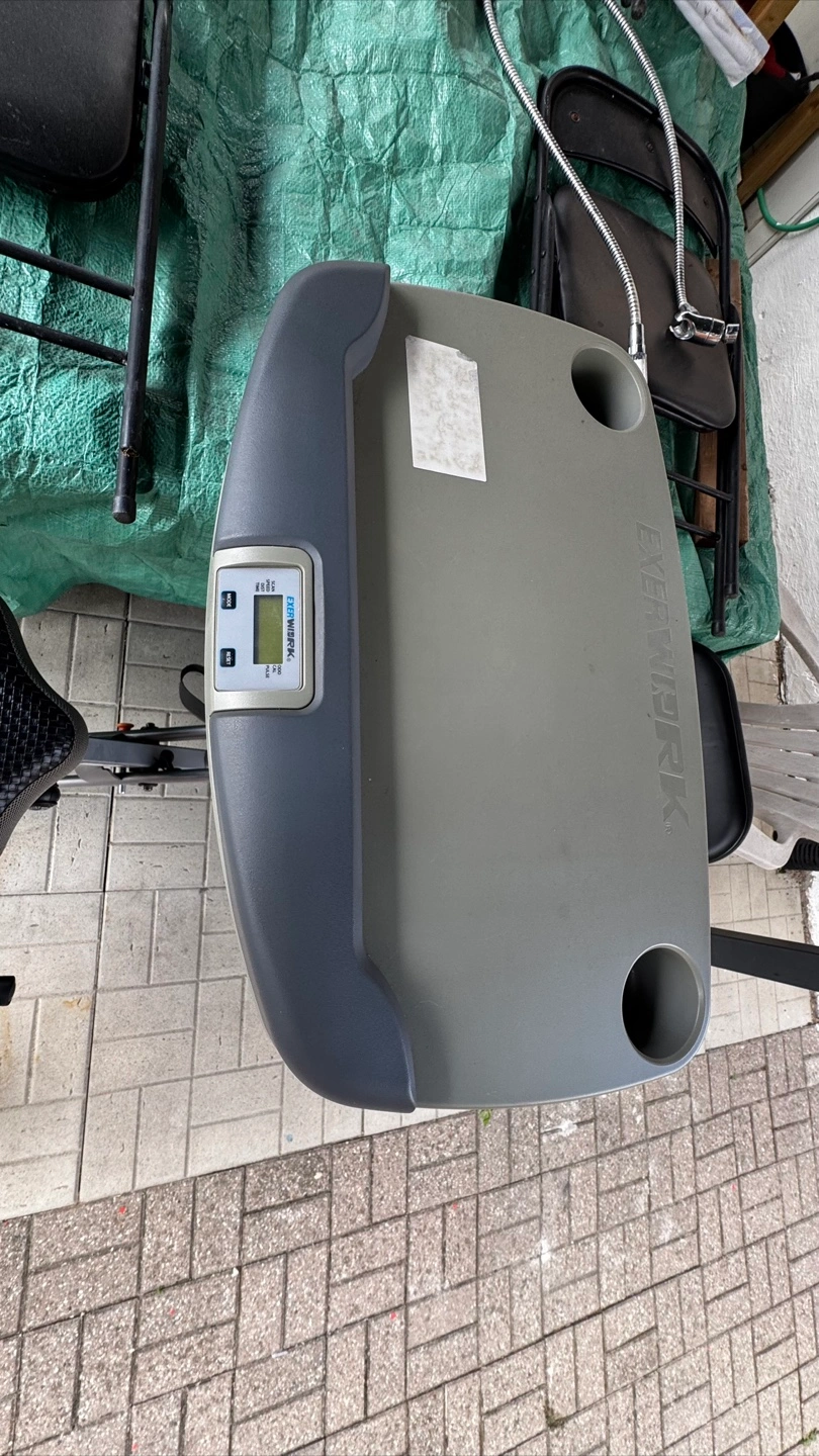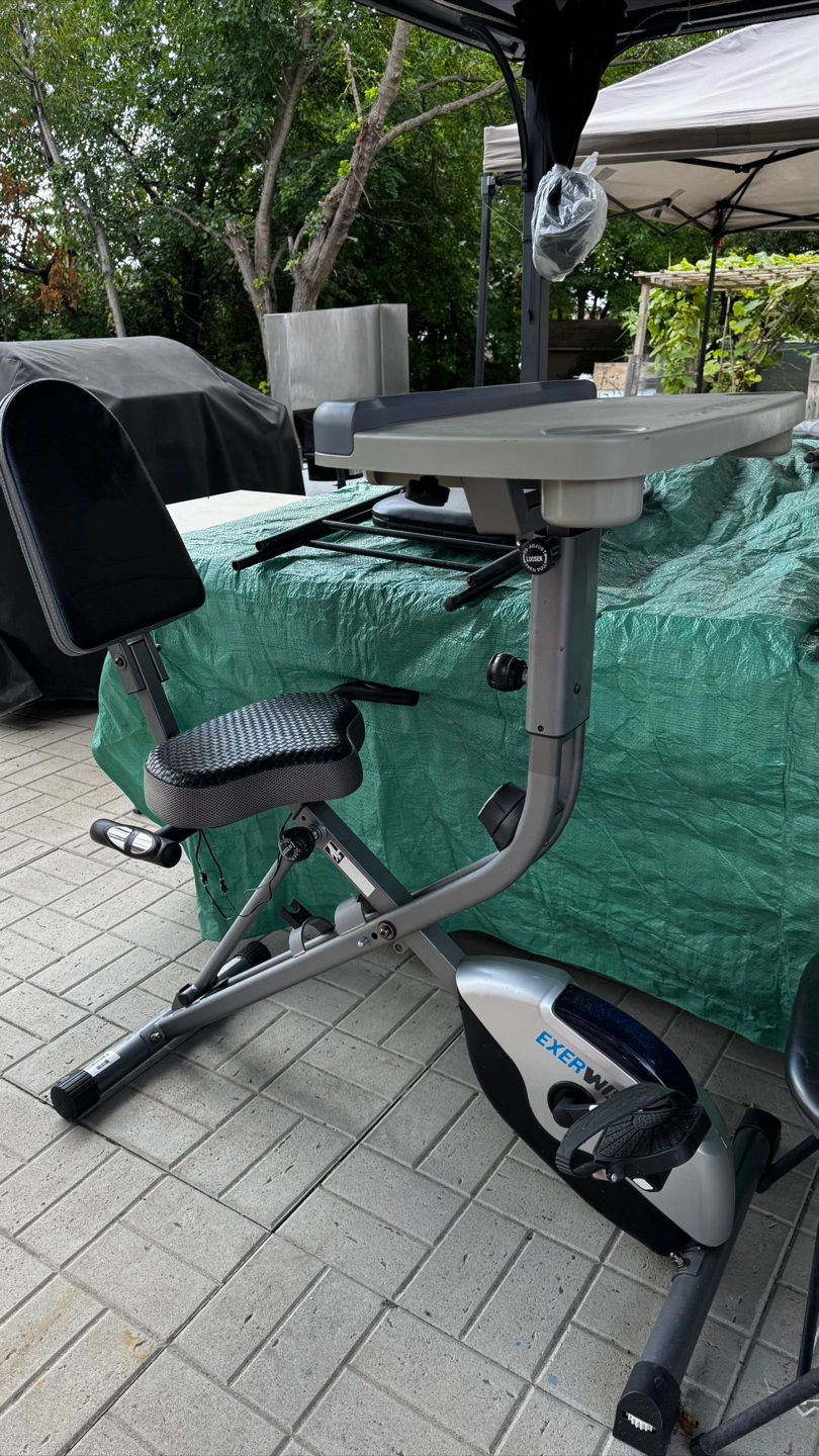 Selling an Exerwork recumbent exercise bike with a built-in desk. It's perfect for getting a workout in while you work or study. It's in great condition and ready for a new home!