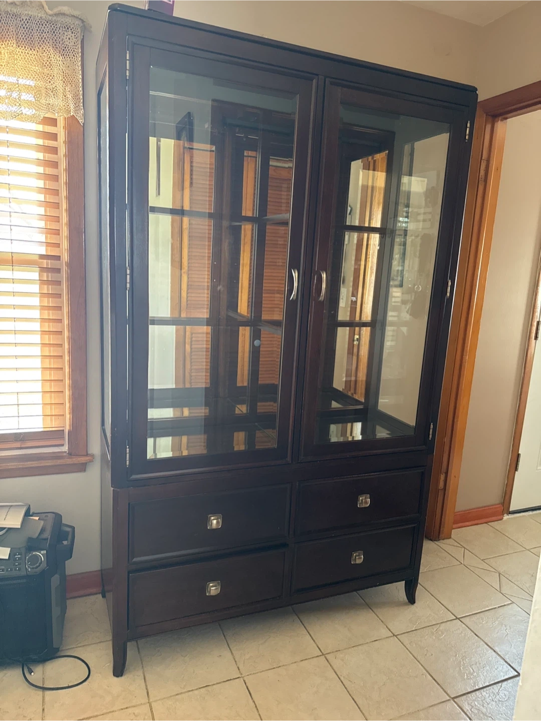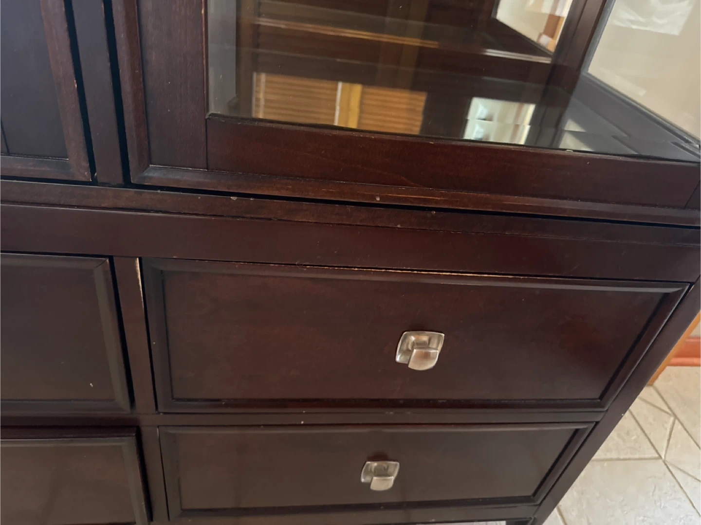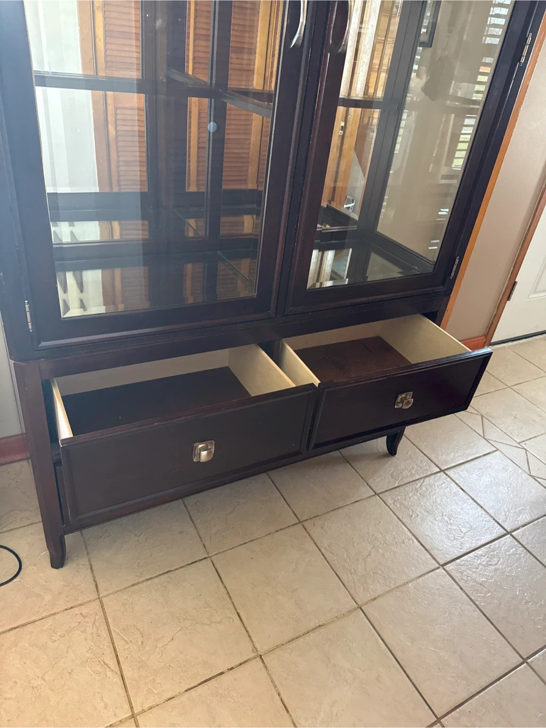 This dark wood china cabinet features glass doors on top for display and drawers on the bottom for storage. Its rich finish adds a touch of elegance to any dining room or living area. Perfect for showcasing dinnerware or storing linens!