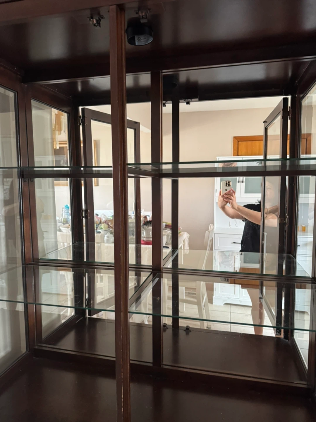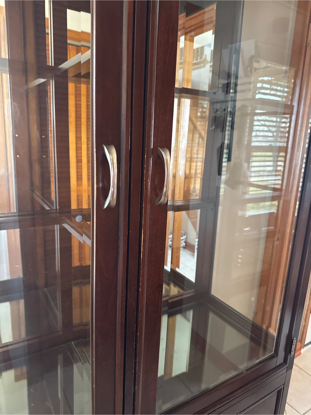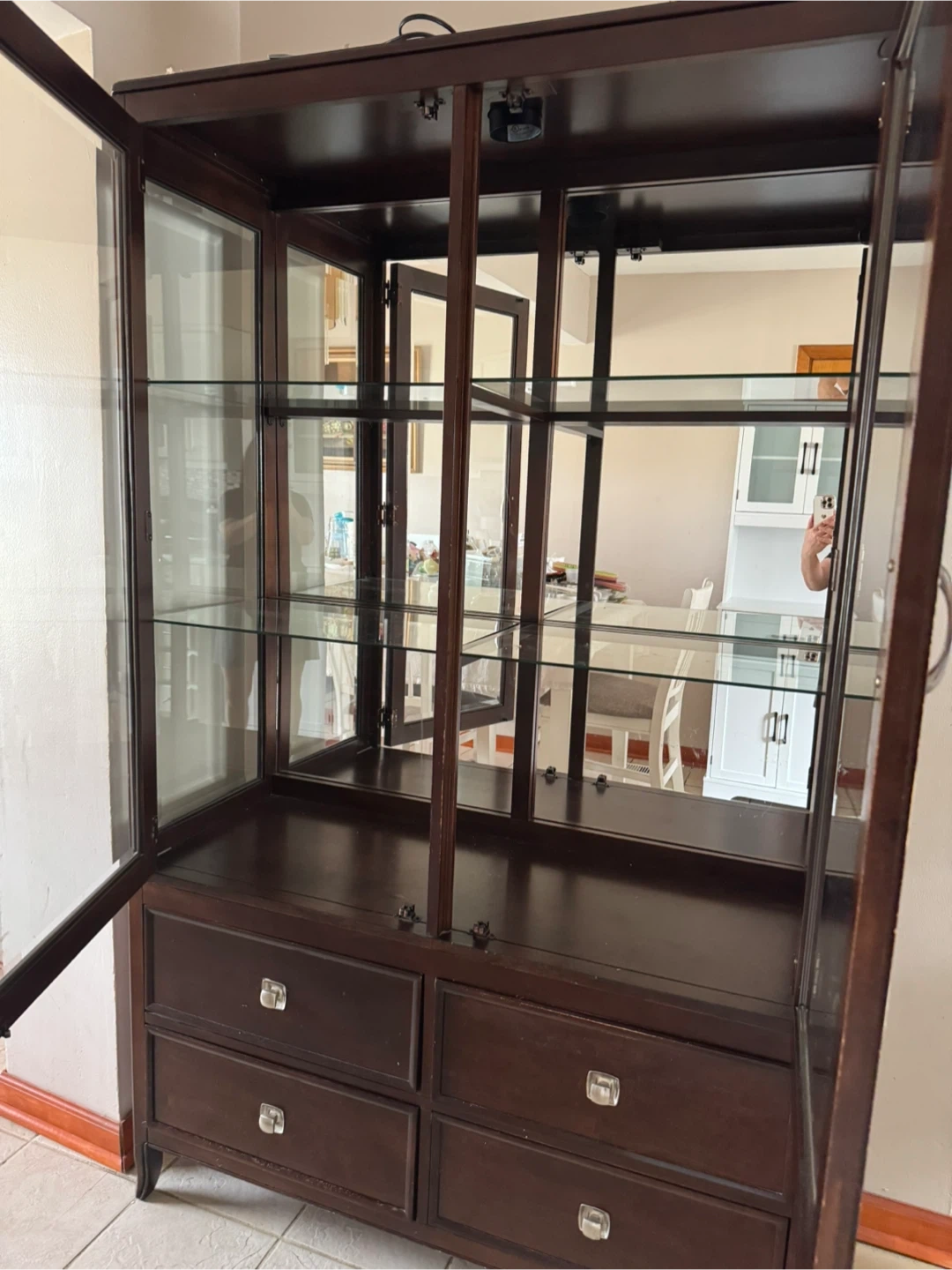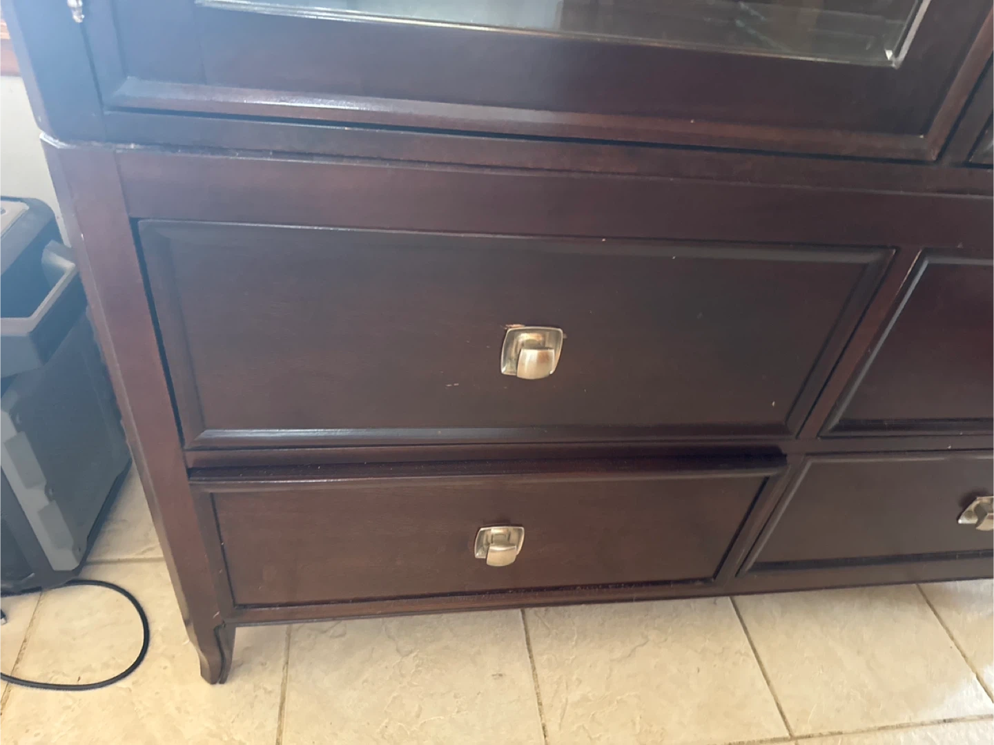 This dark wood china cabinet features glass doors on top for display and drawers on the bottom for storage. Its rich finish adds a touch of elegance to any dining room or living area. Perfect for showcasing dinnerware or storing linens!