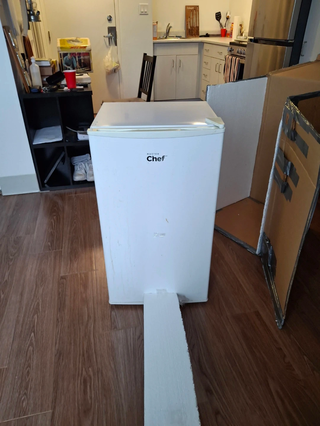 This is a white Master Chef compact refrigerator. It's a great size for small spaces like dorm rooms or apartments. It's white and has a clean, modern look. 10000 btu.