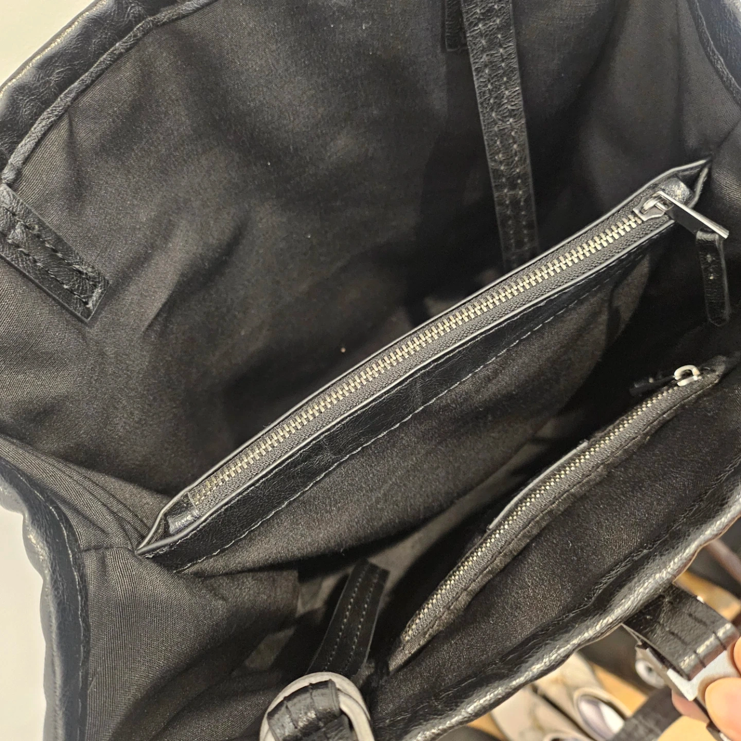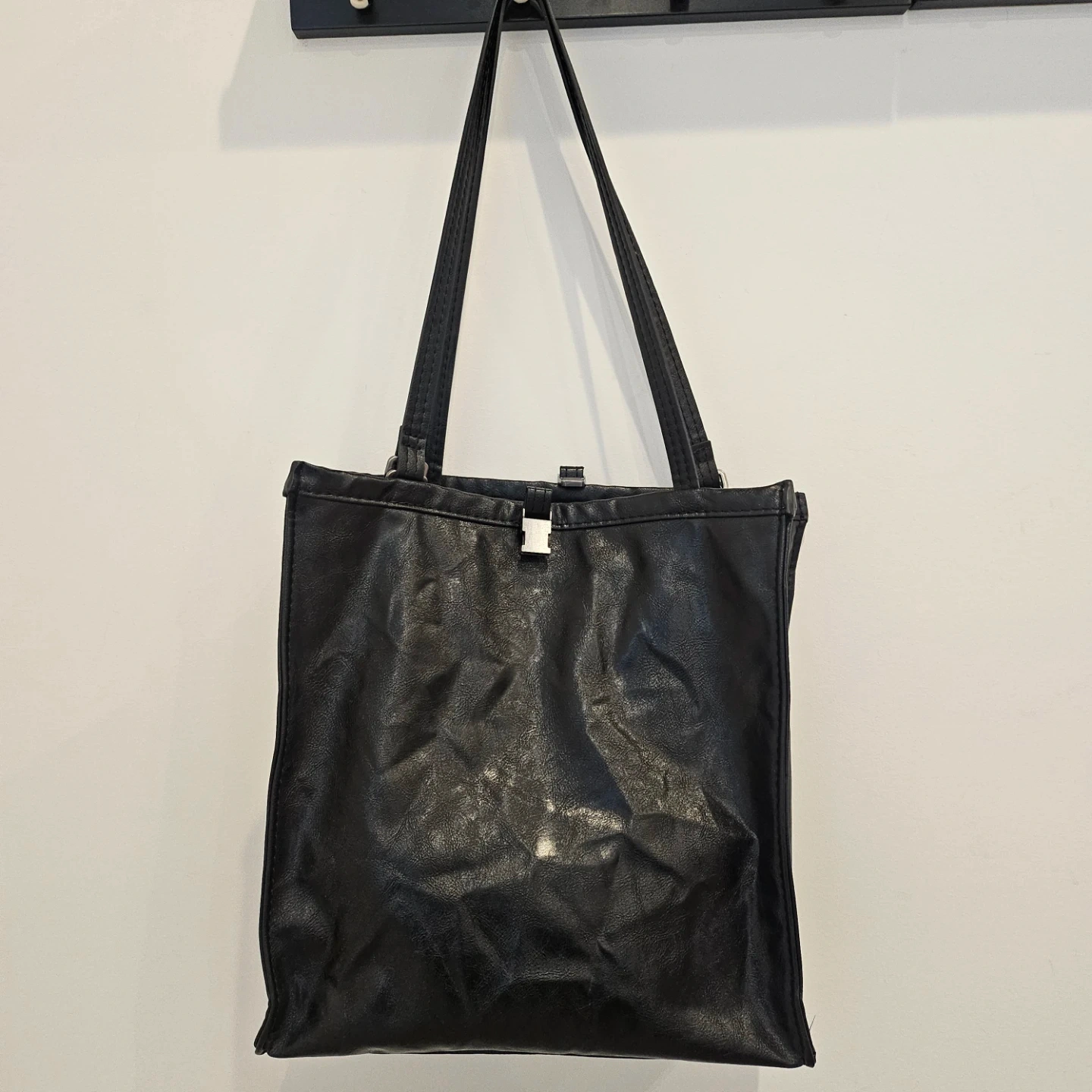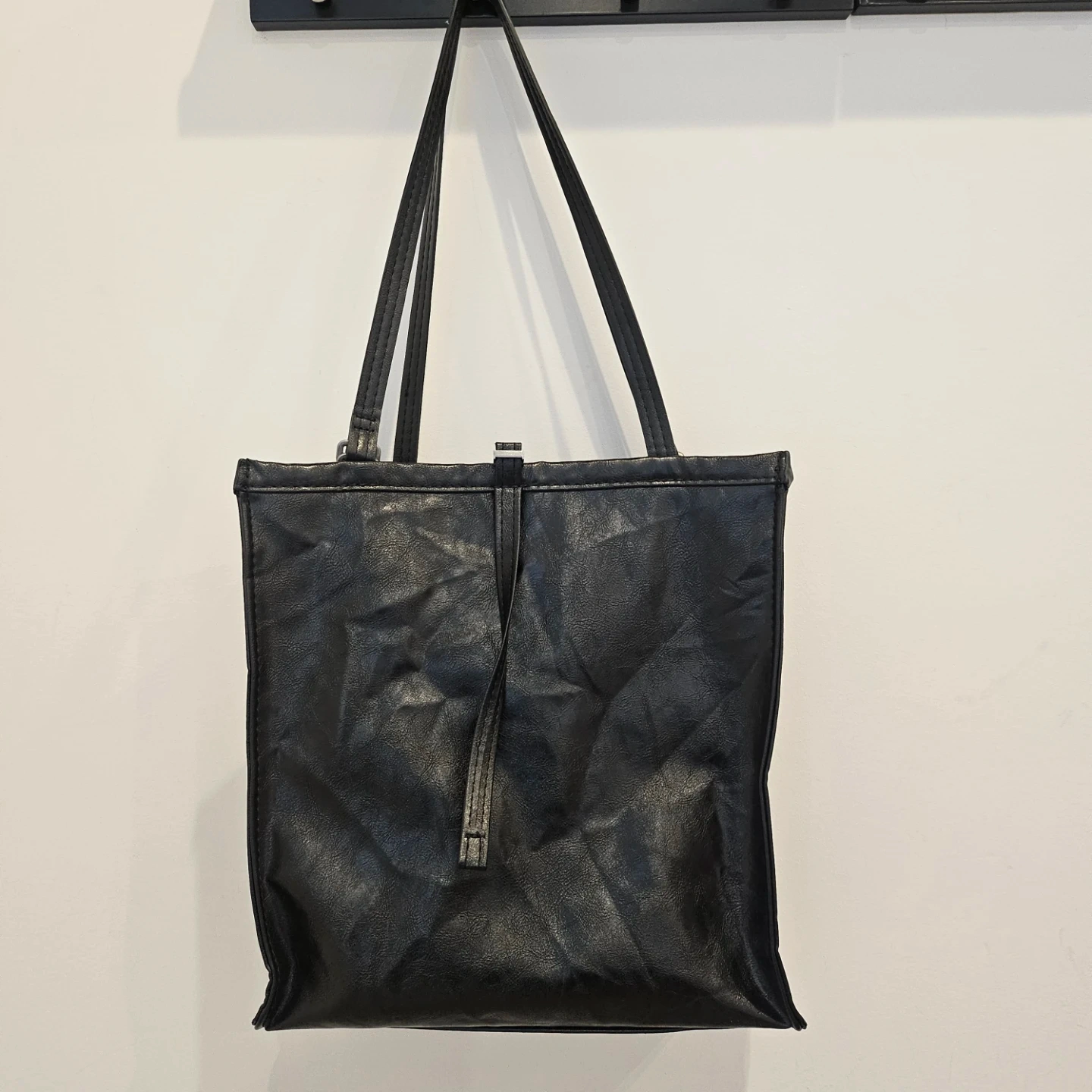 5A stylish black leather tote bag, perfect for everyday use! It features a simple yet chic design with long straps for comfortable carrying. The bag has a spacious interior with zipper pockets to keep your belongings organized. It's in great condition.