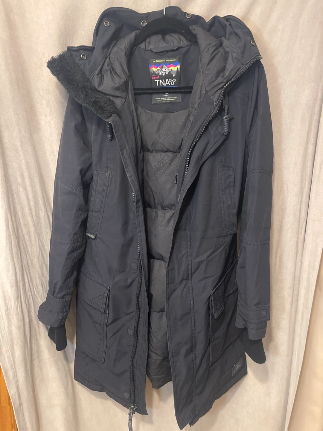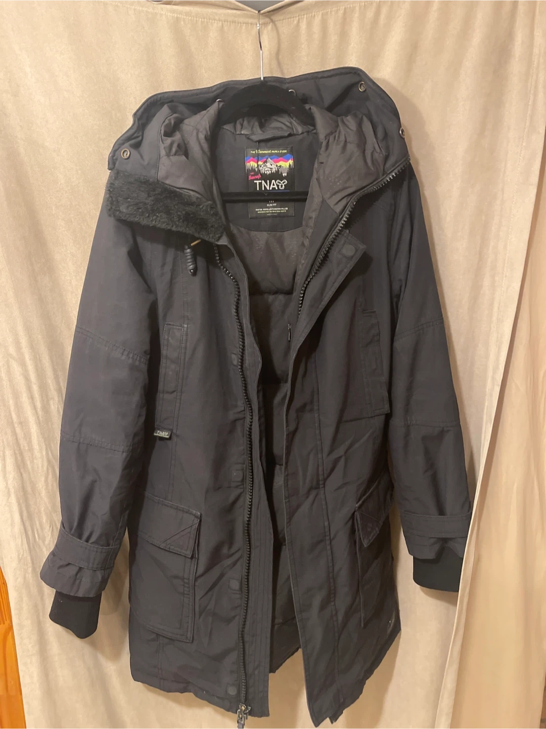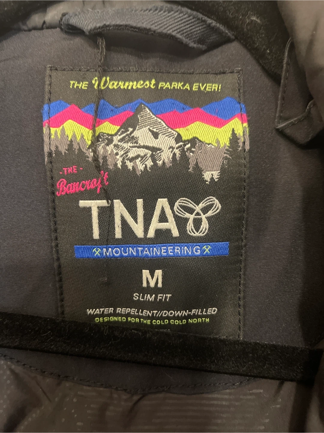 Selling a TNA Bancroft parka in size medium. It's a slim fit and designed for the cold north. It's water repellent and down-filled. Perfect for the winter season! Fur on hood is missing.