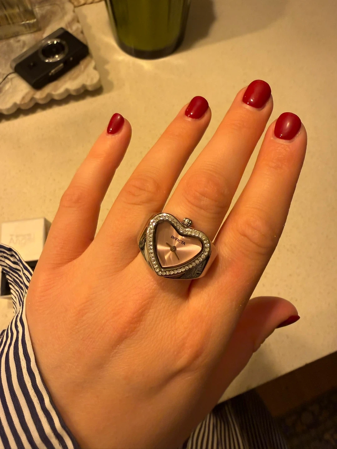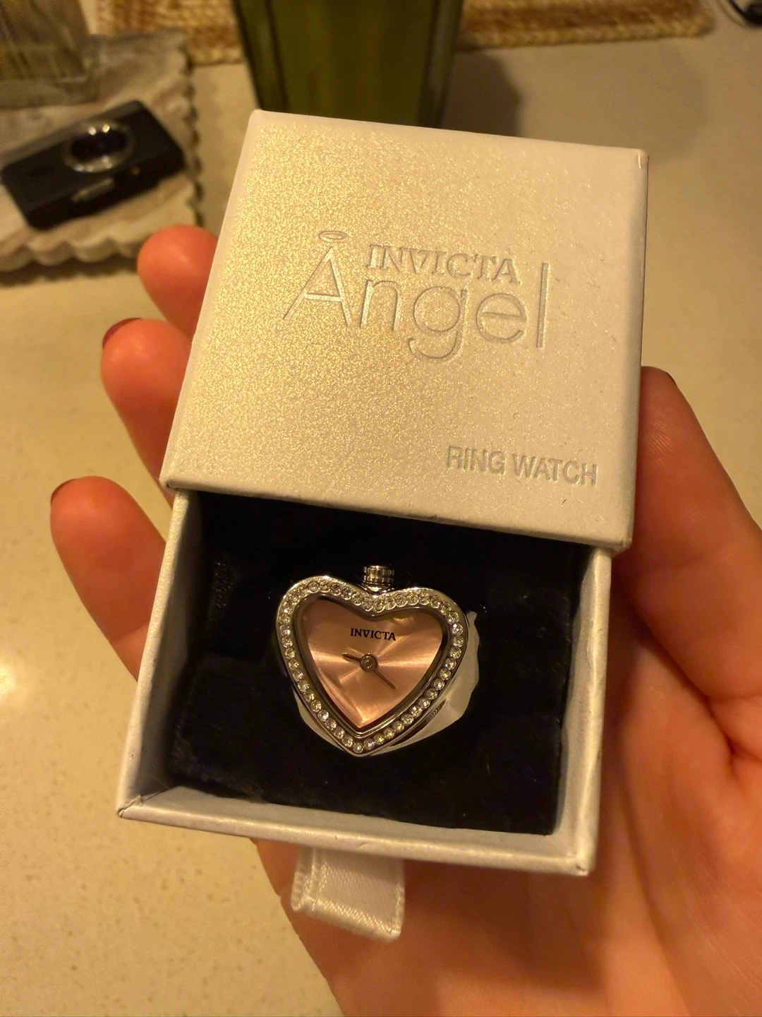 This is an Invicta Angel ring watch. It features a heart-shaped pink face with a crystal accent bezel. Comes in its original box!