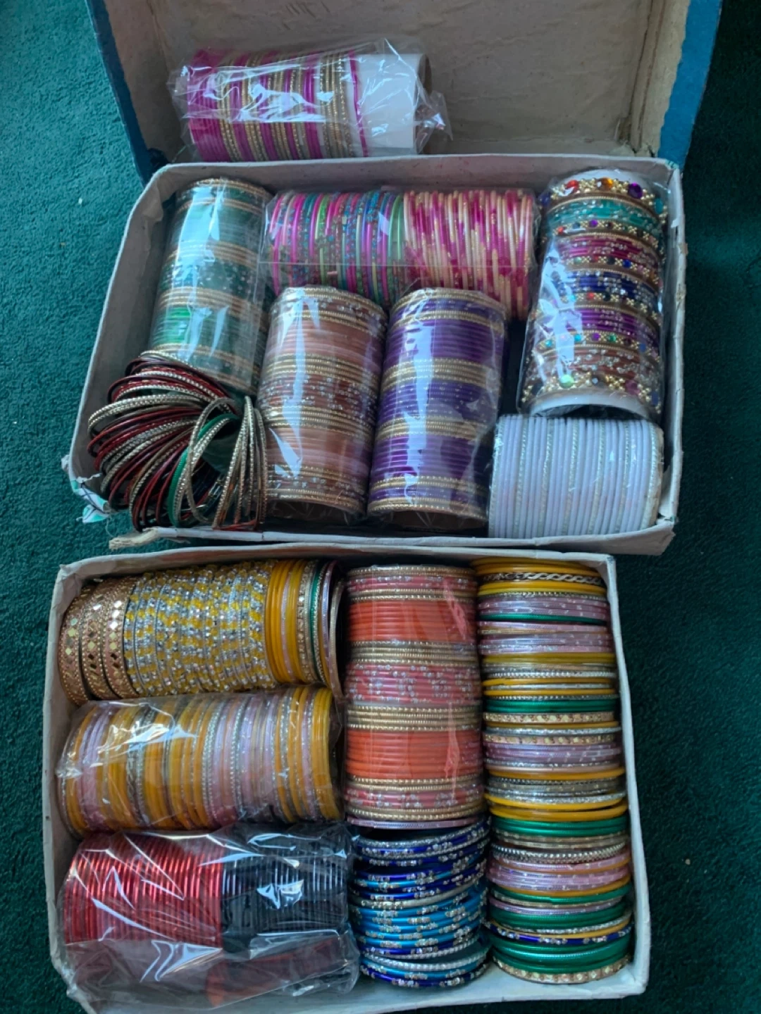 This is a large set of assorted bangles. Various colours and decorative styles are included. These bangles are perfect for adding a pop of colour to any outfit!