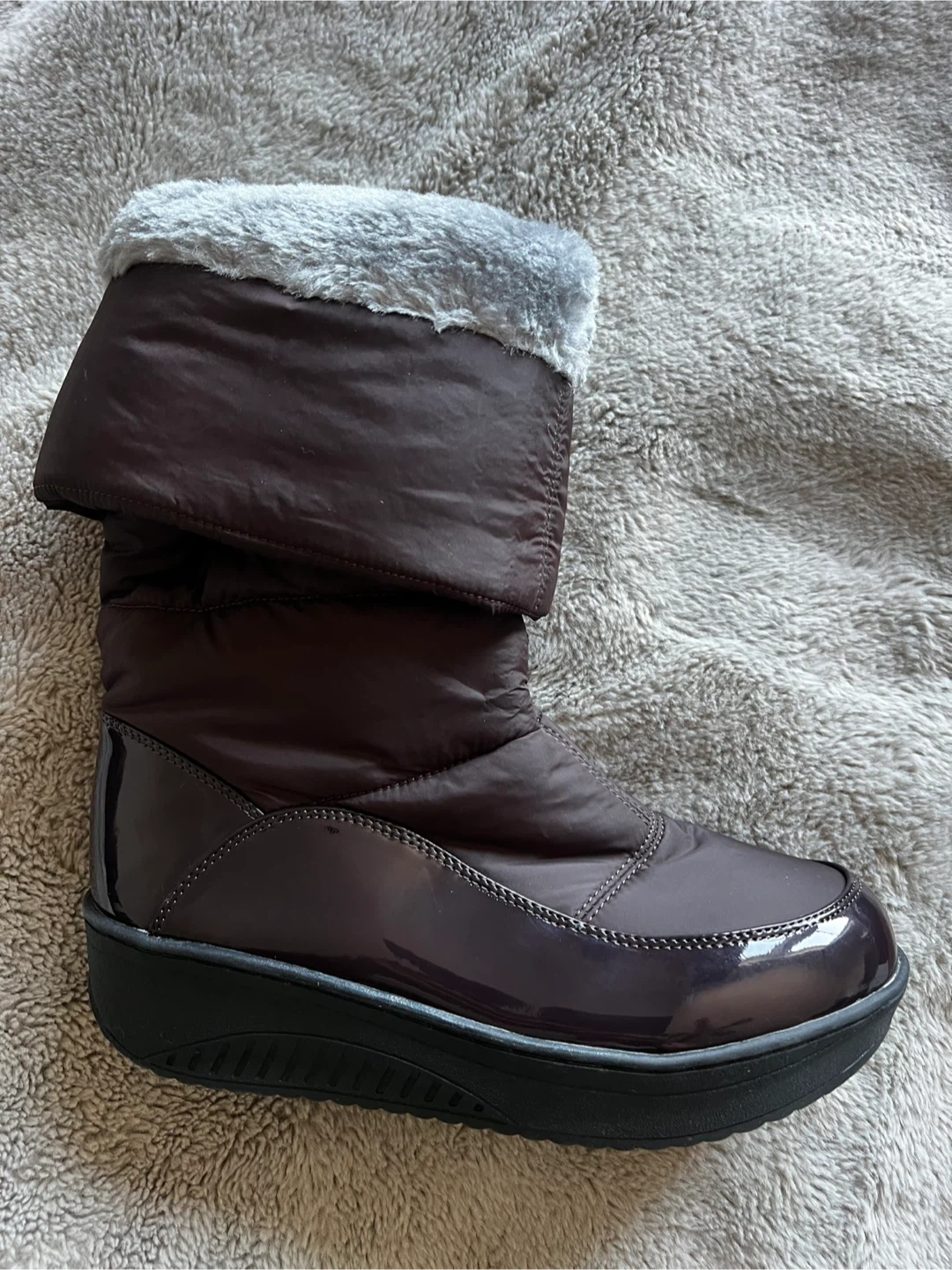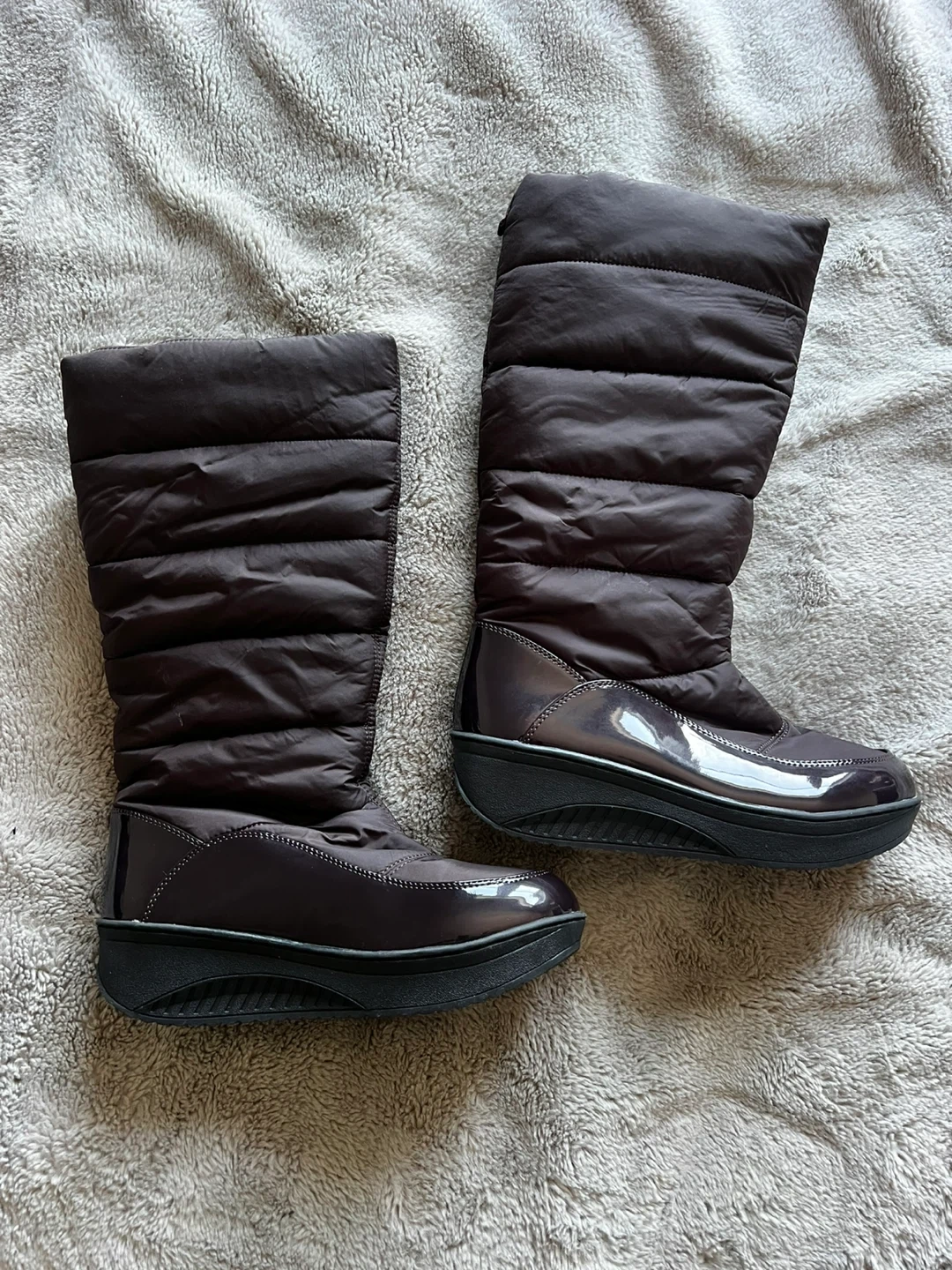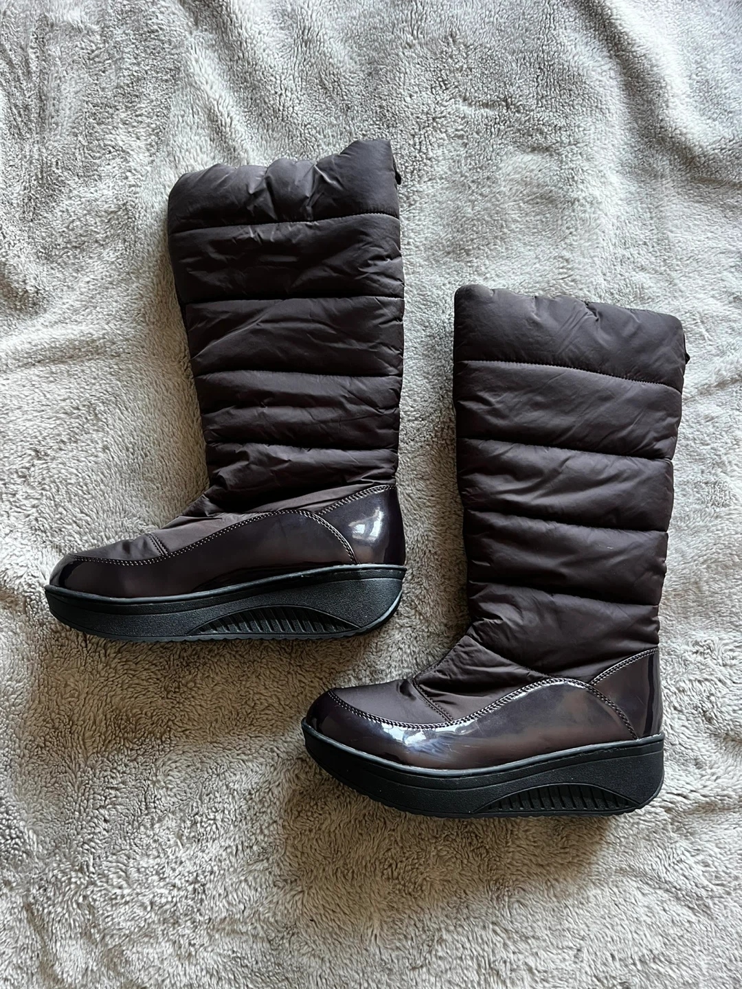 Stay warm in these stylish brown quilted boots. They feature a side zipper for easy on and off. The soles are durable and provide good traction.
