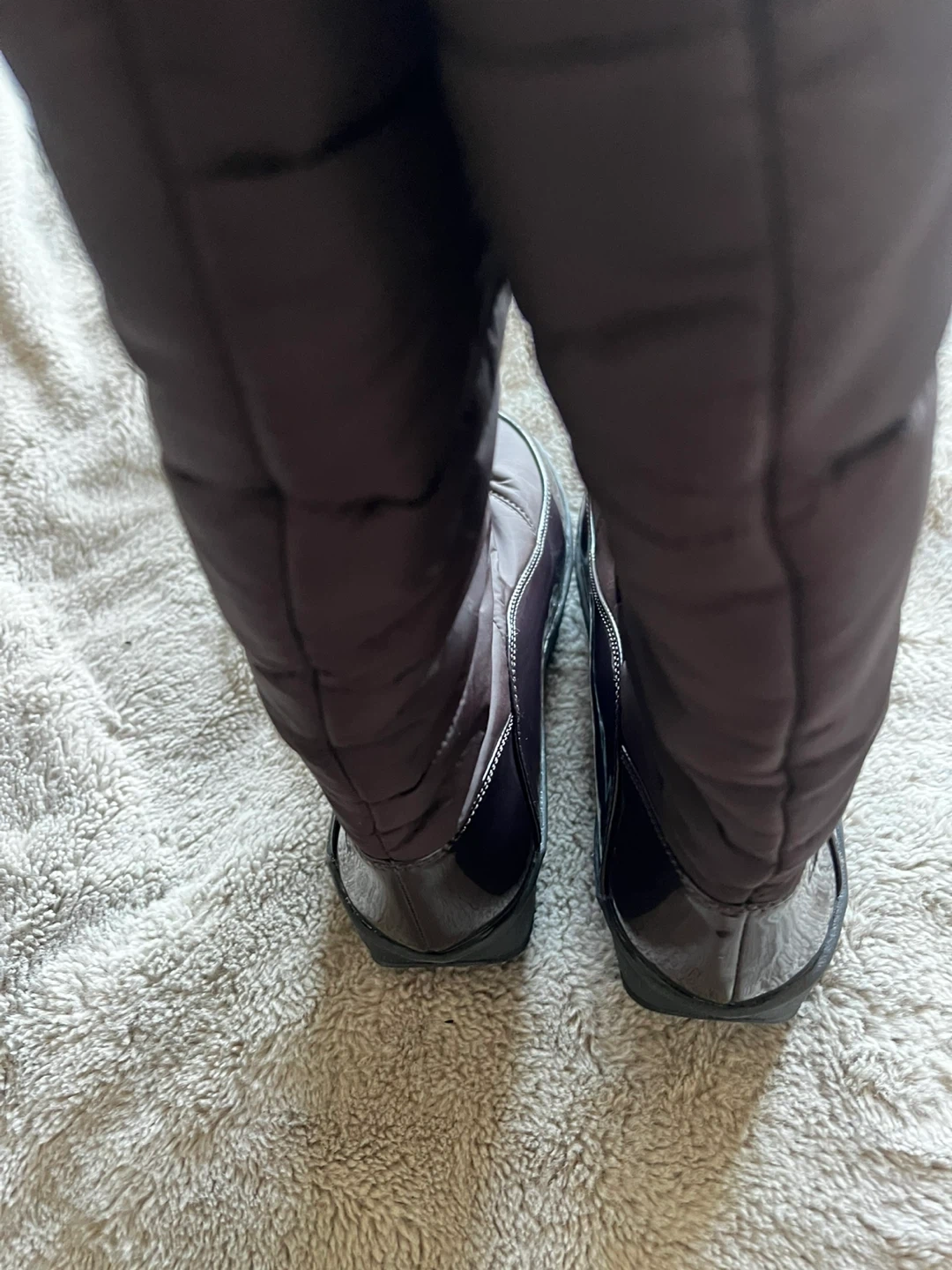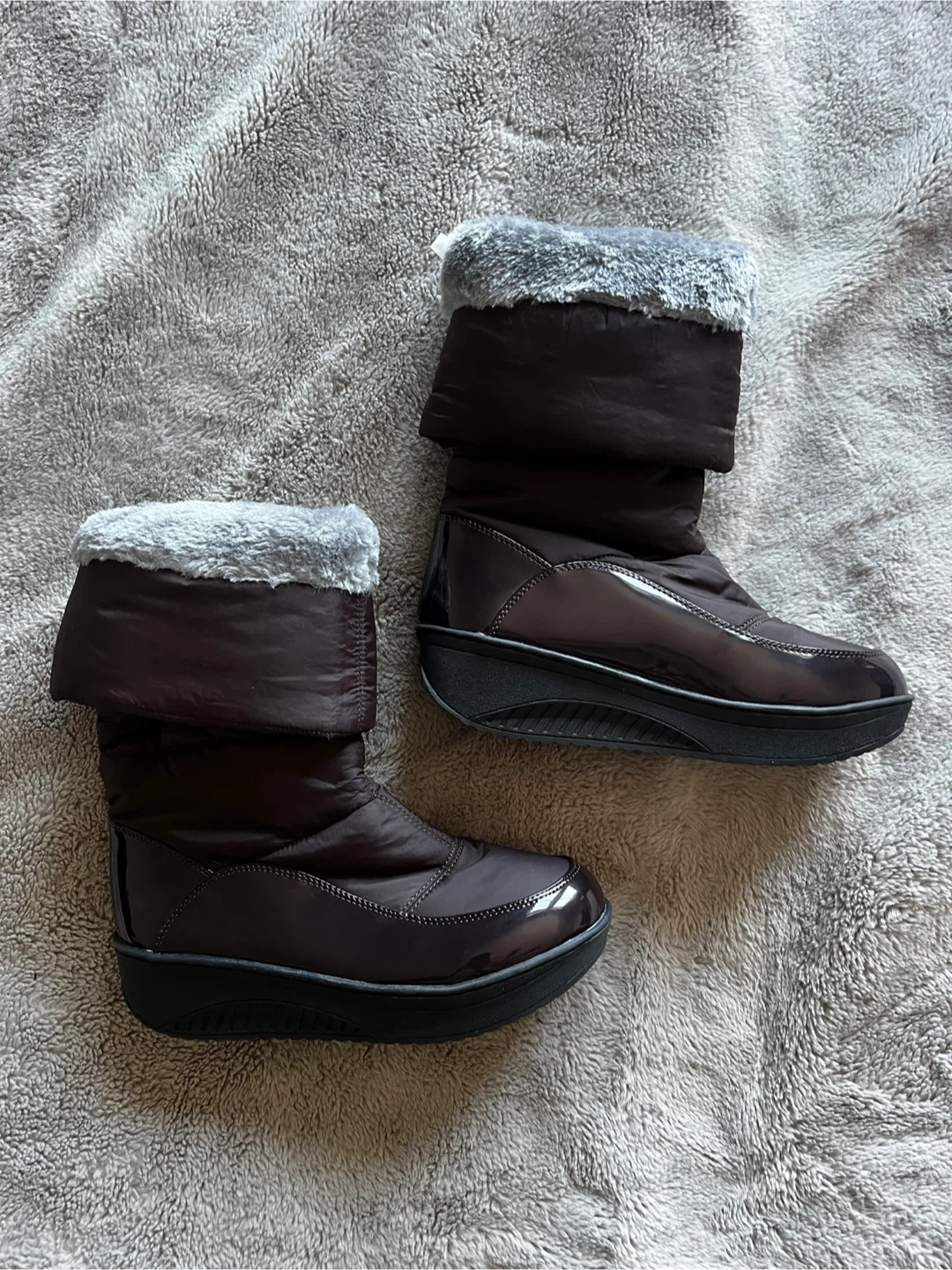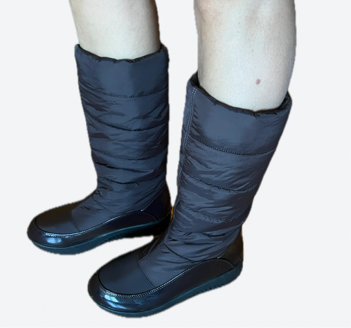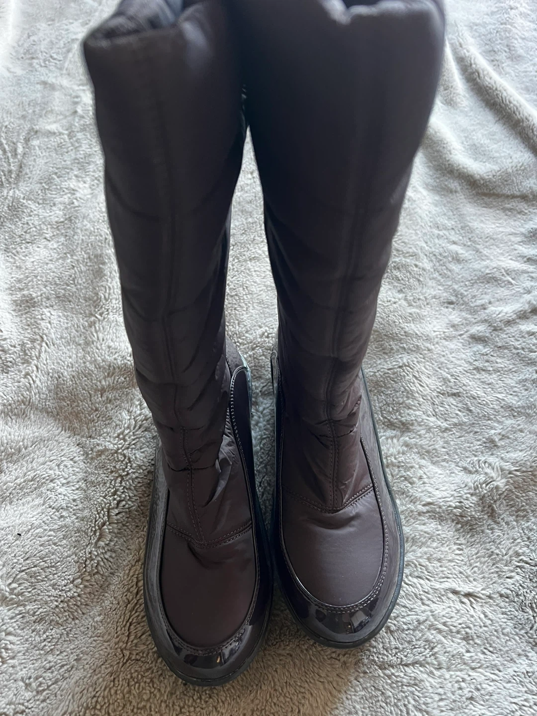 Stay warm in these stylish brown quilted boots. They feature a side zipper for easy on and off. The soles are durable and provide good traction.