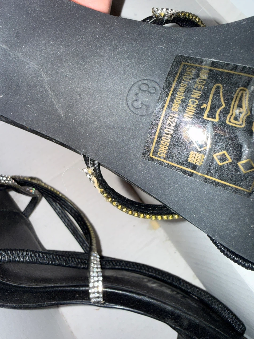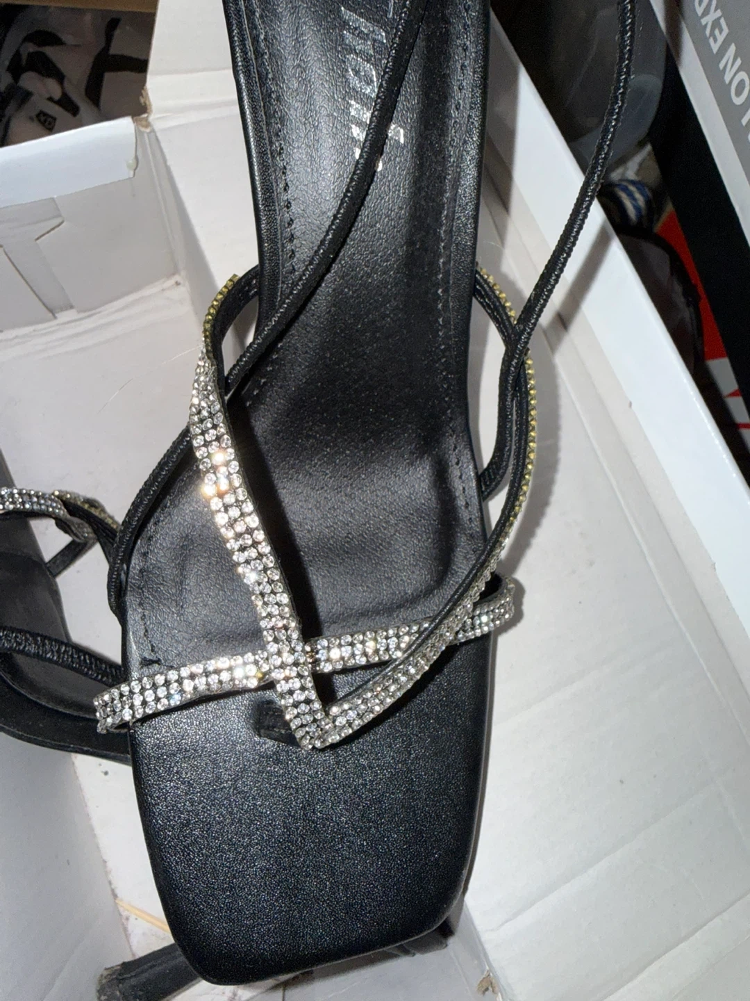 These black strappy square toe heels are adorned with sparkling rhinestones for a touch of glamour. They feature a comfortable size 8.5 fit. Perfect for dressing up any outfit!