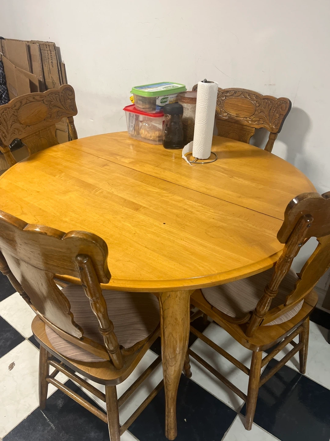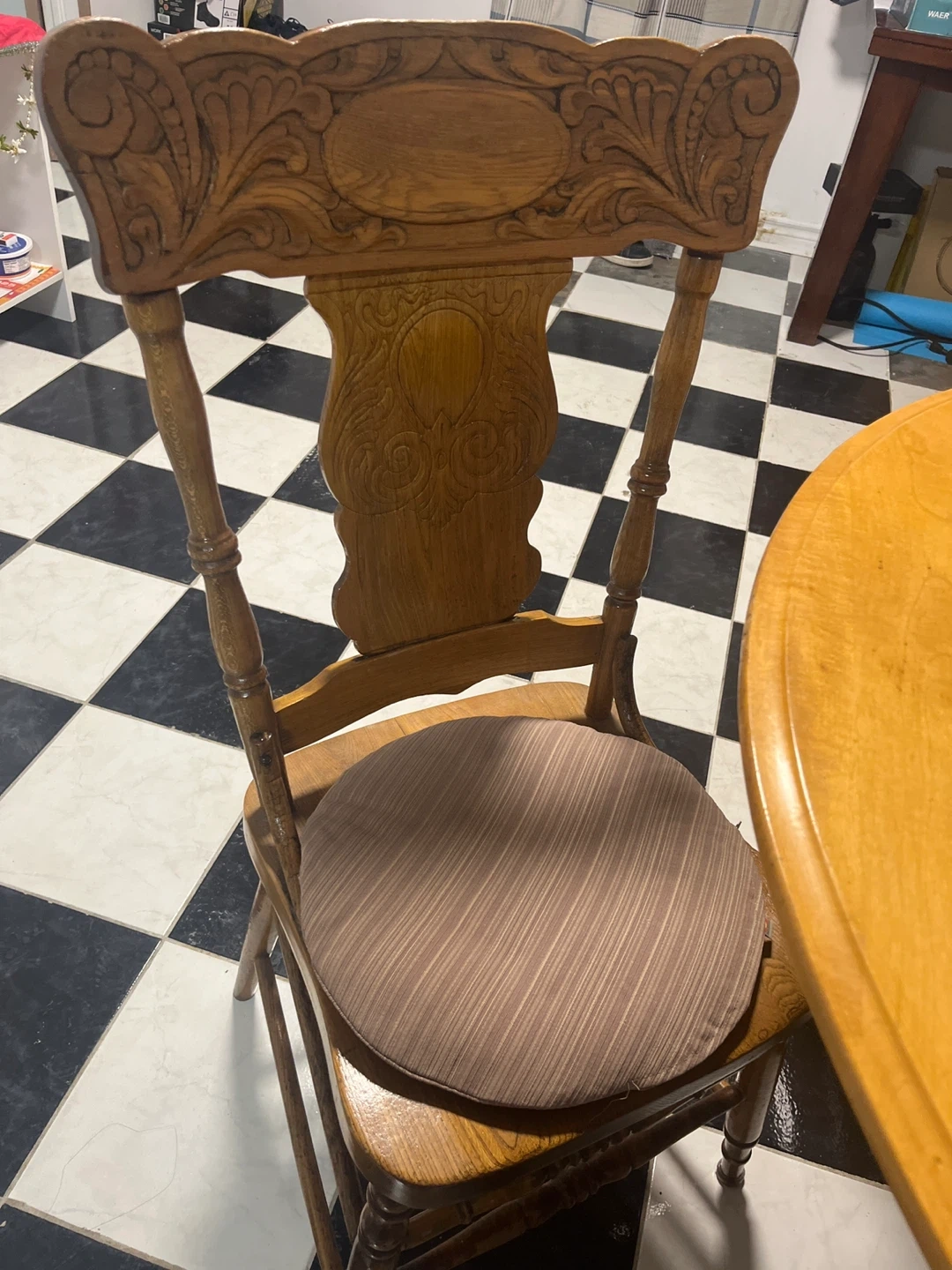 This is a vintage wooden dining set with a round table and four matching chairs. The chairs have upholstered seat cushions and carved detailing on the backs. The table has a lovely light wood finish. It's a great set for a smaller dining area or kitchen nook!