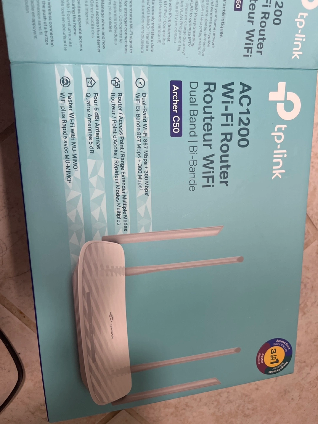 Selling a TP-Link Archer C50 AC1200 Wi-Fi Router! This is a dual-band router, perfect for improving your home network. It features four 5 dBi antennas for better coverage and faster Wi-Fi with MU-MIMO. The box is included, along with all original components. 25 cash. Pick up at Thornhill. Originally from Walmart for 59+ tax.