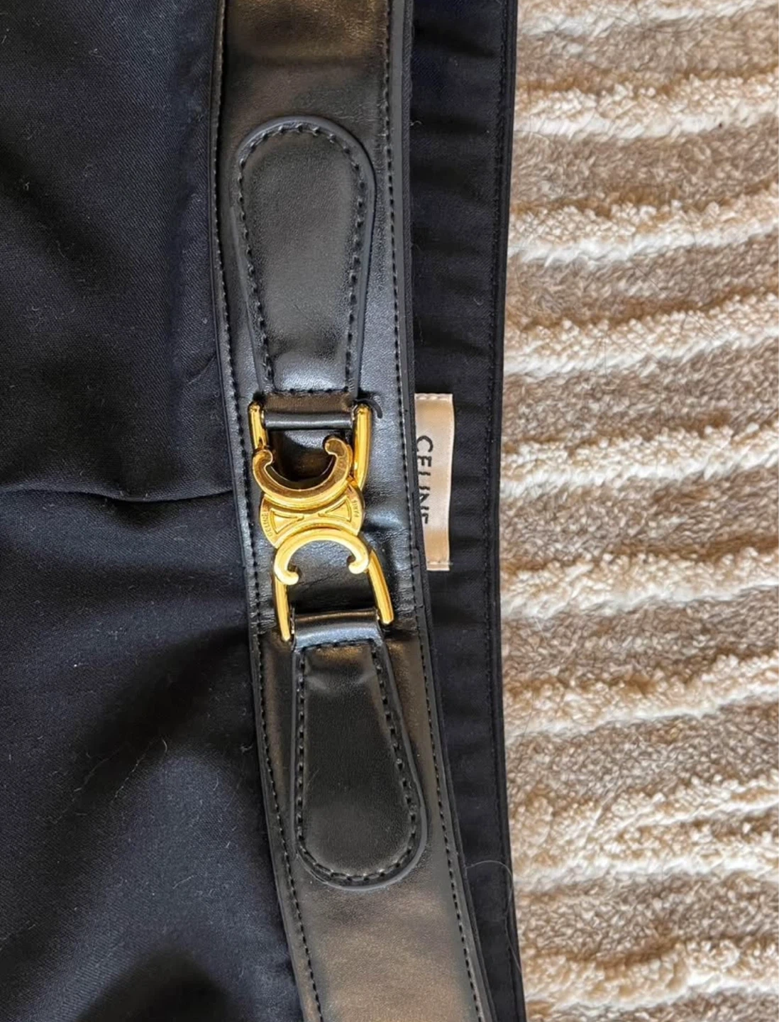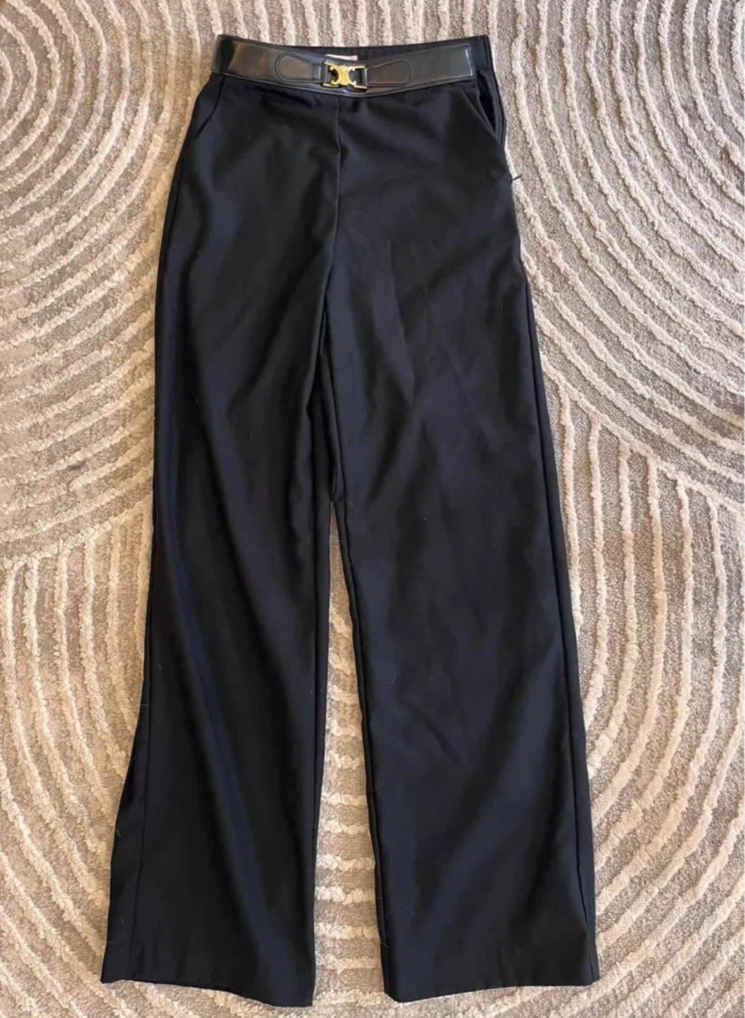 Stylish black wide-leg trousers from Celine. These pants feature a sleek design with a distinctive gold buckle detail at the waist. Material is a blend that offers a nice drape.