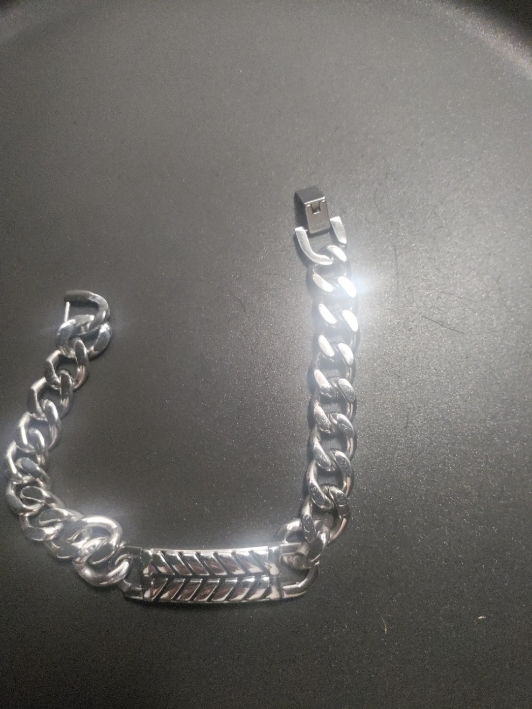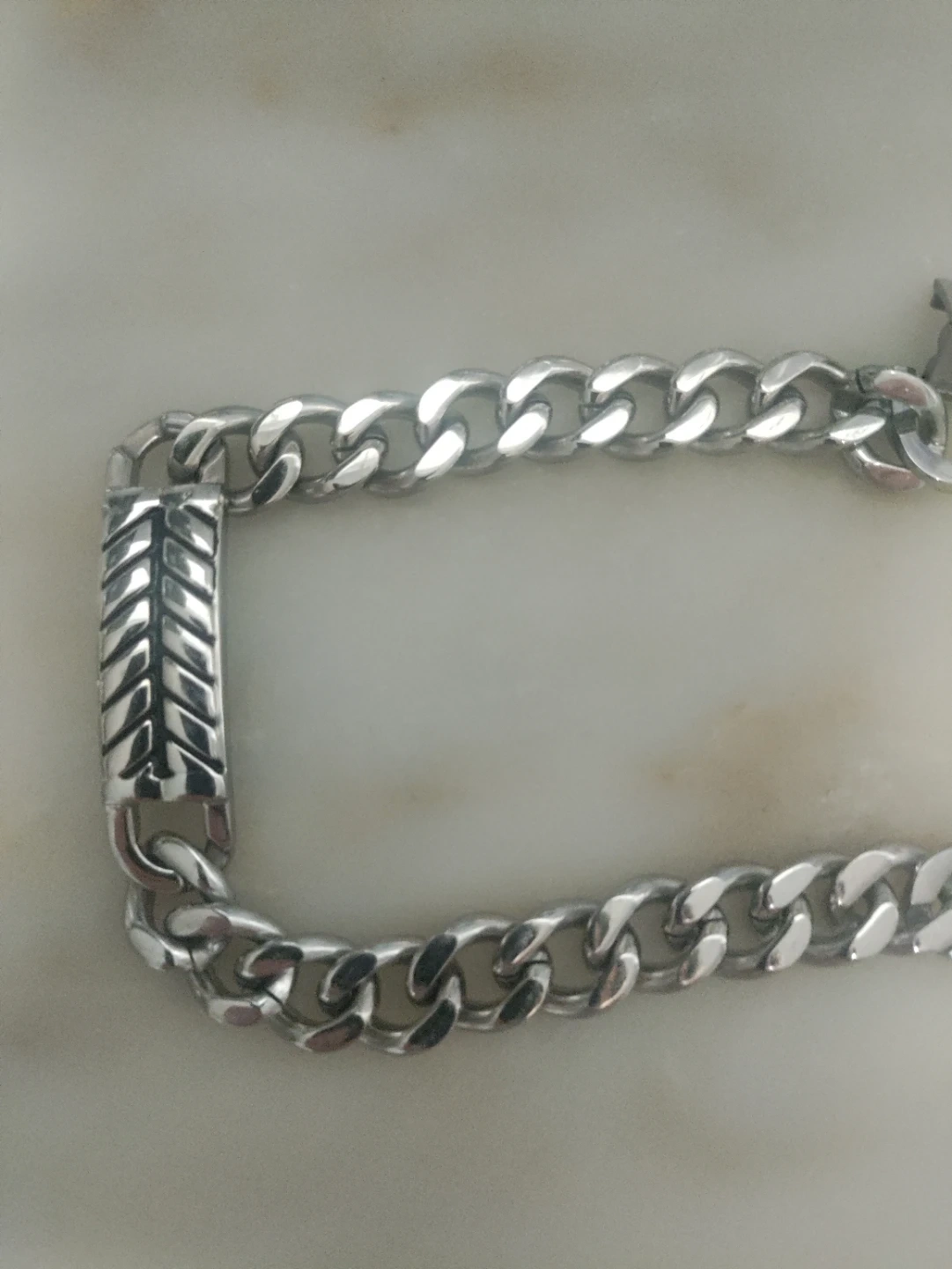 This is a stylish men's silver chain bracelet. It's made from durable stainless steel with a polished finish. The clasp is secure and easy to use. Adds a touch of cool to any outfit!