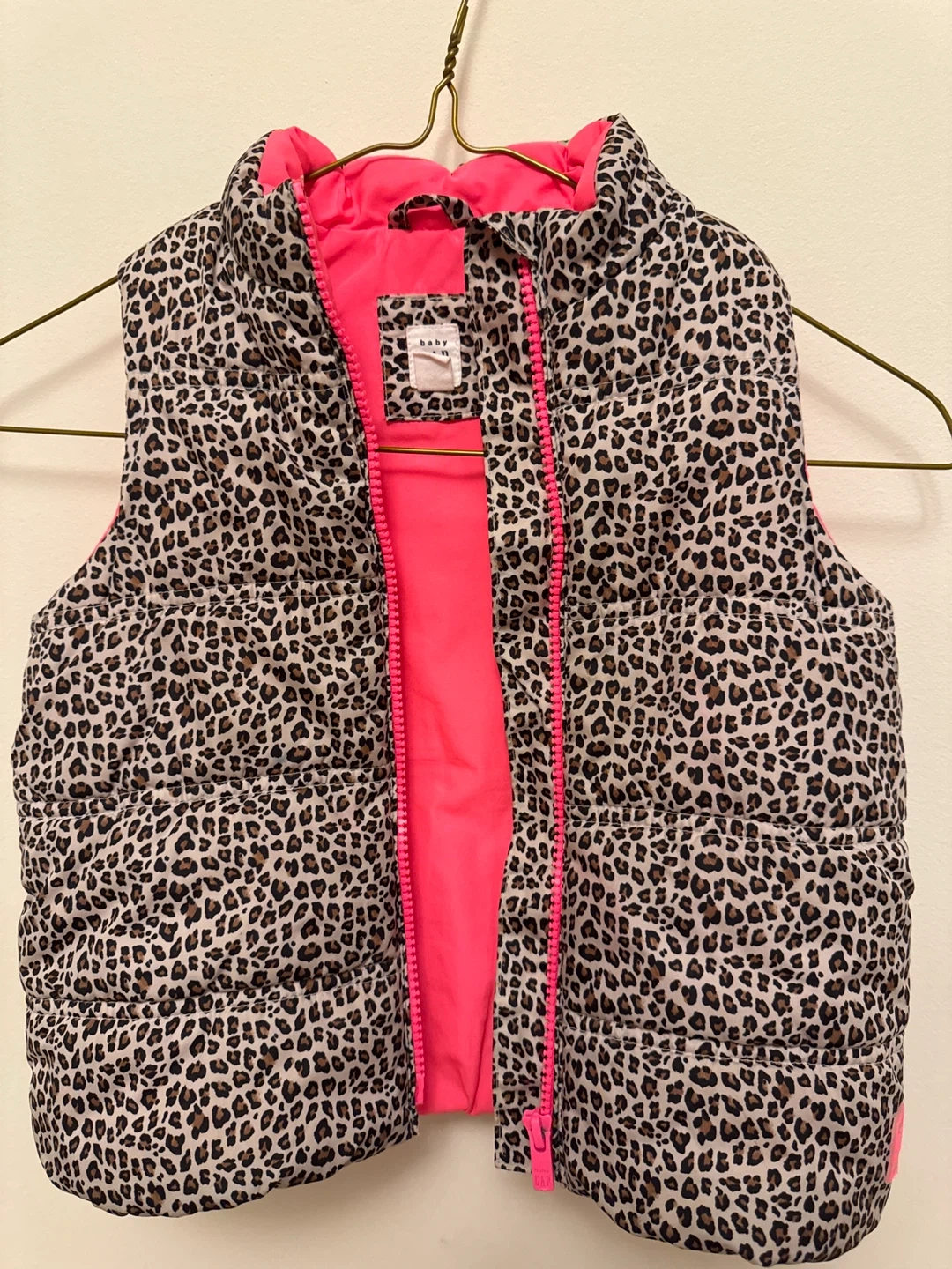 This is a Baby Gap puffer vest with a fun leopard print and bright pink lining! It's in great condition and perfect for layering on cooler days. It has a zipper closure in the front.