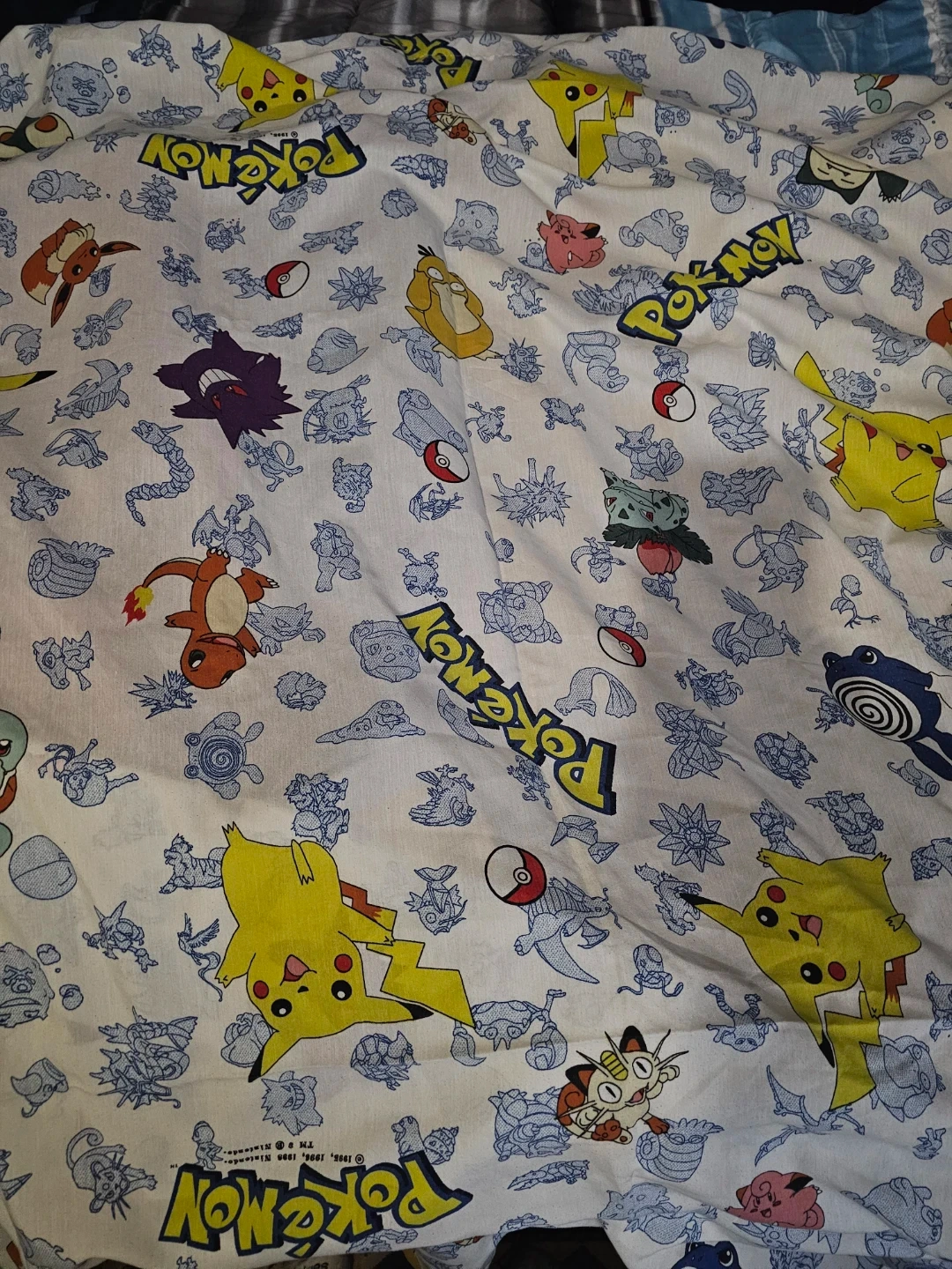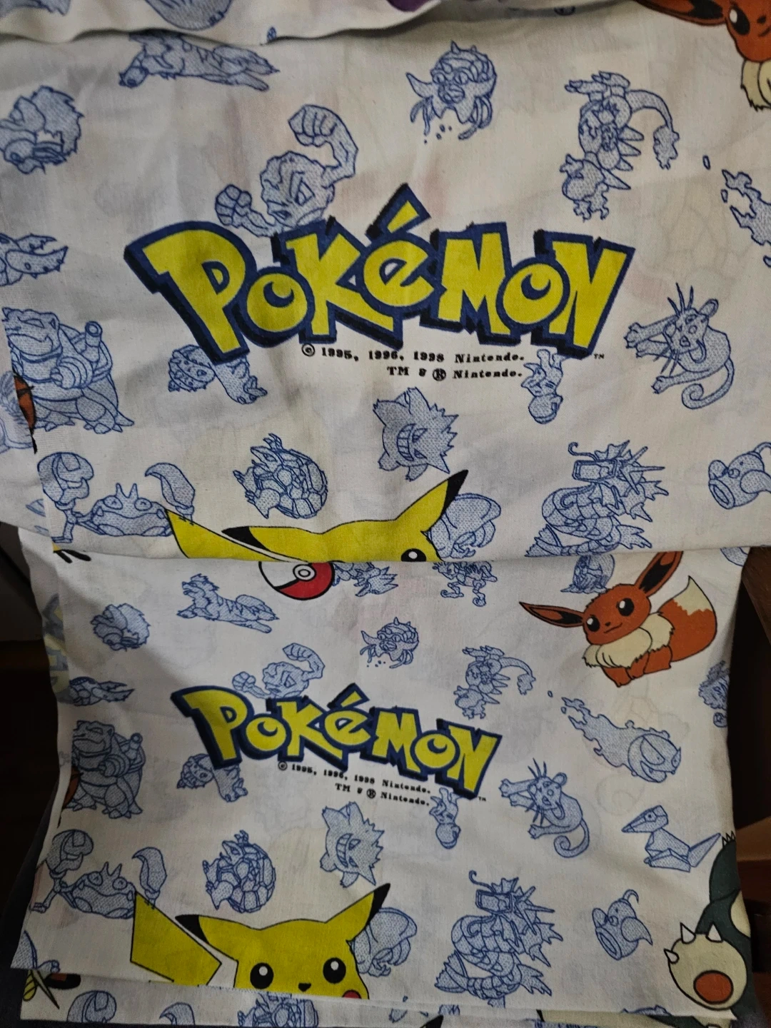This Pokemon sheet features Pikachu, Eevee, and Bulbasaur. Made of 70% polyester and 30% cotton. It's a twin/full size sheet measuring 39 x 75 inches (99 cm x 191 cm). Perfect for any young fan's bedroom!