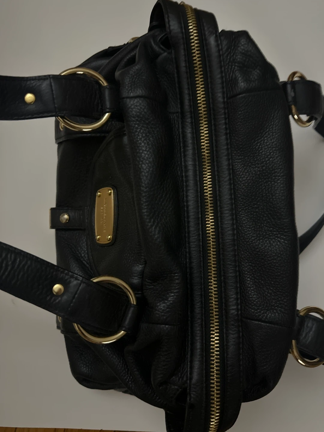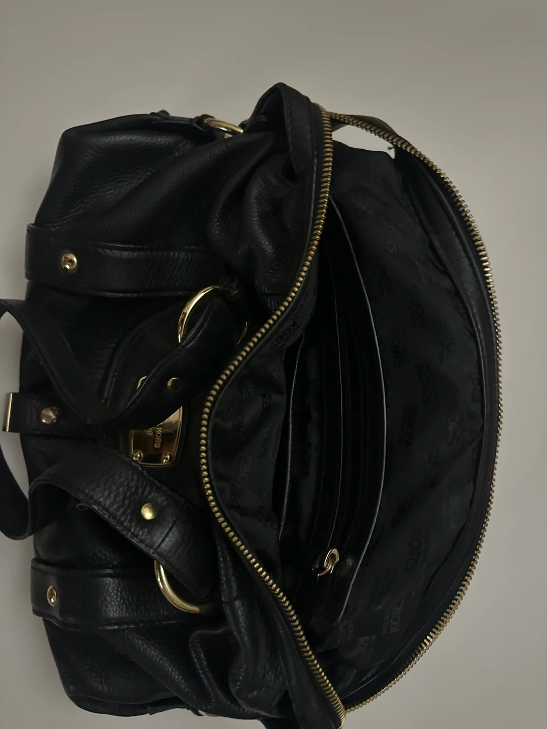 Genuine black leather satchel handbag by Michael Kors. It features gold-tone hardware and multiple interior pockets. Leather material with fabric lining.