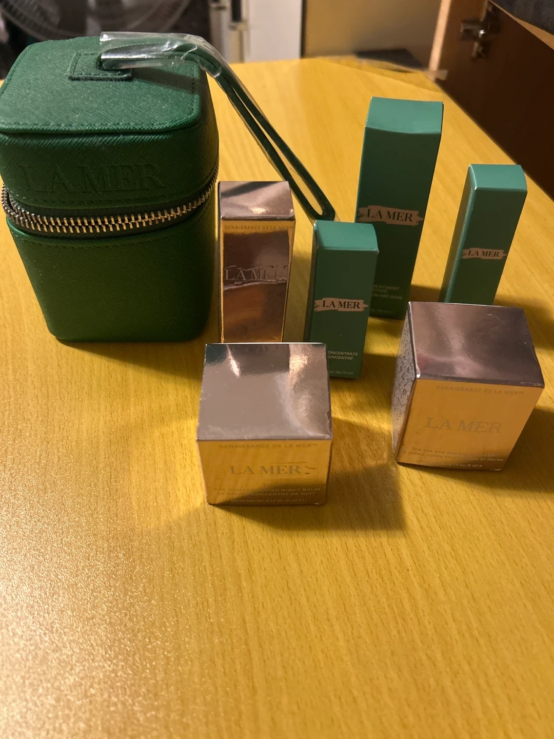 This set includes La Mer Concentrated Night Balm, Renaissance de la Mer, and a green La Mer travel pouch. It's a great collection for skincare enthusiasts.