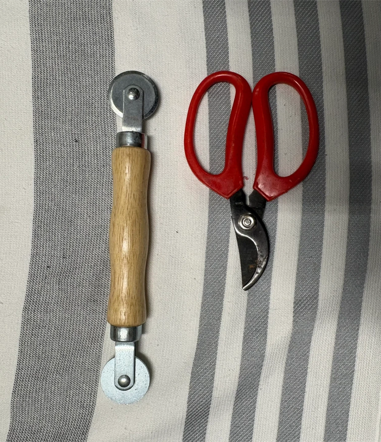 Includes: • 1 dual-wheel roller tool with wood handle • 1 pair of heavy-duty utility shears (red handle)