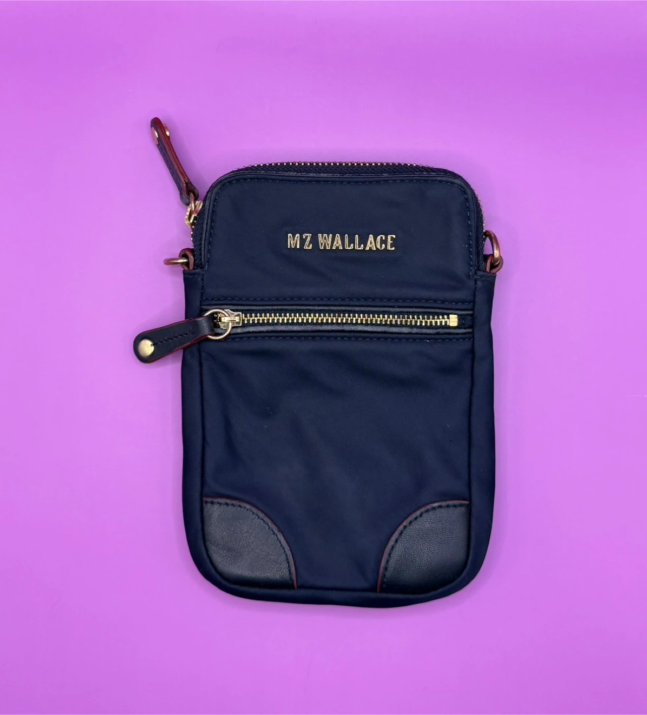This is an MZ Wallace navy crossbody bag. It's made of nylon with leather trim. Includes a detachable shoulder strap and a gold-tone chain strap.