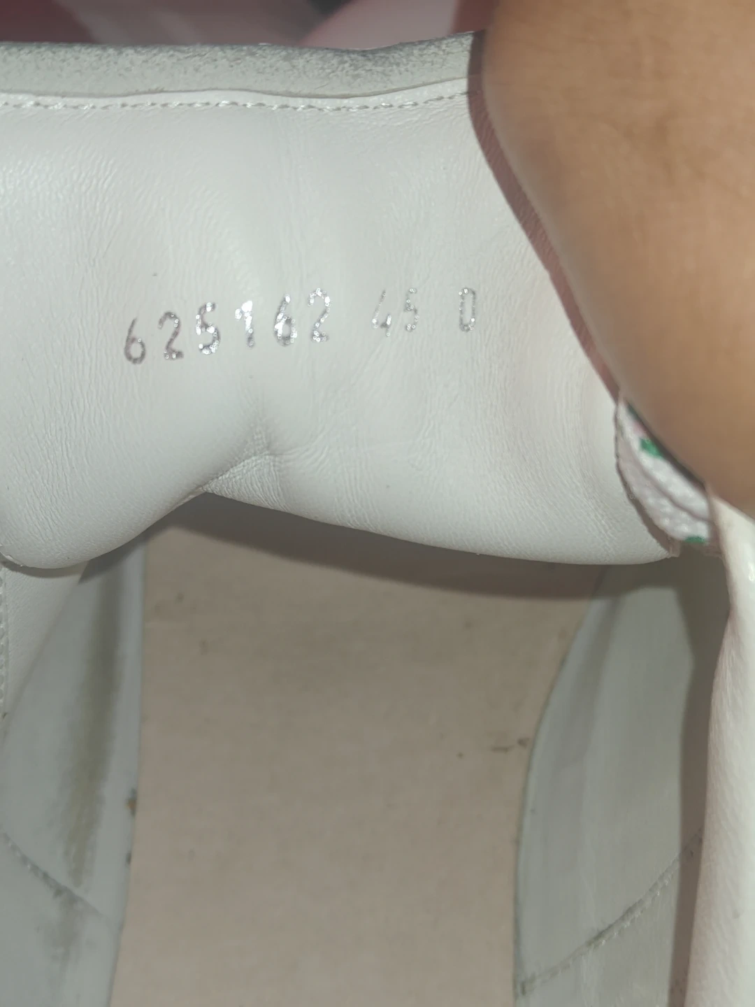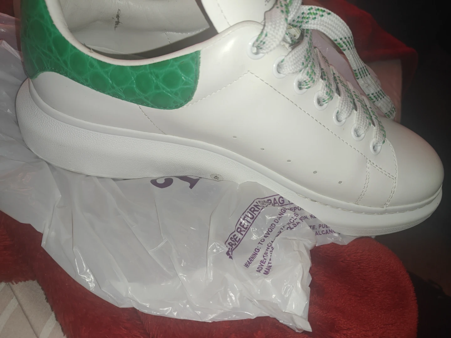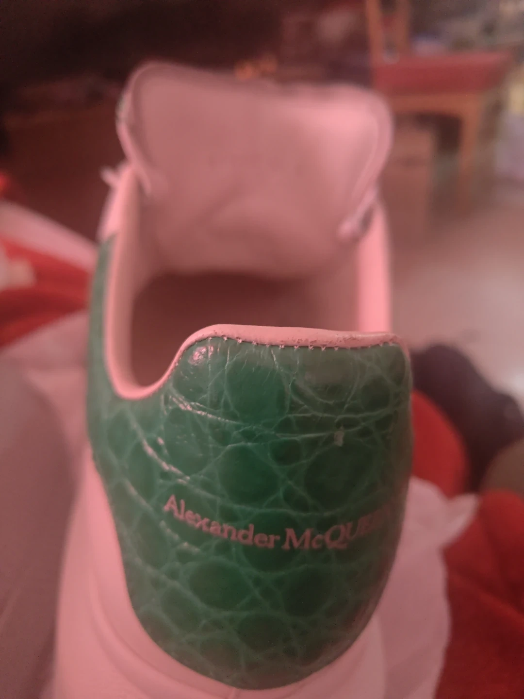 White leather sneakers with green crocodile embossed heel tab and laces. Features the Alexander McQueen logo on the heel. Size 45.