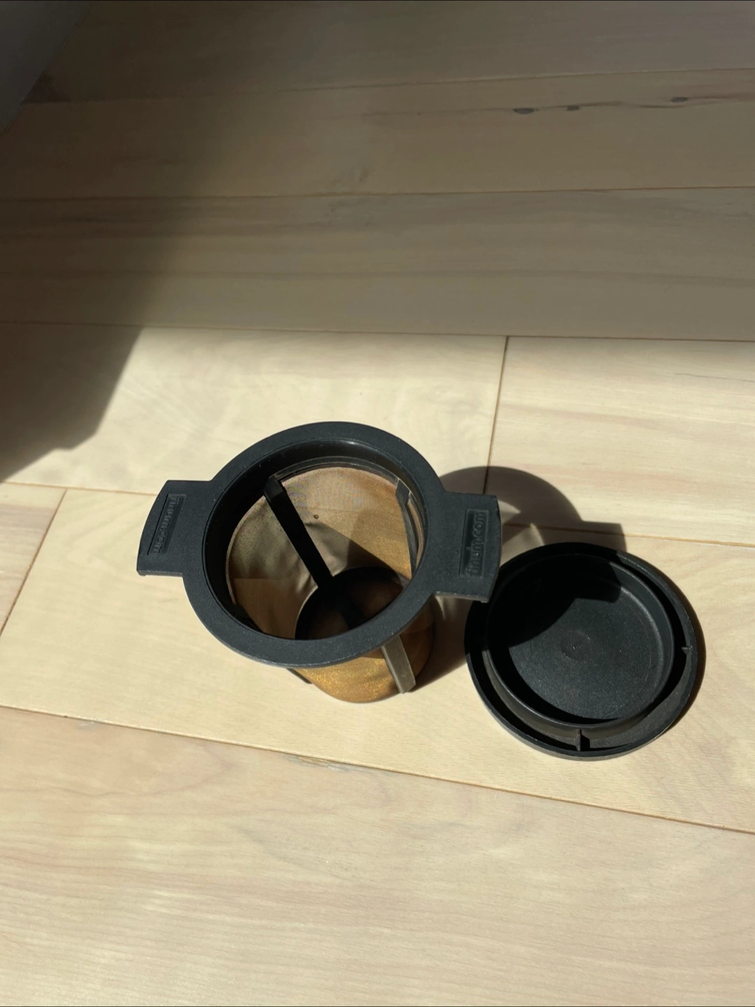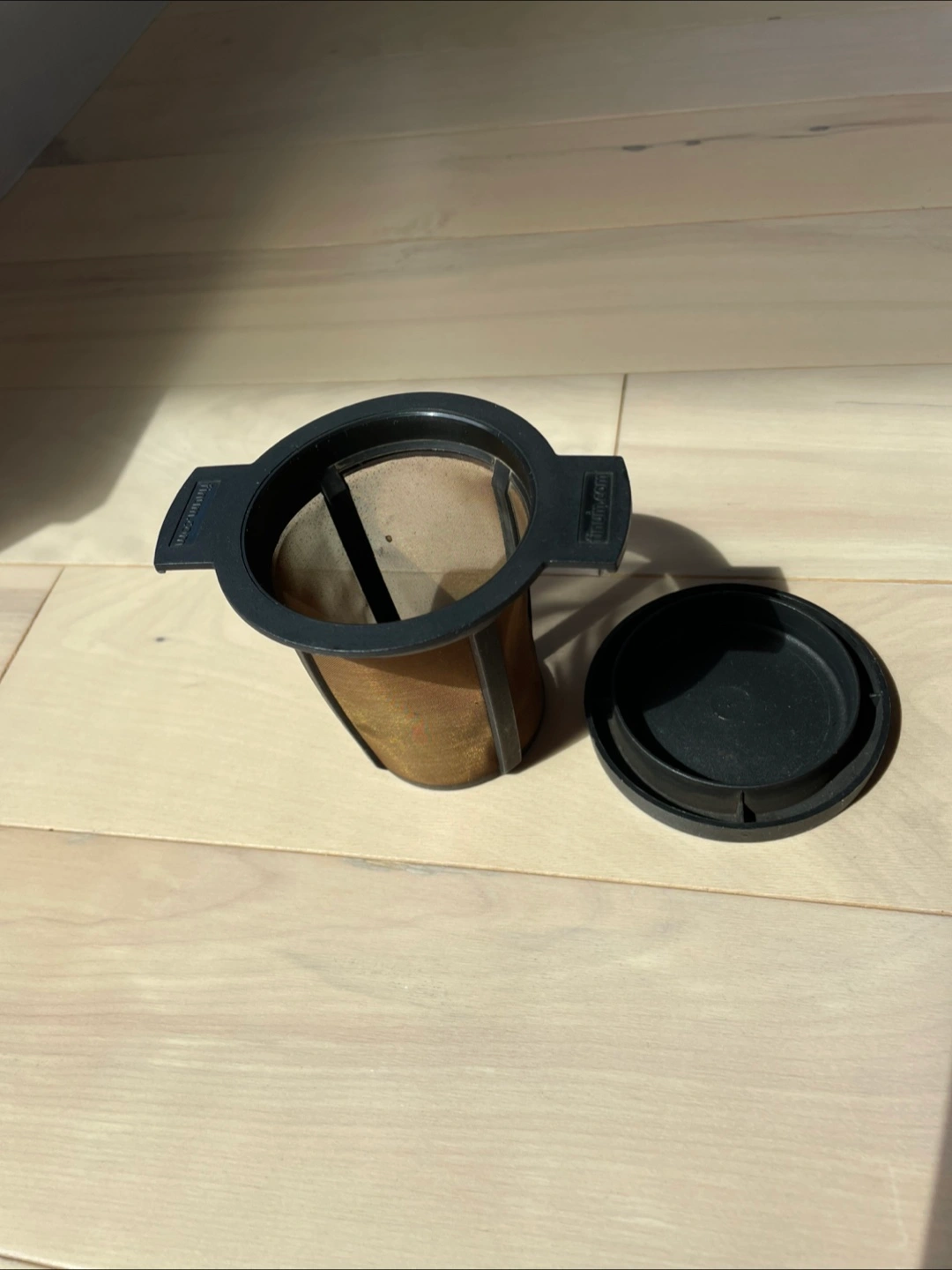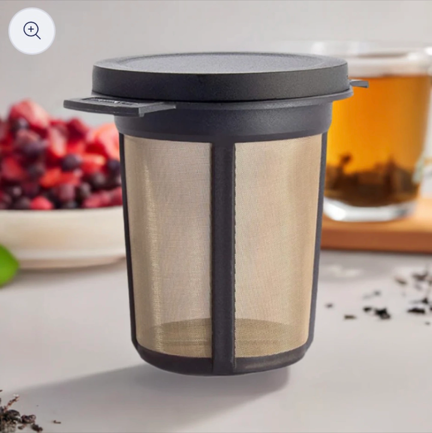 Reusable tea infuser. Black plastic with a fine mesh filter. Includes a lid. Made in Germany.