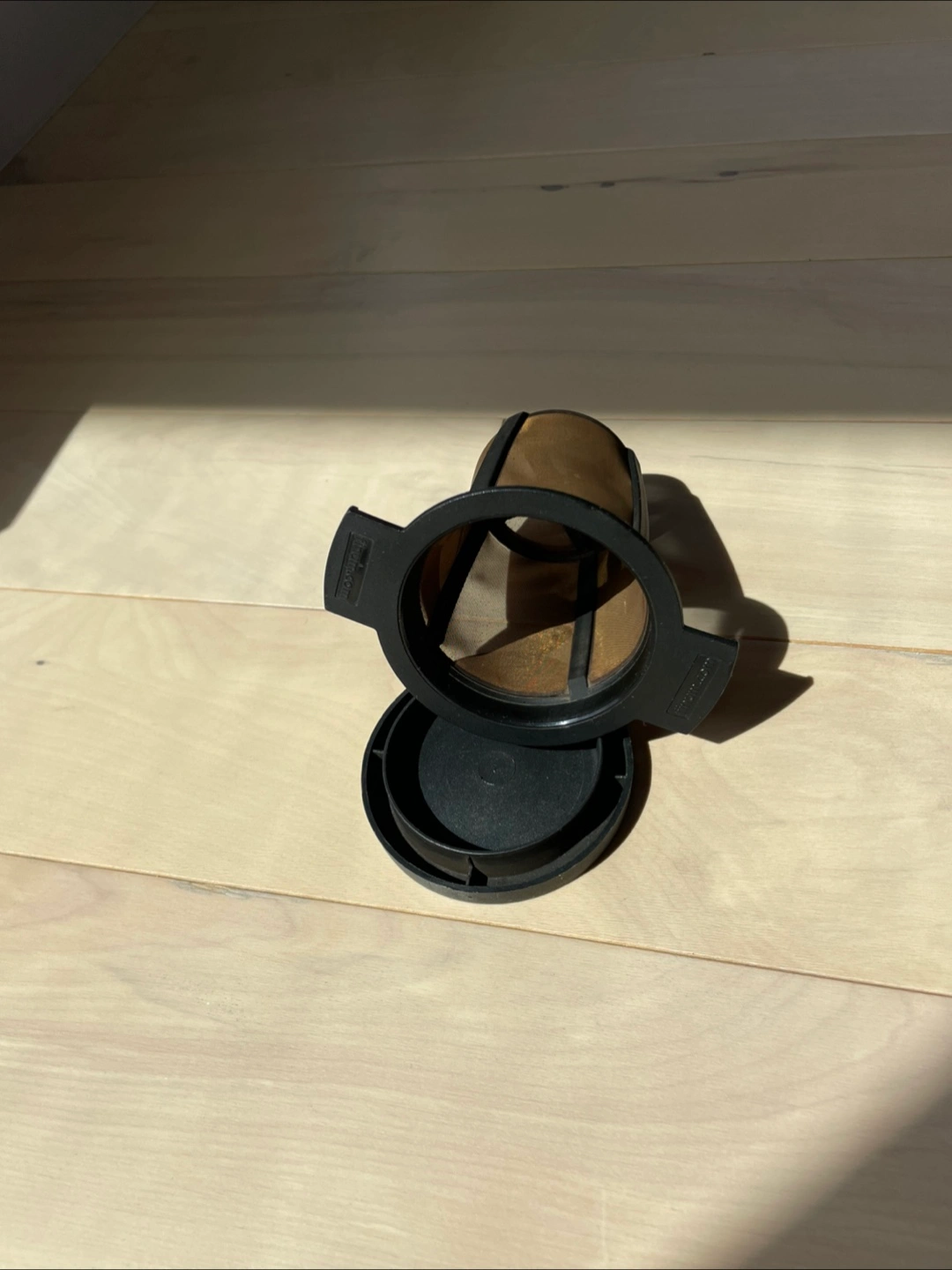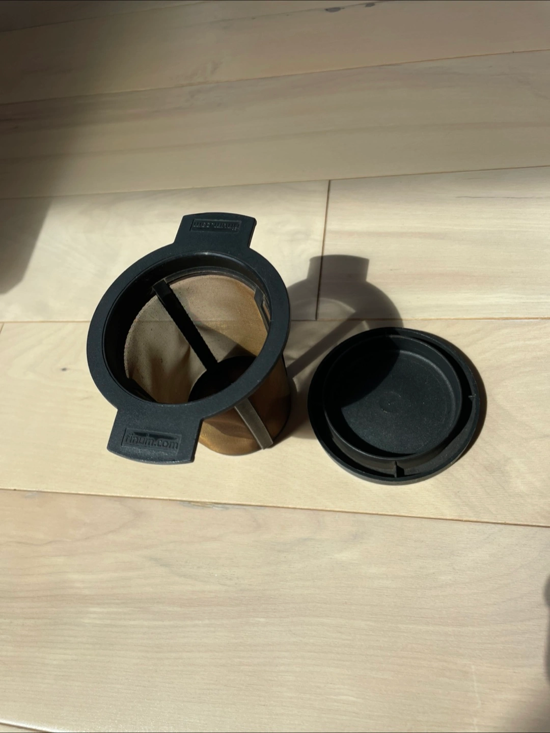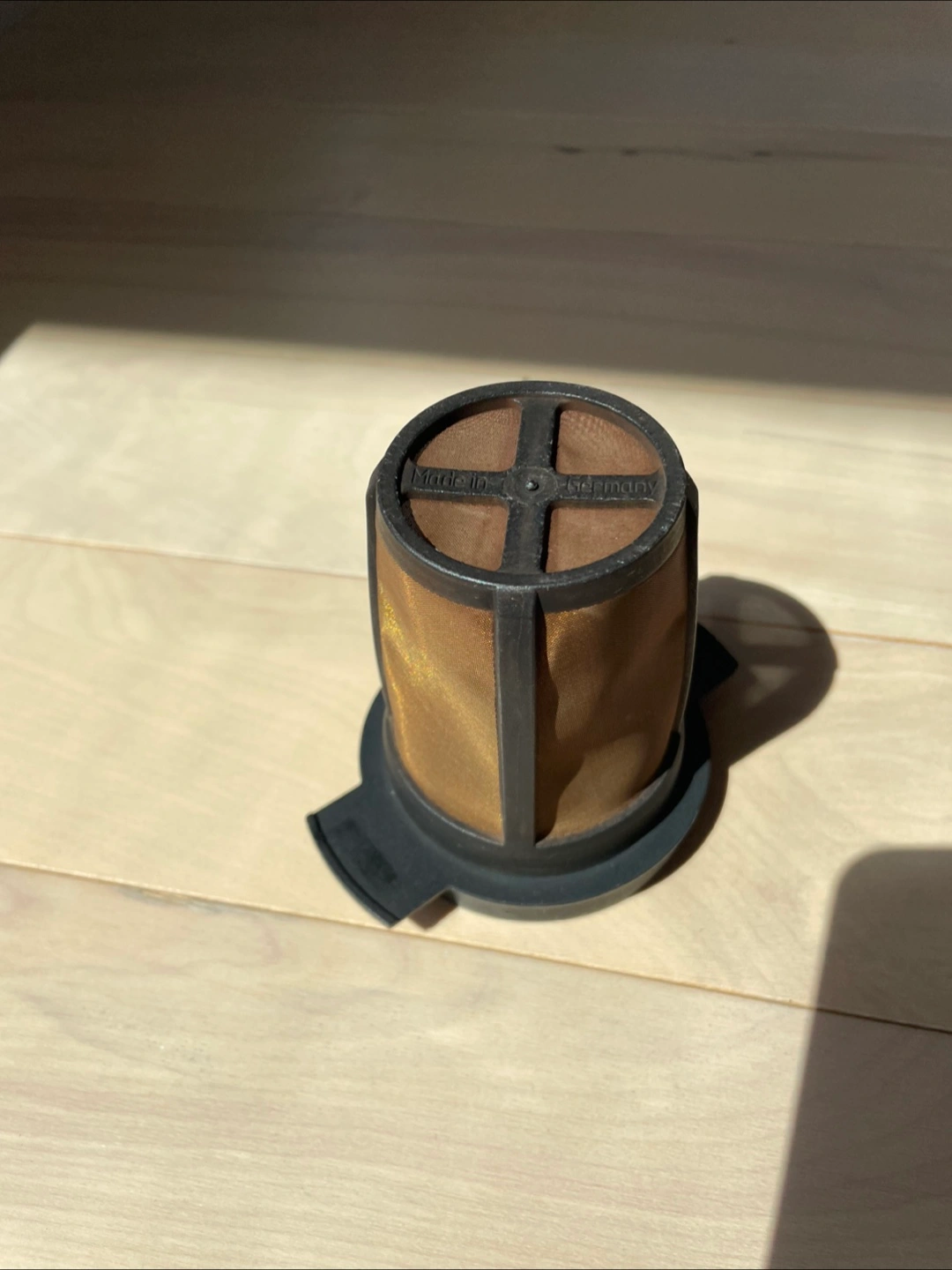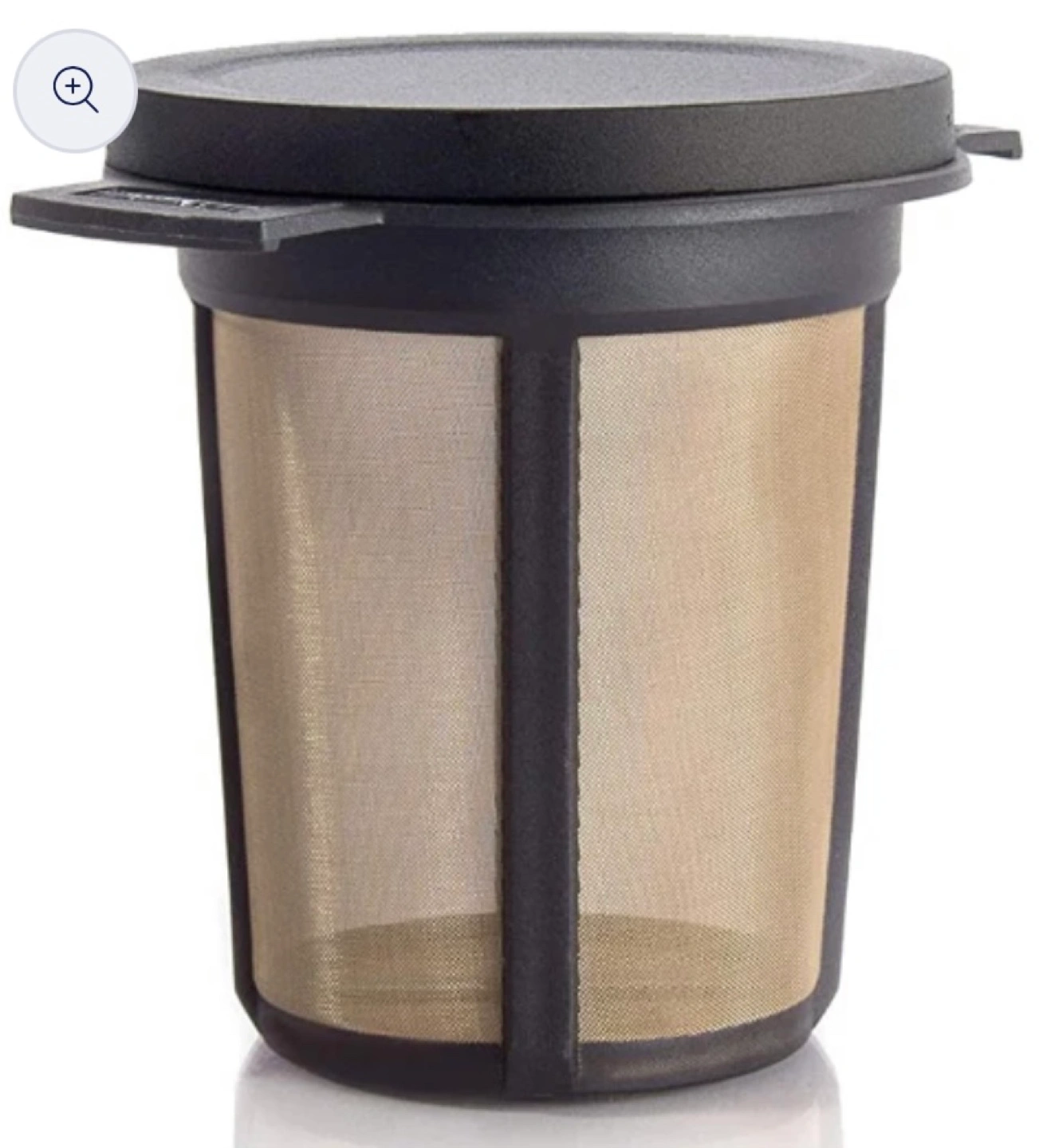 Reusable tea infuser. Black plastic with a fine mesh filter. Includes a lid. Made in Germany.