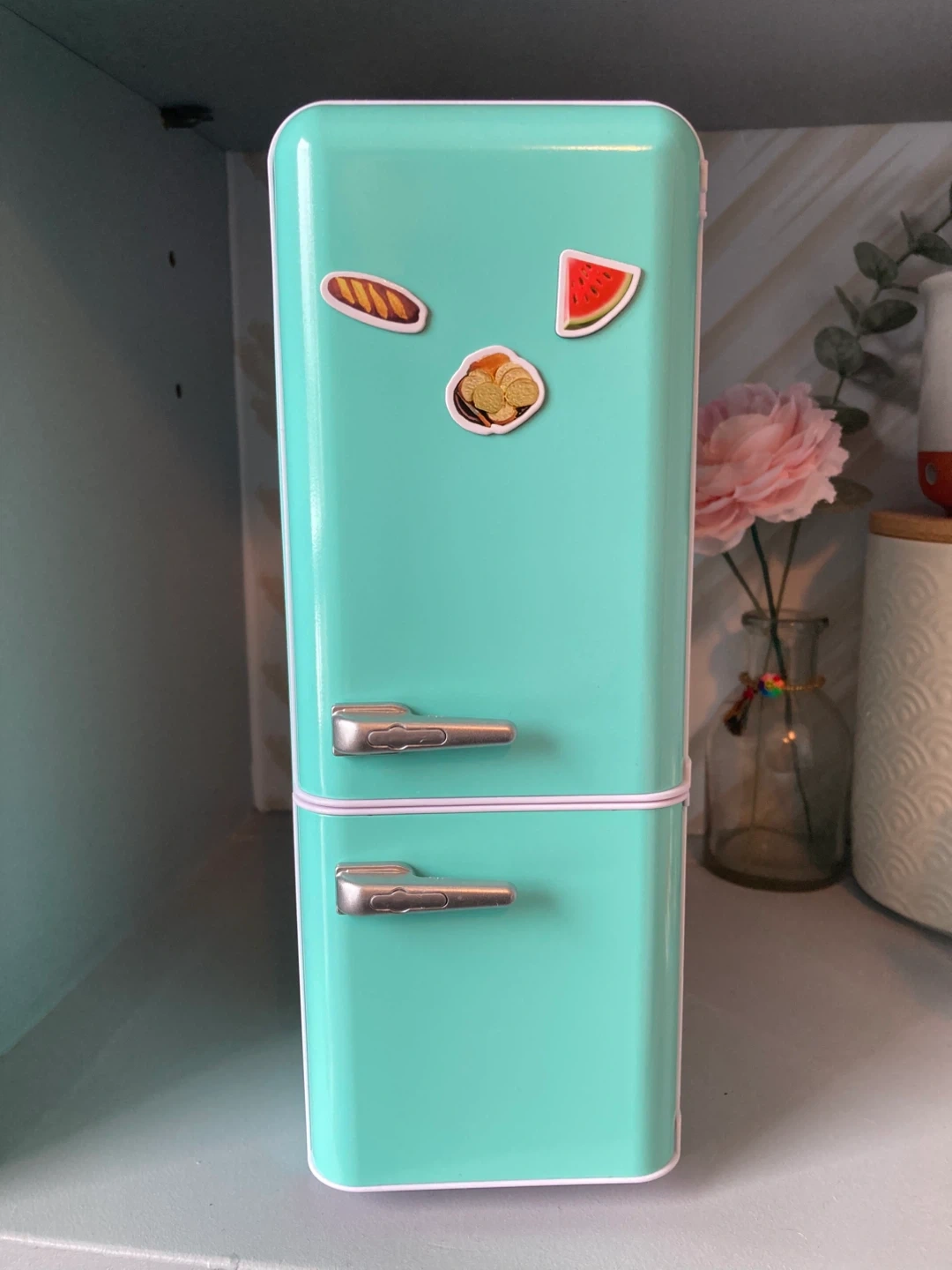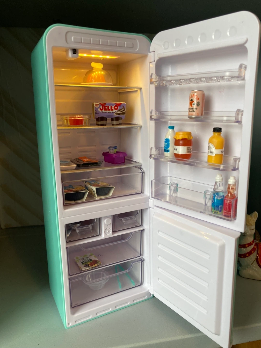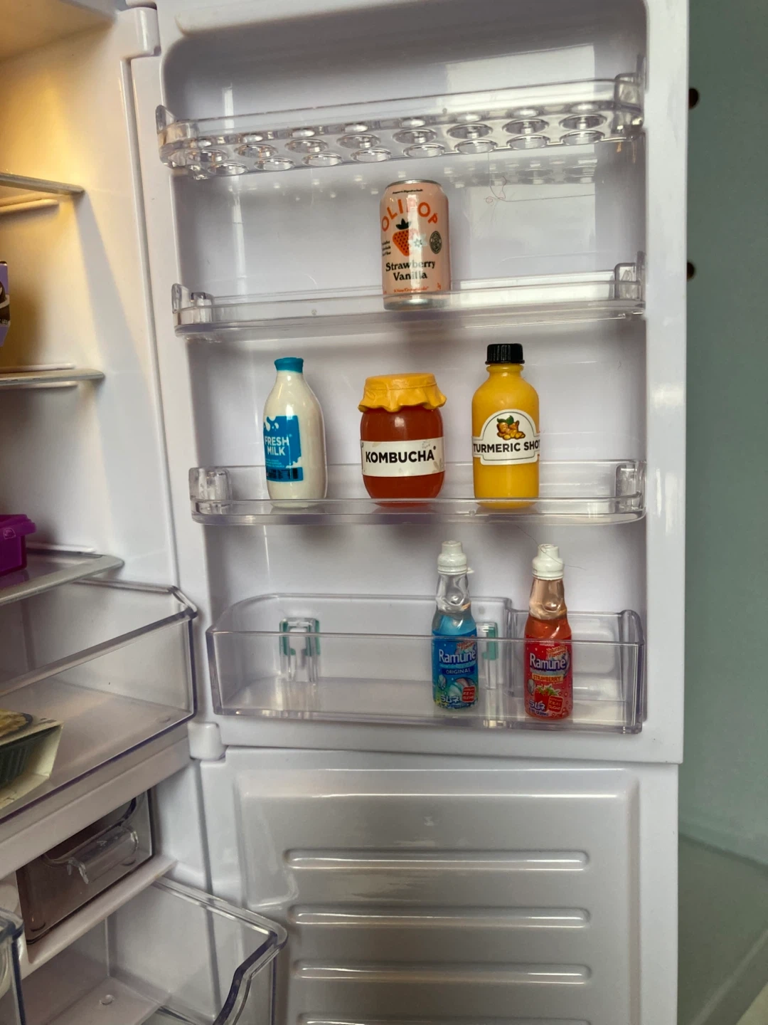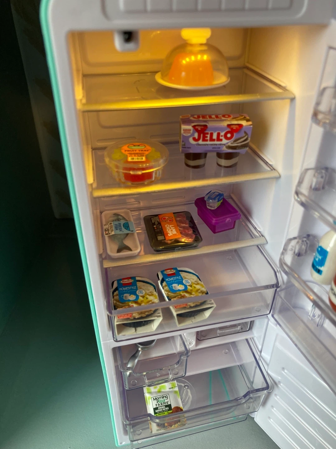 Toy fridge and mini food figurines
