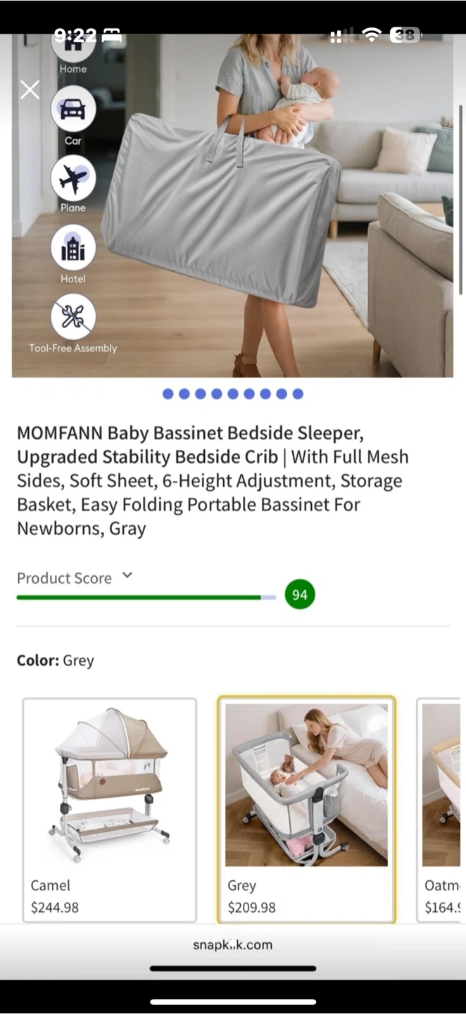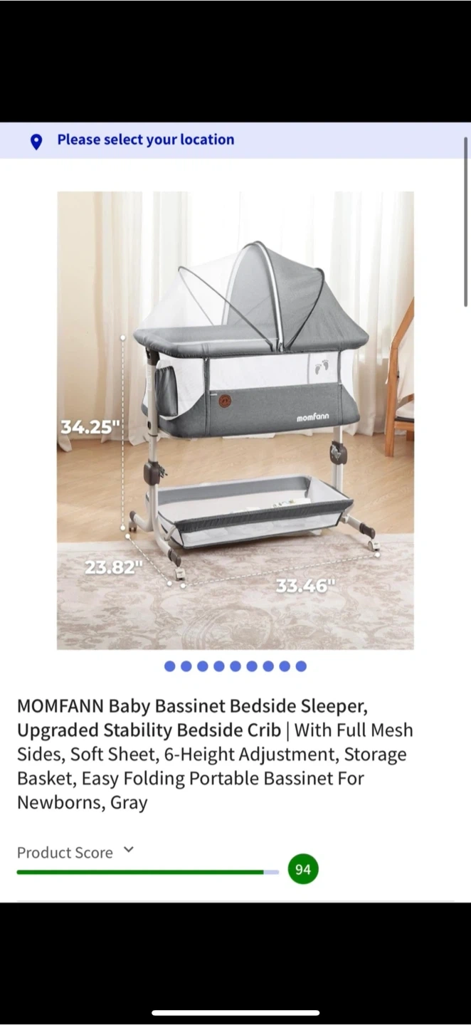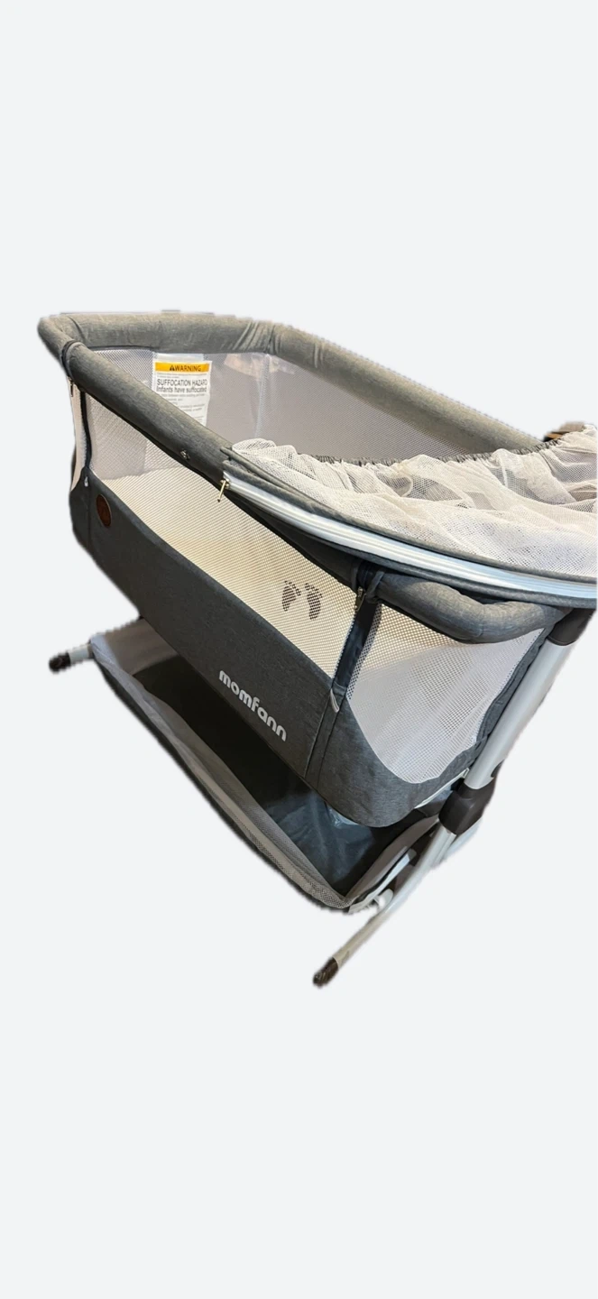 This MOMFANN bedside sleeper is designed for newborns. It's gray and features full mesh sides for ventilation. The bassinet offers a 6-height adjustment and includes a storage basket. It's also easy to fold and portable.
