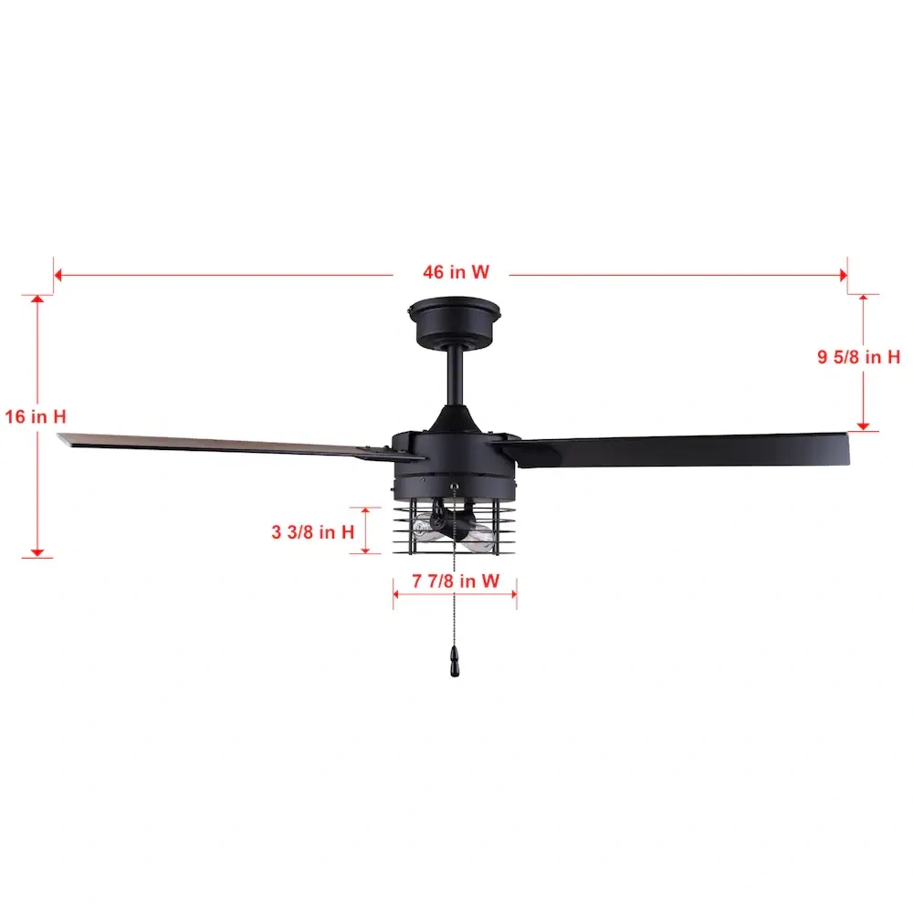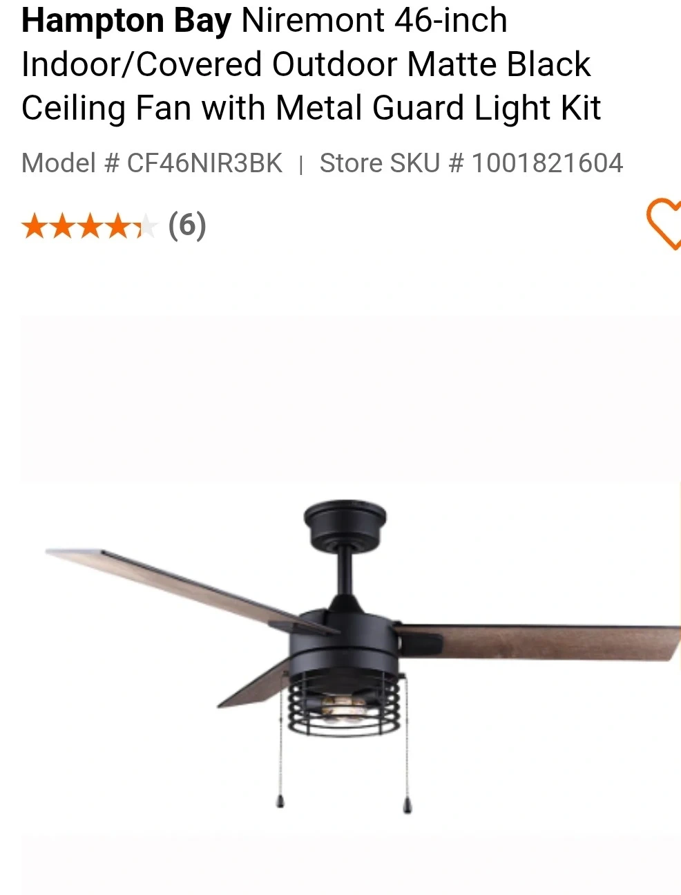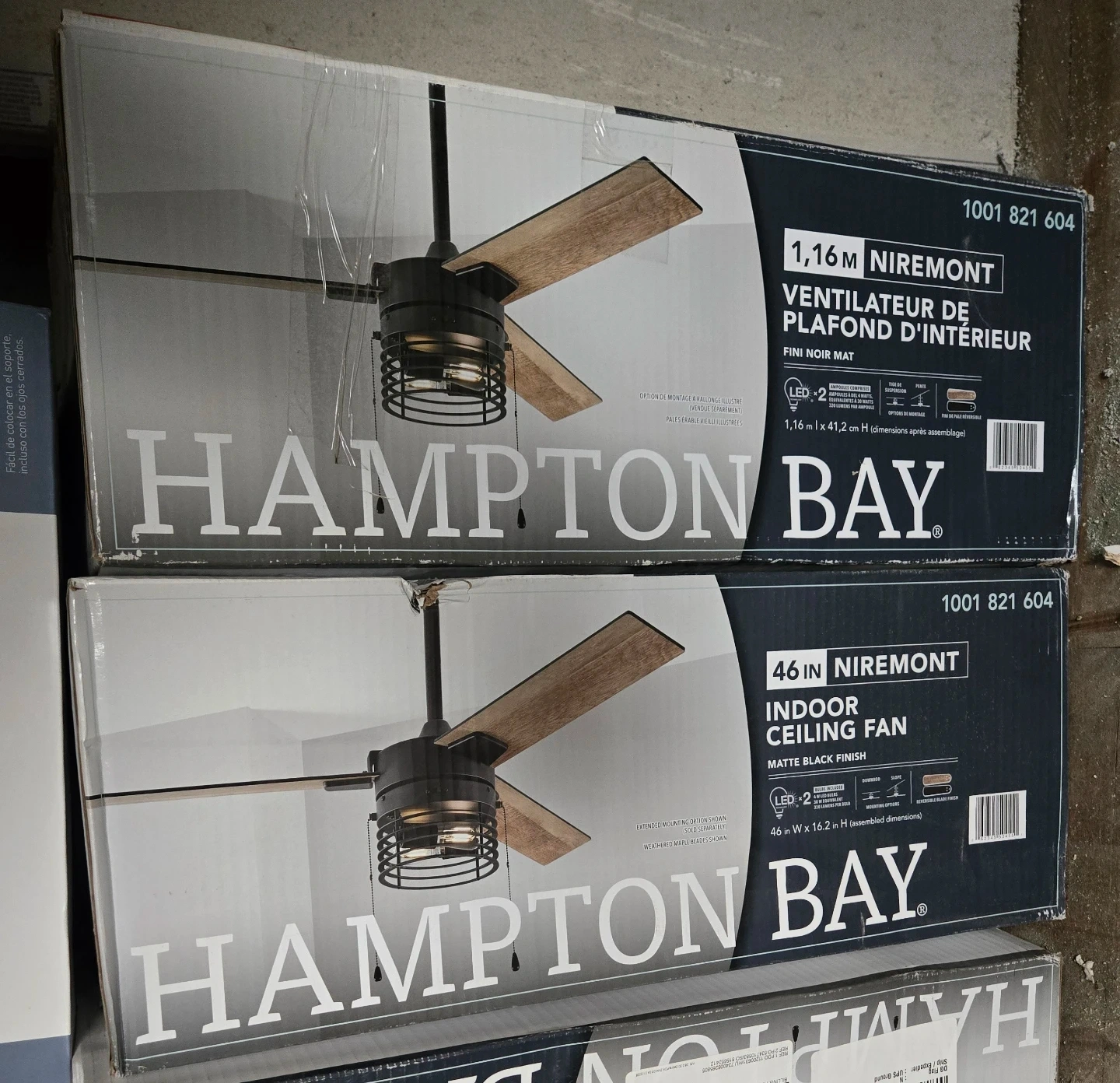 This is a Hampton Bay Niremont 46-inch indoor ceiling fan. It's a matte black finish with metal guard light kit. The fan has a 46-inch blade span.