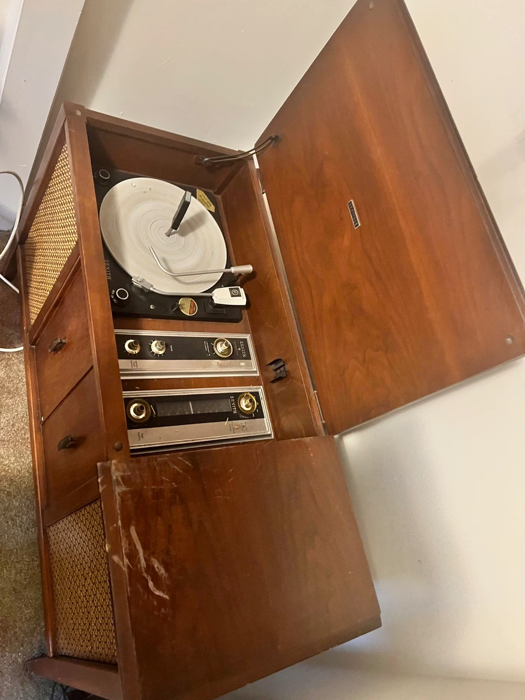Selling a vintage Zenith record player console. It features a classic design with a wooden cabinet. The console includes a record player and radio components. Great for collectors or anyone looking to add a retro touch to their home!