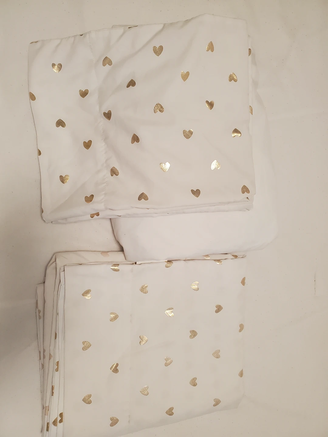 They are in decent shape, but we have a queen size now. The topsheet and pillowcases have little platinum colored hearts whereas the fitted sheet is solid white.