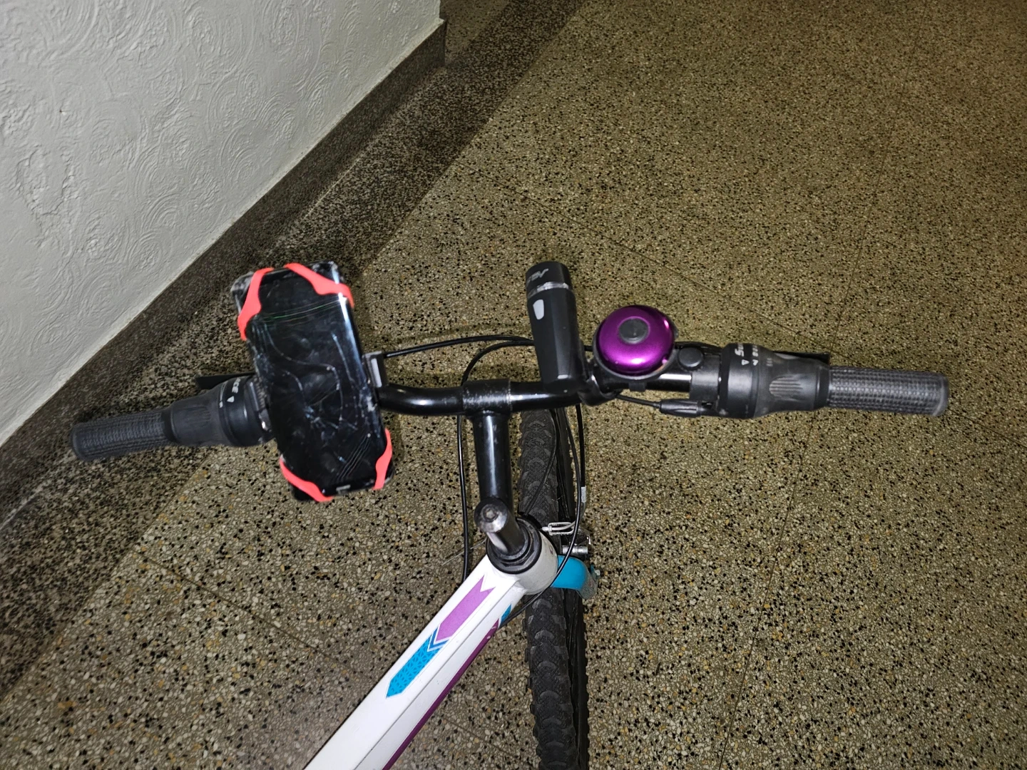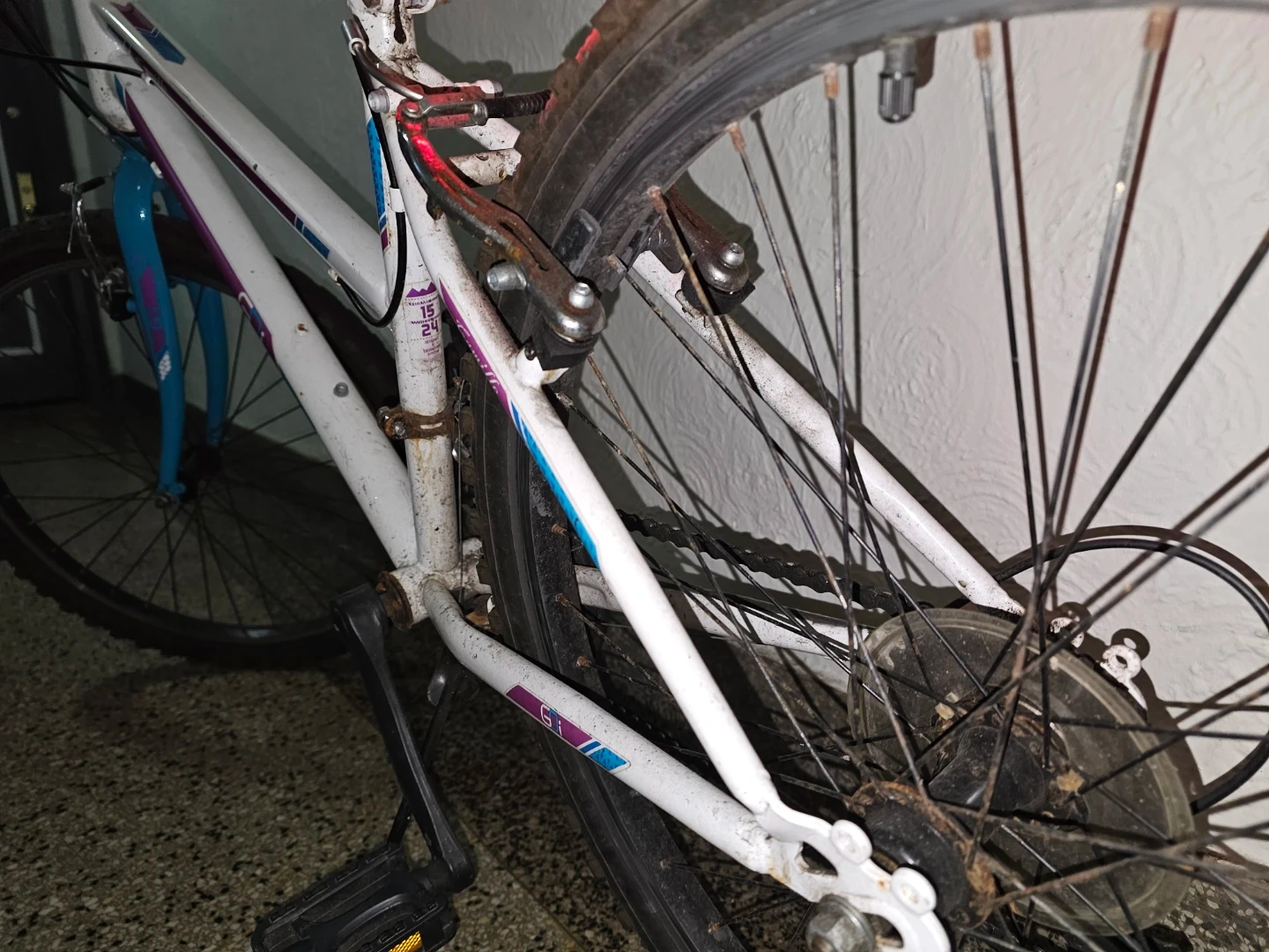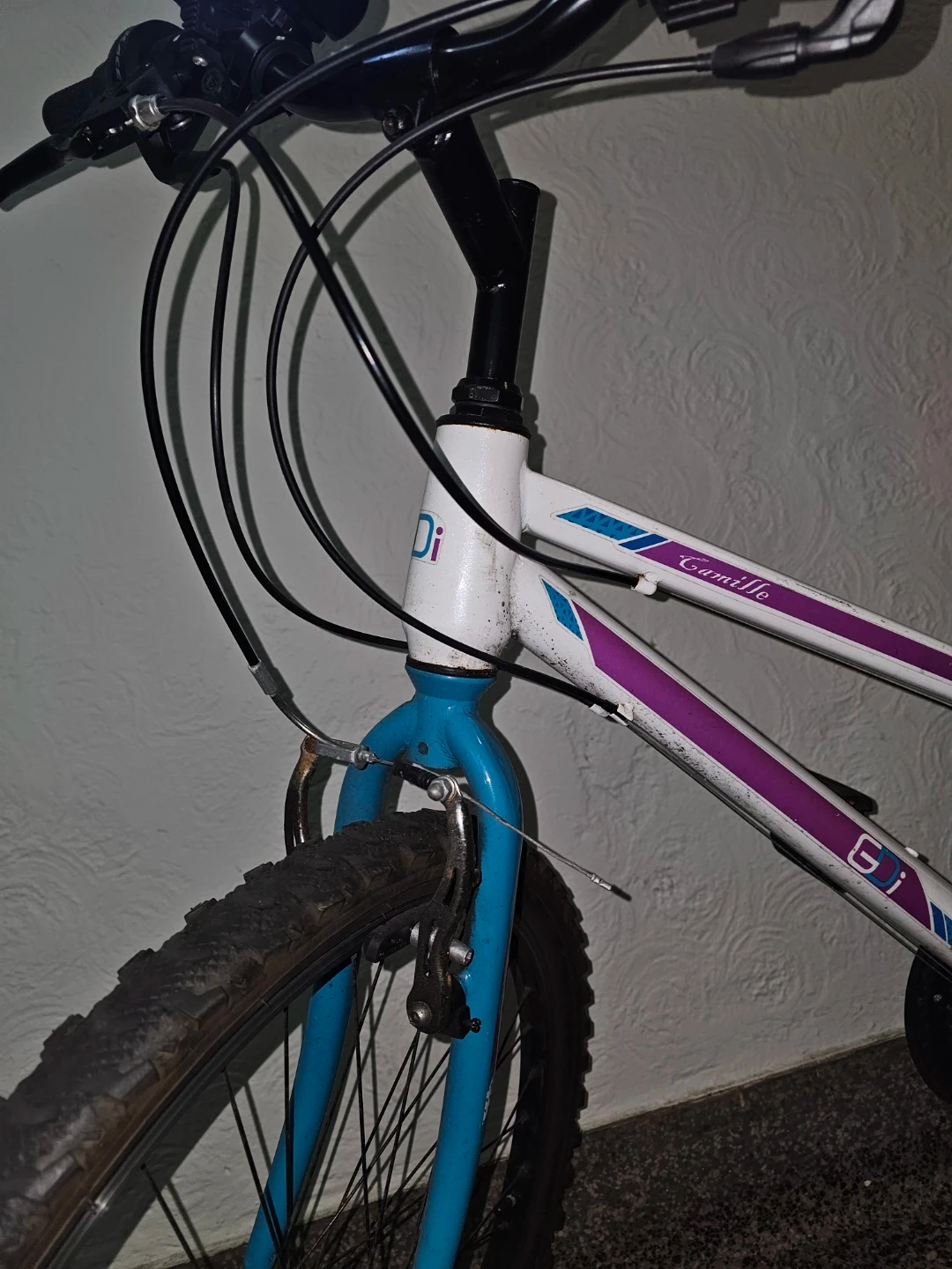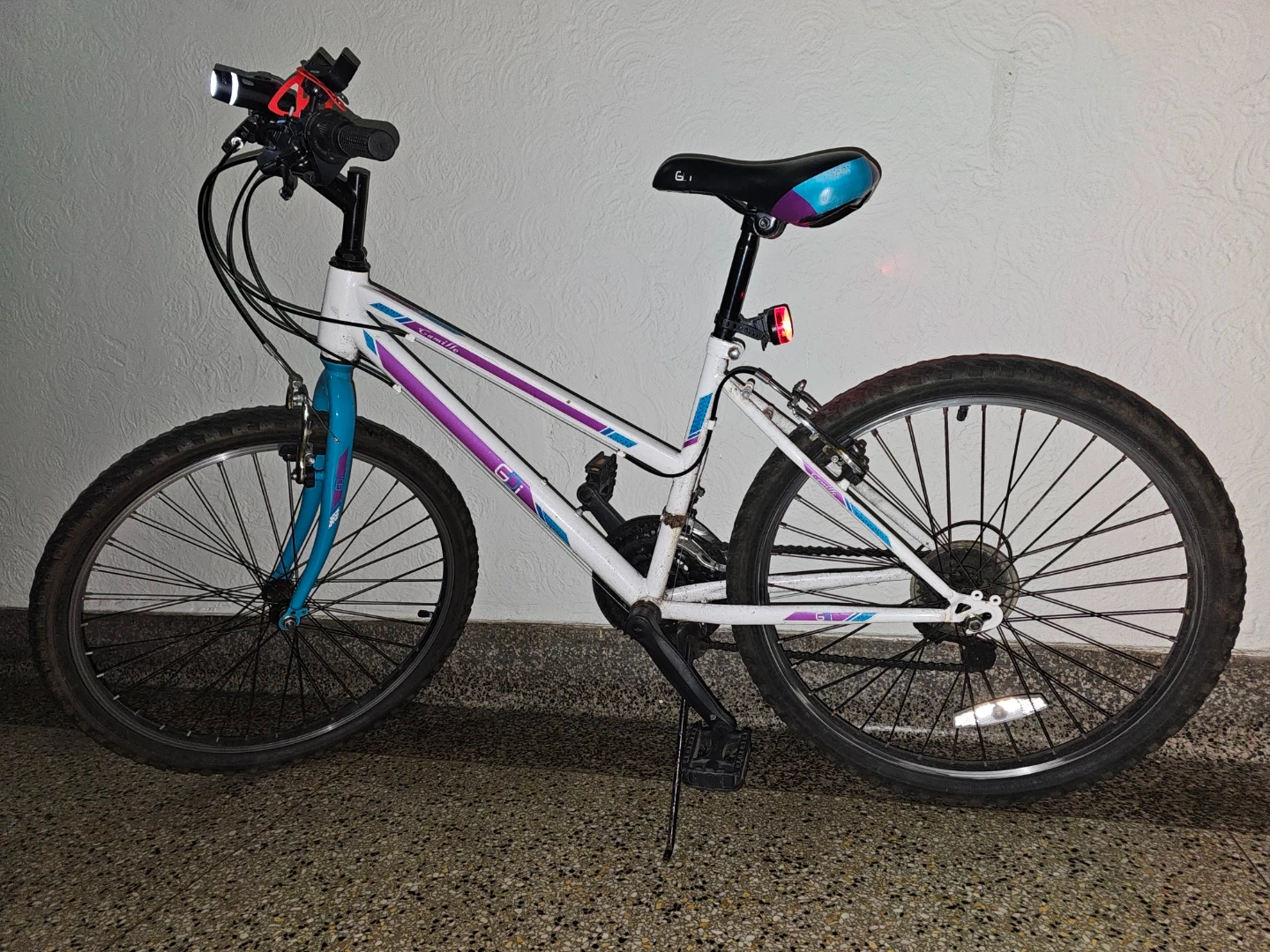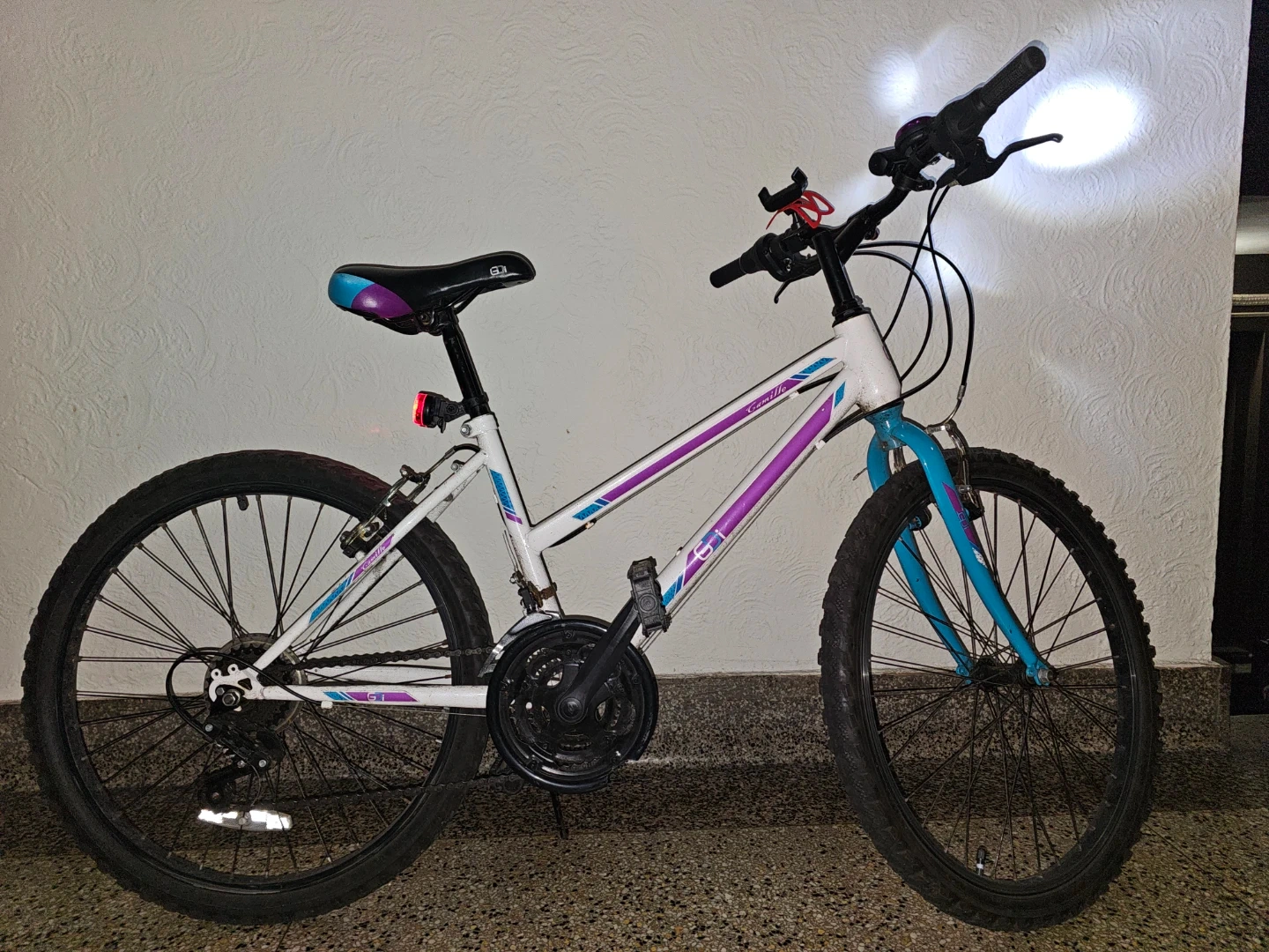 This is a GT Camille women's mountain bike. It has a white frame with purple and blue accents. The bike is equipped with front and rear reflectors, and a bell. It also includes a phone mount on the handlebars. It's been used regularly (during the warm seasons) in Brooklyn for 4 years, it's well maintained, features three front chainrings (3 speeds) combined with a seven-speed rear cassette or freewheel. I bought it brand new for $200. Chain and lock included.