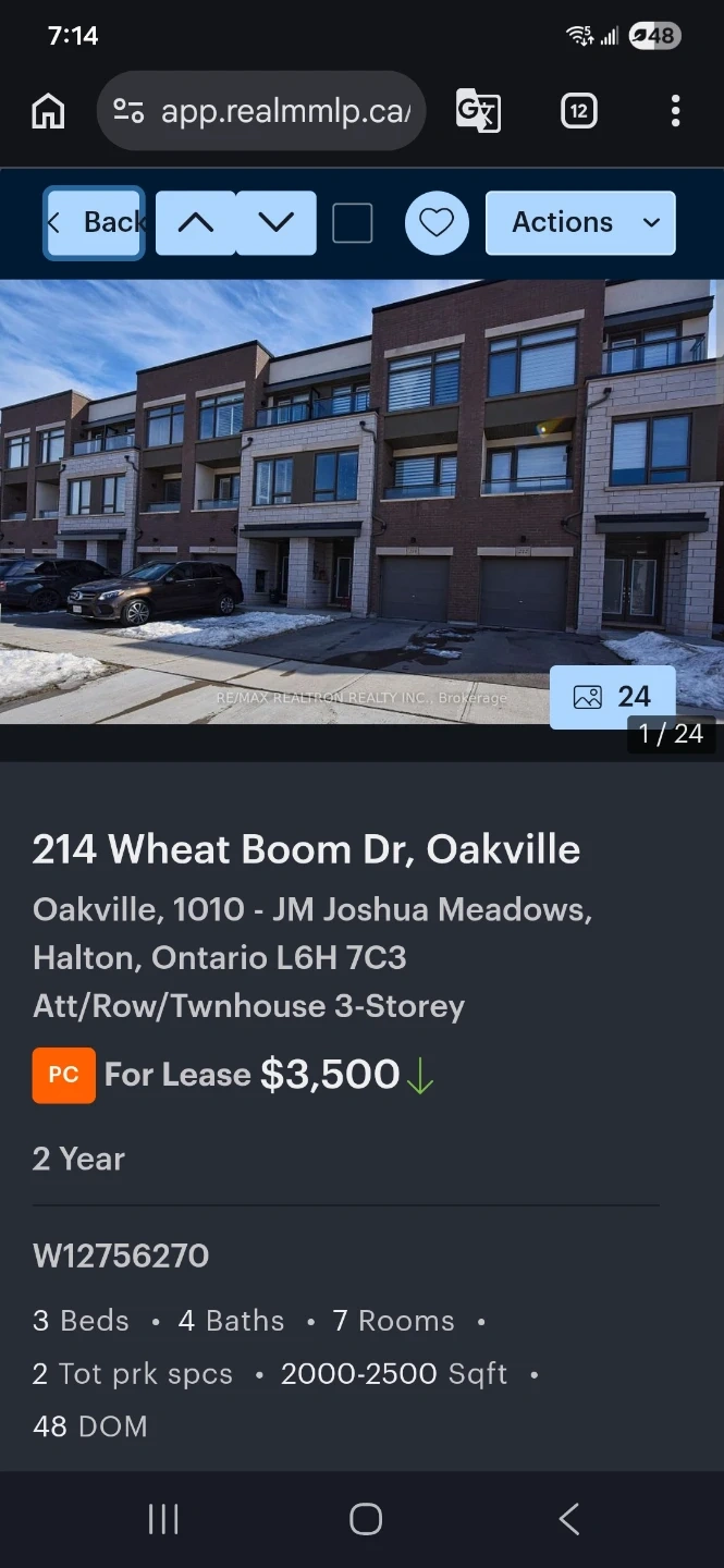 Att/Row townhouse located at 214 Wheat Boom Dr in Oakville. It features 3 beds, 4 baths, and 7 rooms. The square footage ranges from 2000-2500 sqft with 2 dedicated parking spaces. This property offers a 2-year lease term.