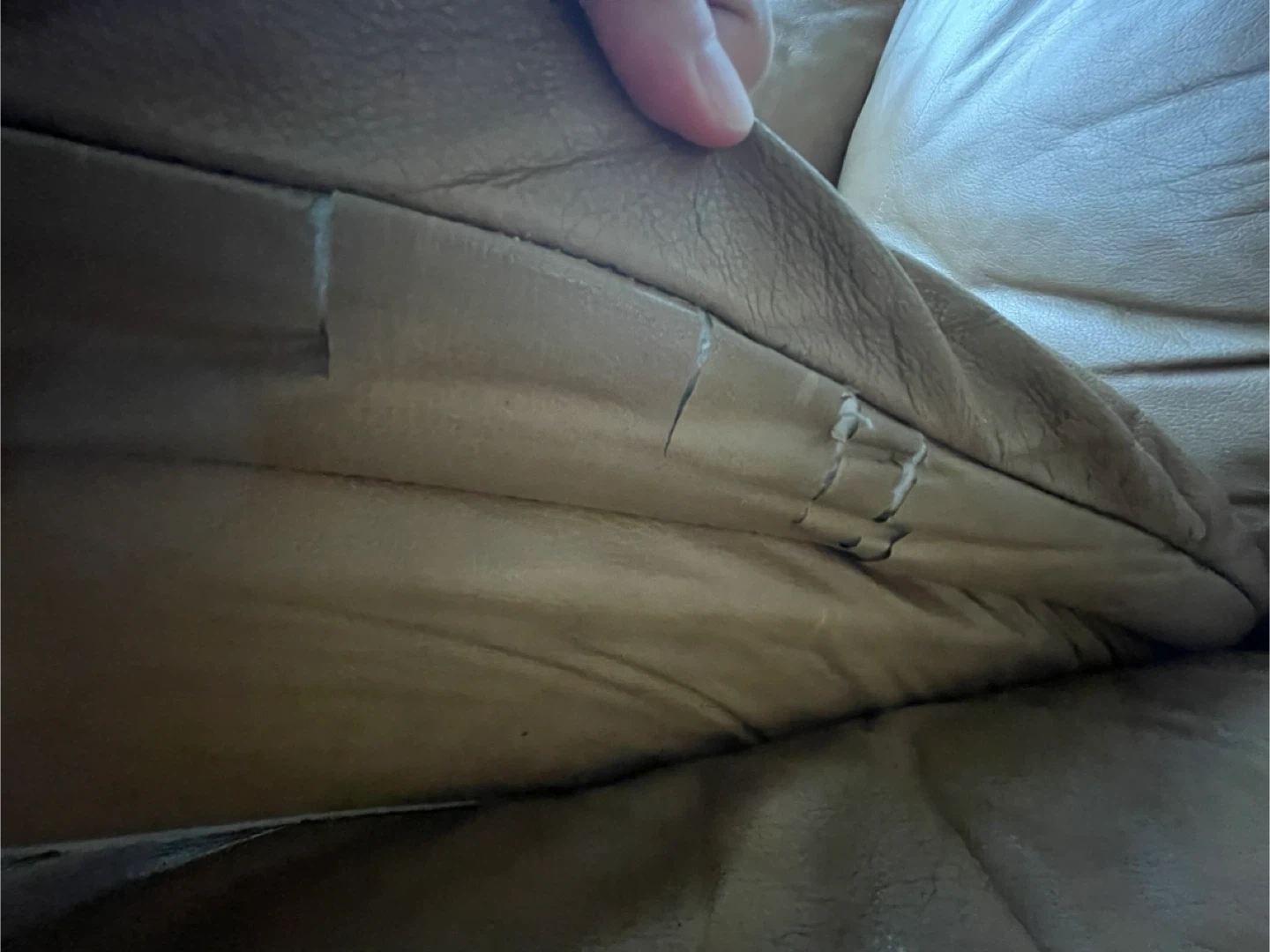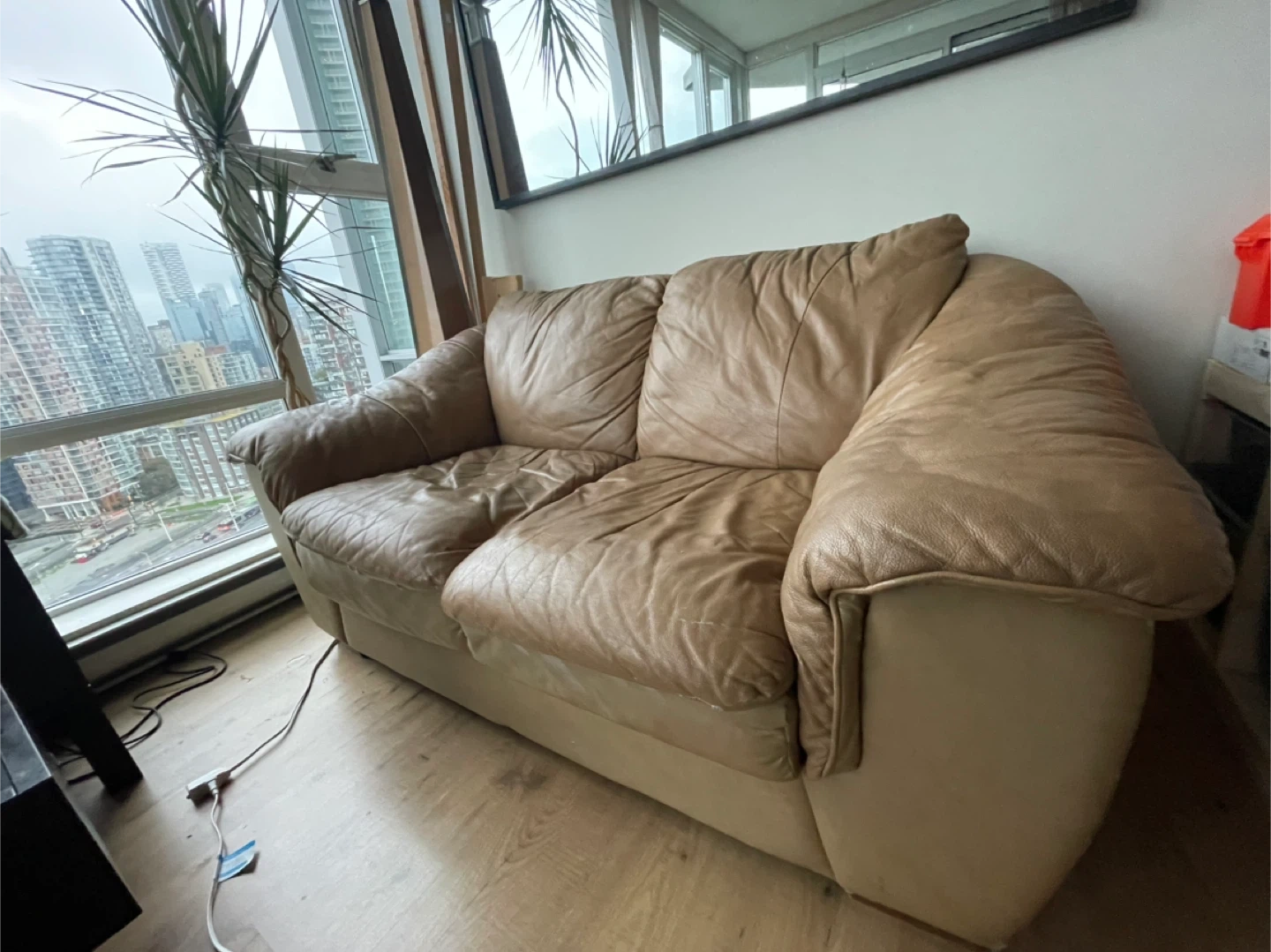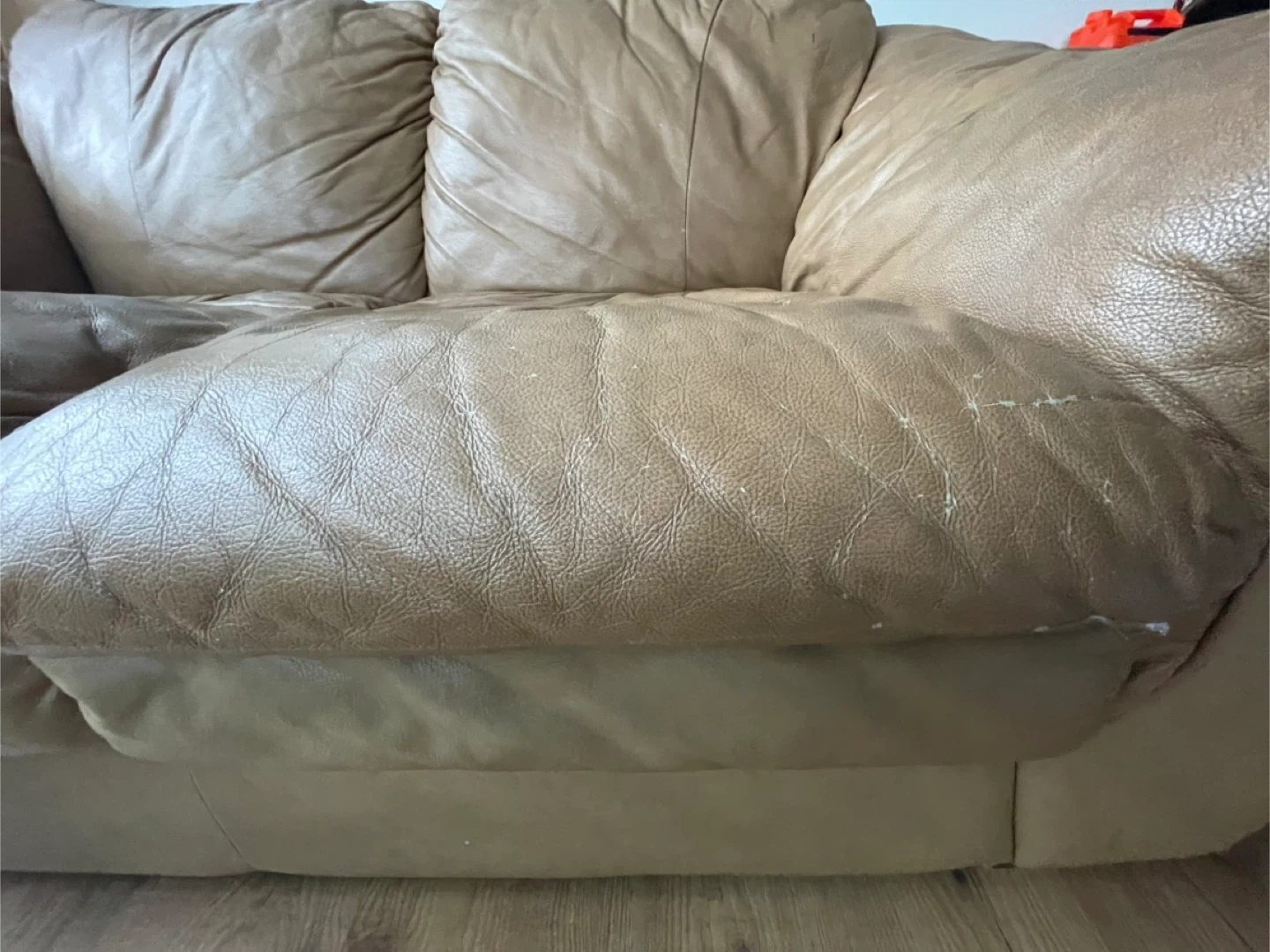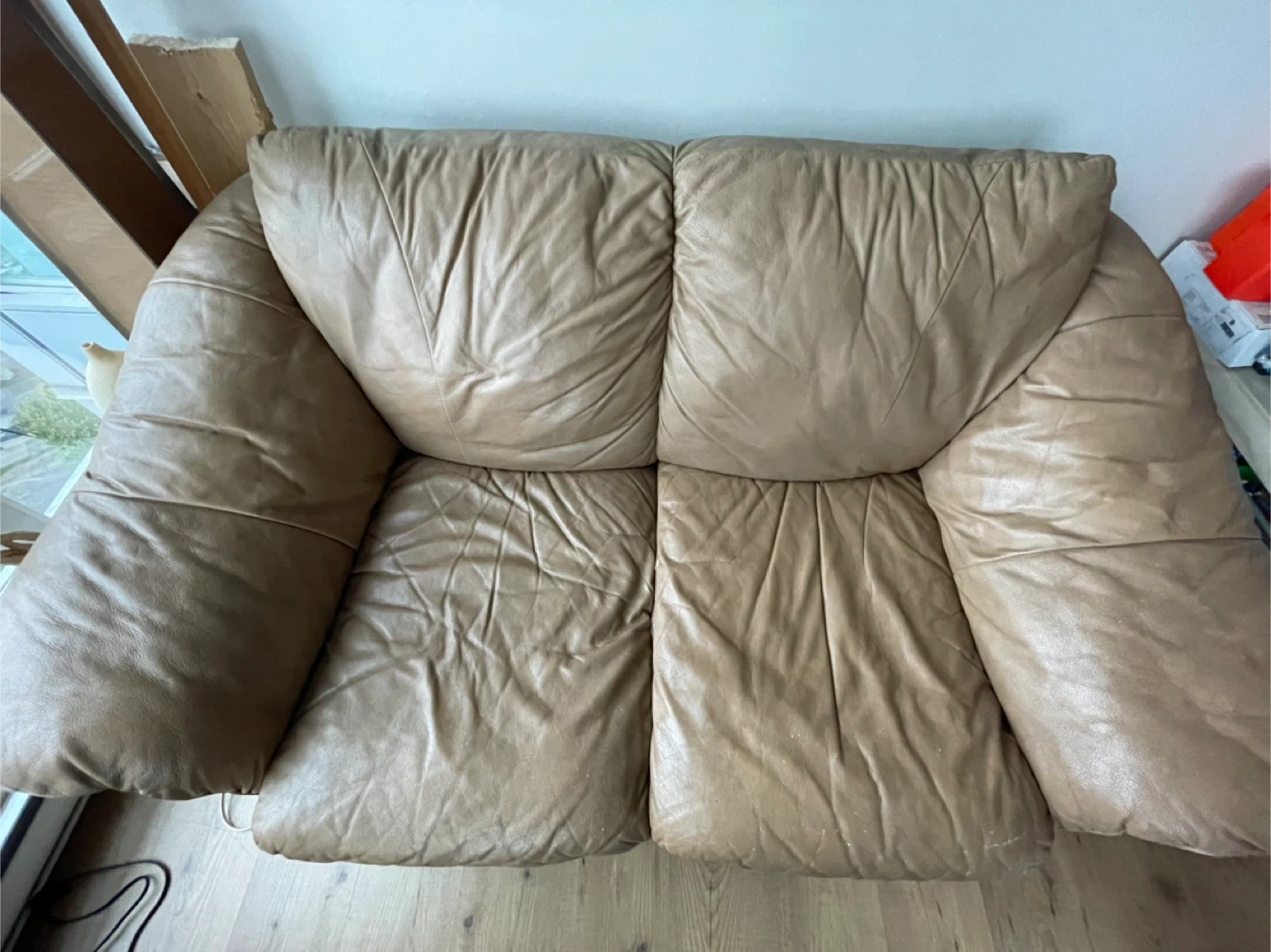 Selling a used two-seater sofa. It's beige and made of leather/. There are some signs of wear and tear, including some visible cracking and damage to the leather, as shown in the pictures. Still has lots of life left!
