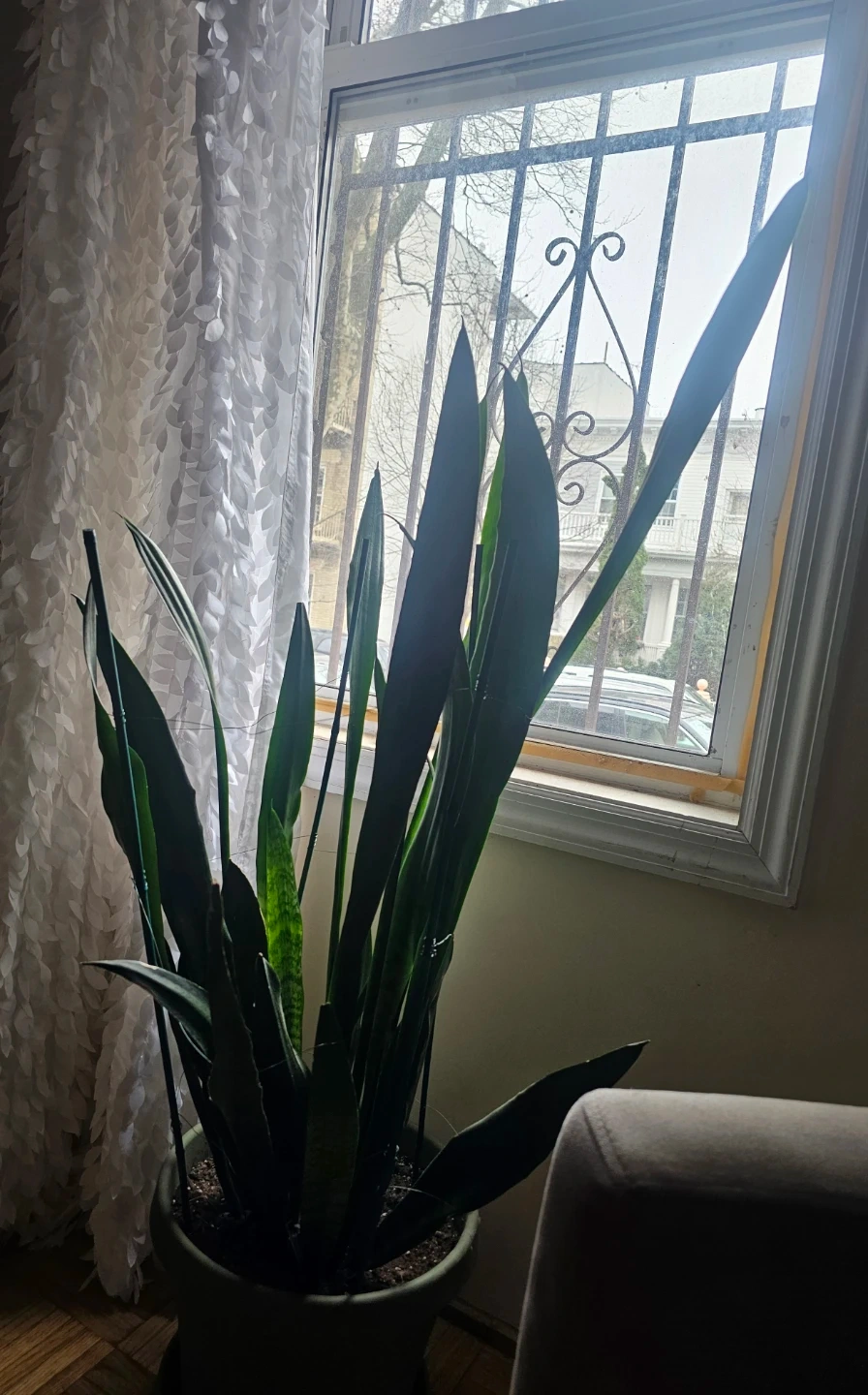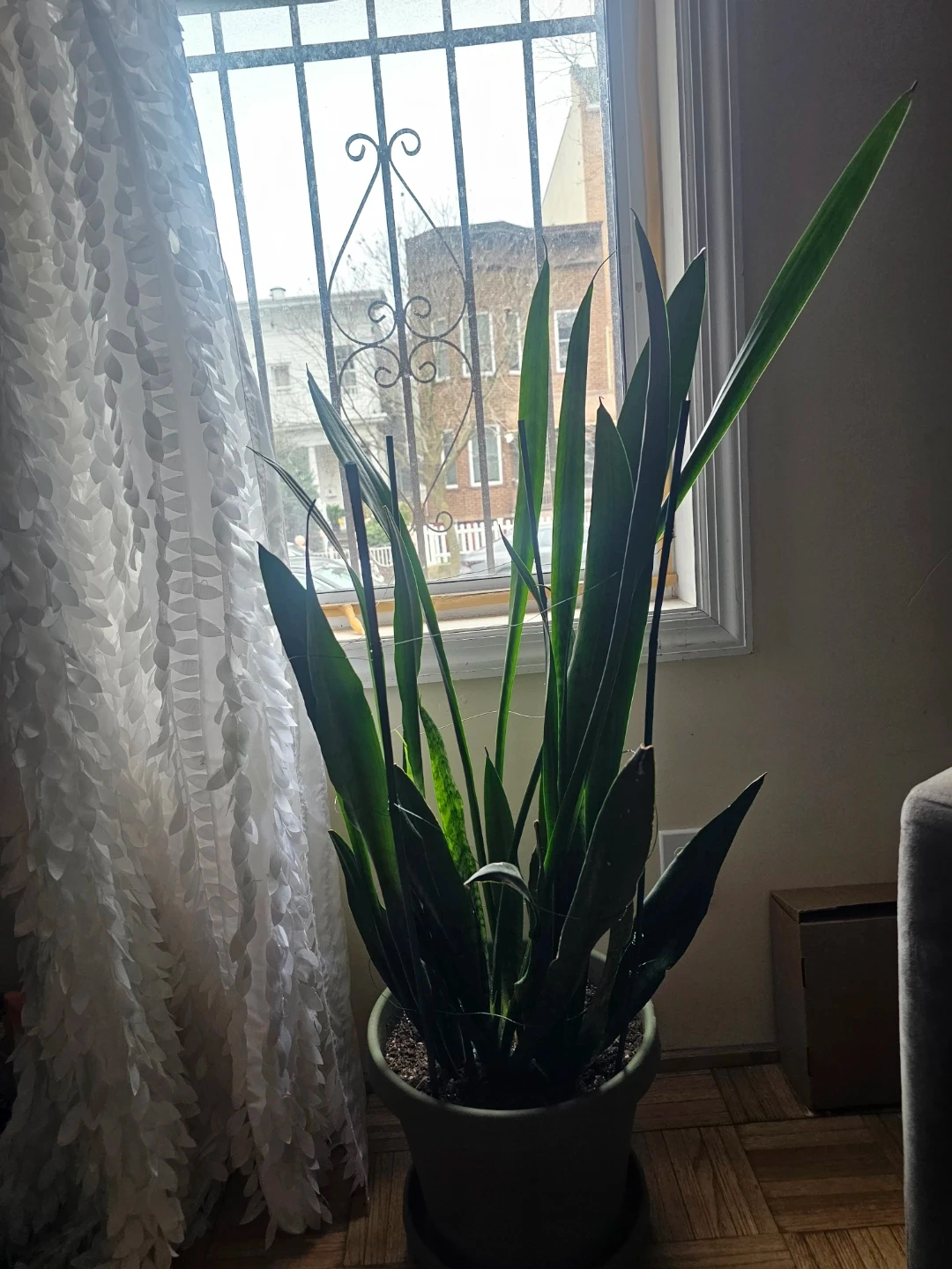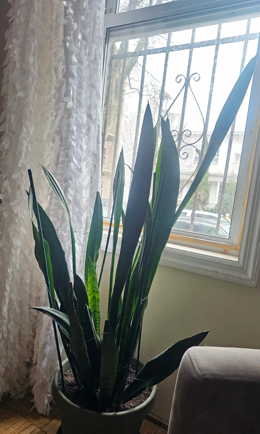 This is a tall snake plant with long, green leaves. It's potted in a round, light green planter. This plant is known for its air-purifying qualities. It's a low-maintenance option for your home or office!